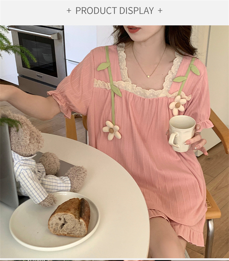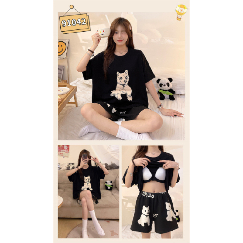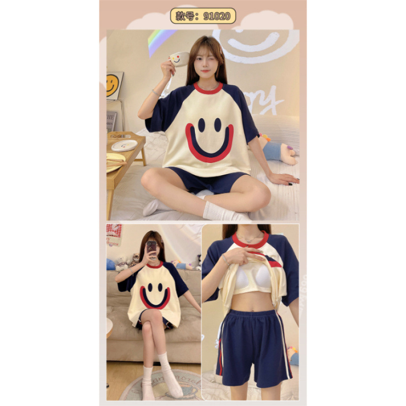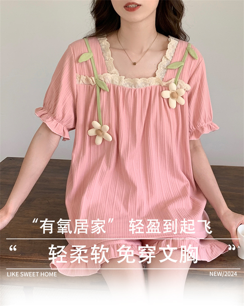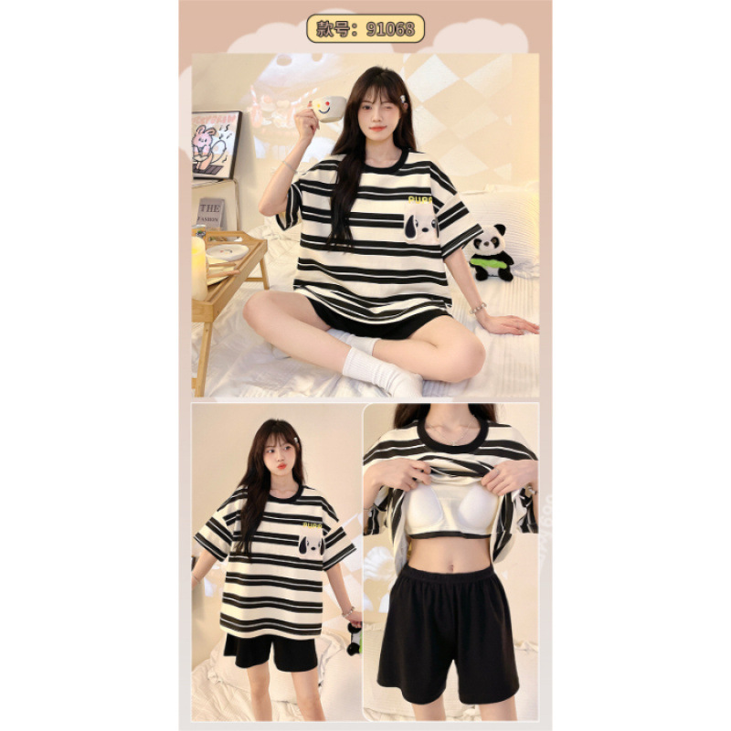 2025년 새로운 귀여운 반팔 여성 잠옷 여름 가슴 패드 일체형 웨어러블 홈웨어 세트스토어 가기