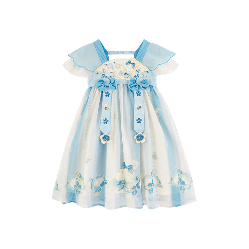 Wulibuyi 소녀 프린트 Hanfu 드레스 여름 가볍고 통기성이 뛰어난 중공업 자수 꽃잎 반팔 중국 스타일 드레스