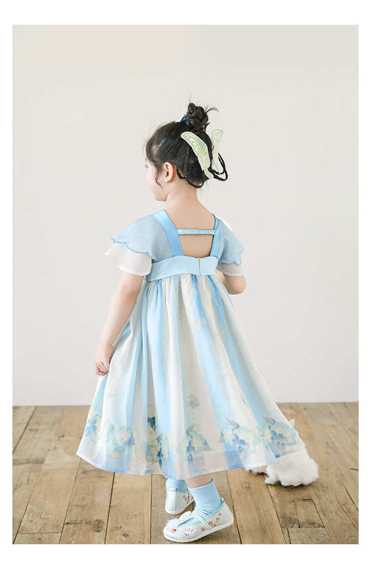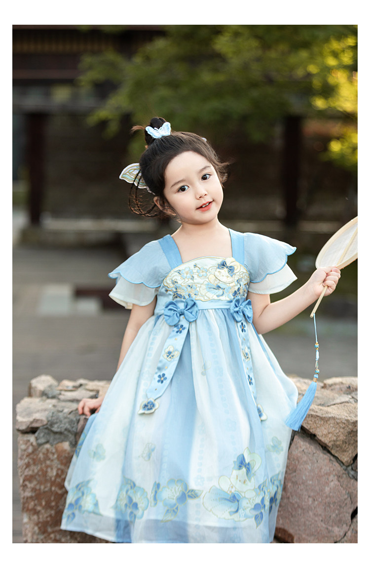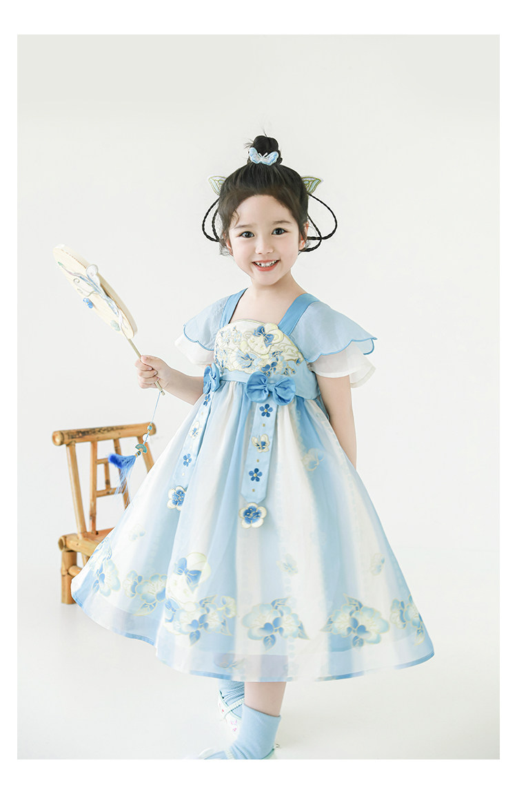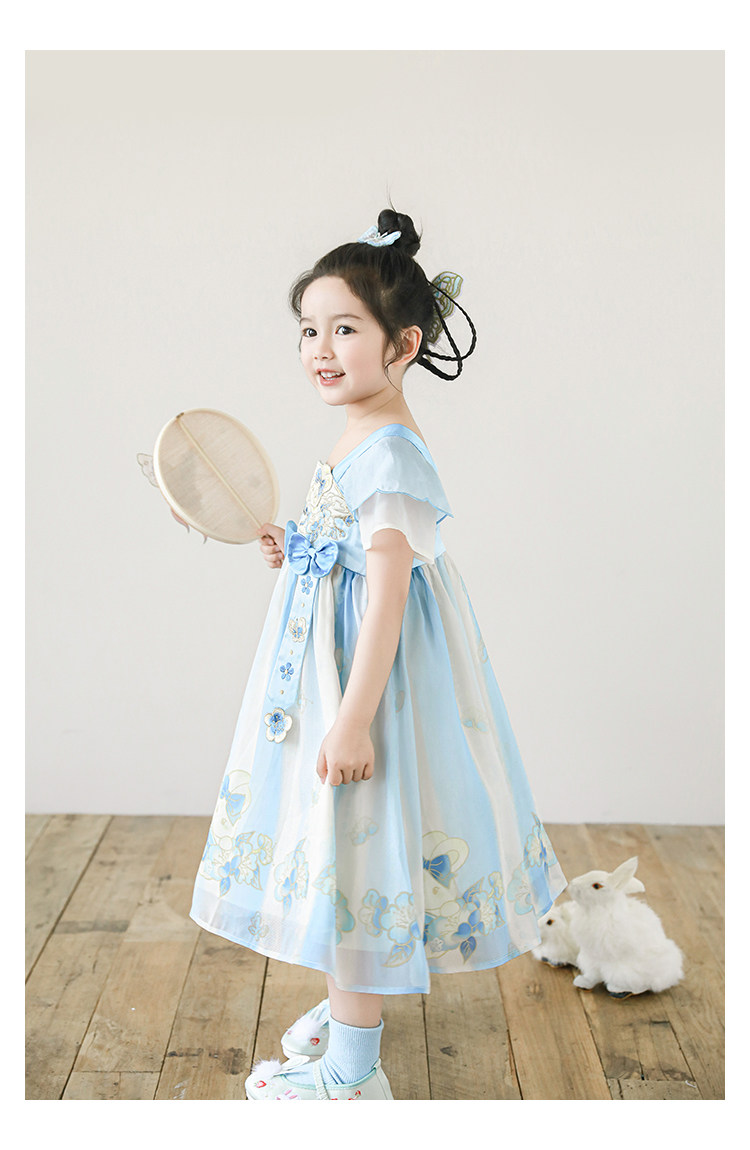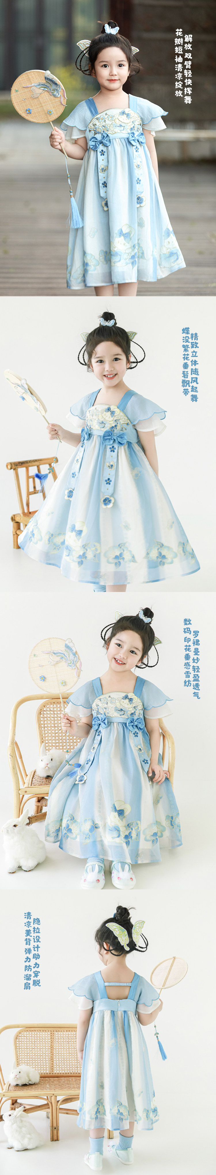 Wulibuyi 소녀 프린트 Hanfu 드레스 여름 가볍고 통기성이 뛰어난 중공업 자수 꽃잎 반팔 중국 스타일 드레스스토어 가기