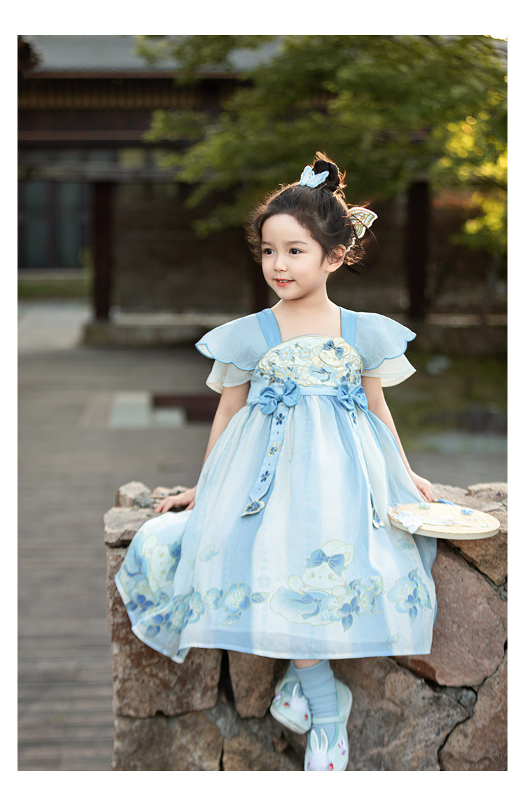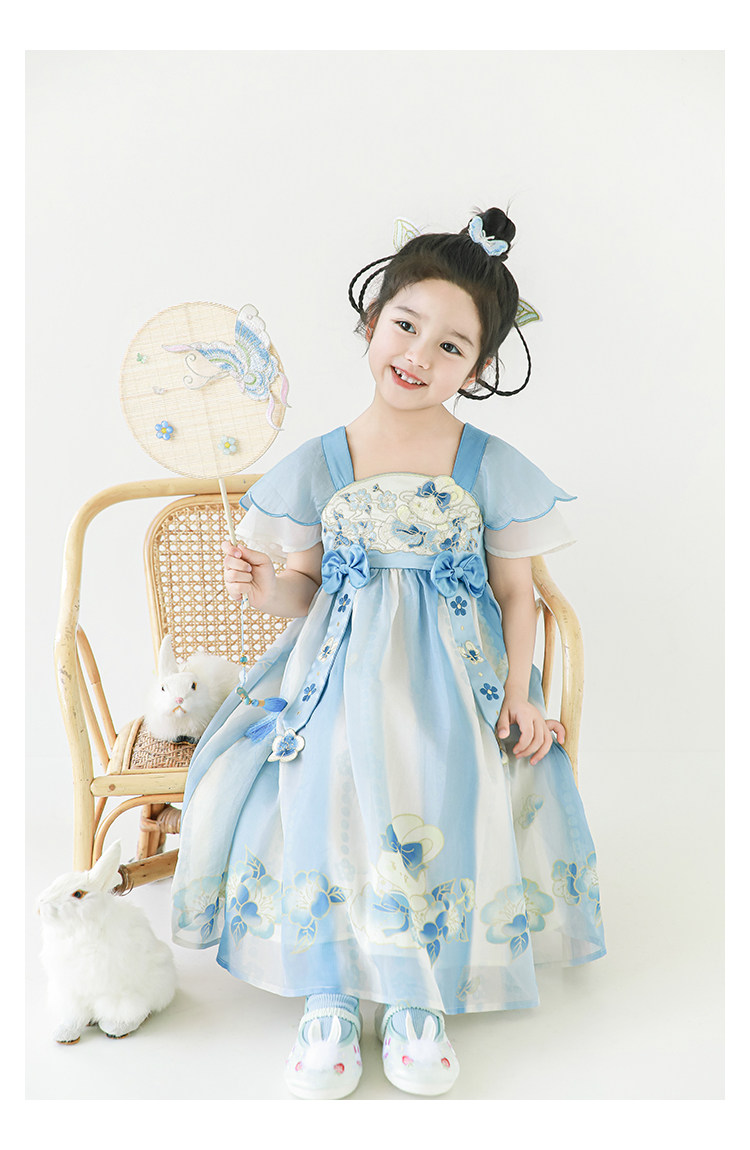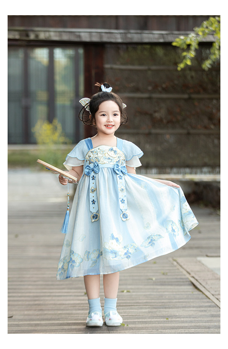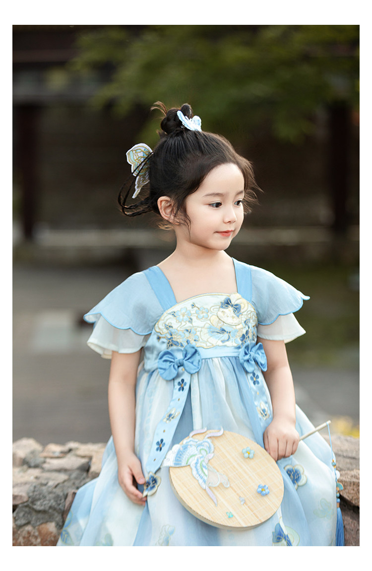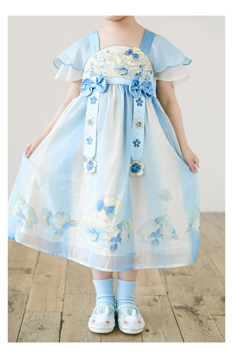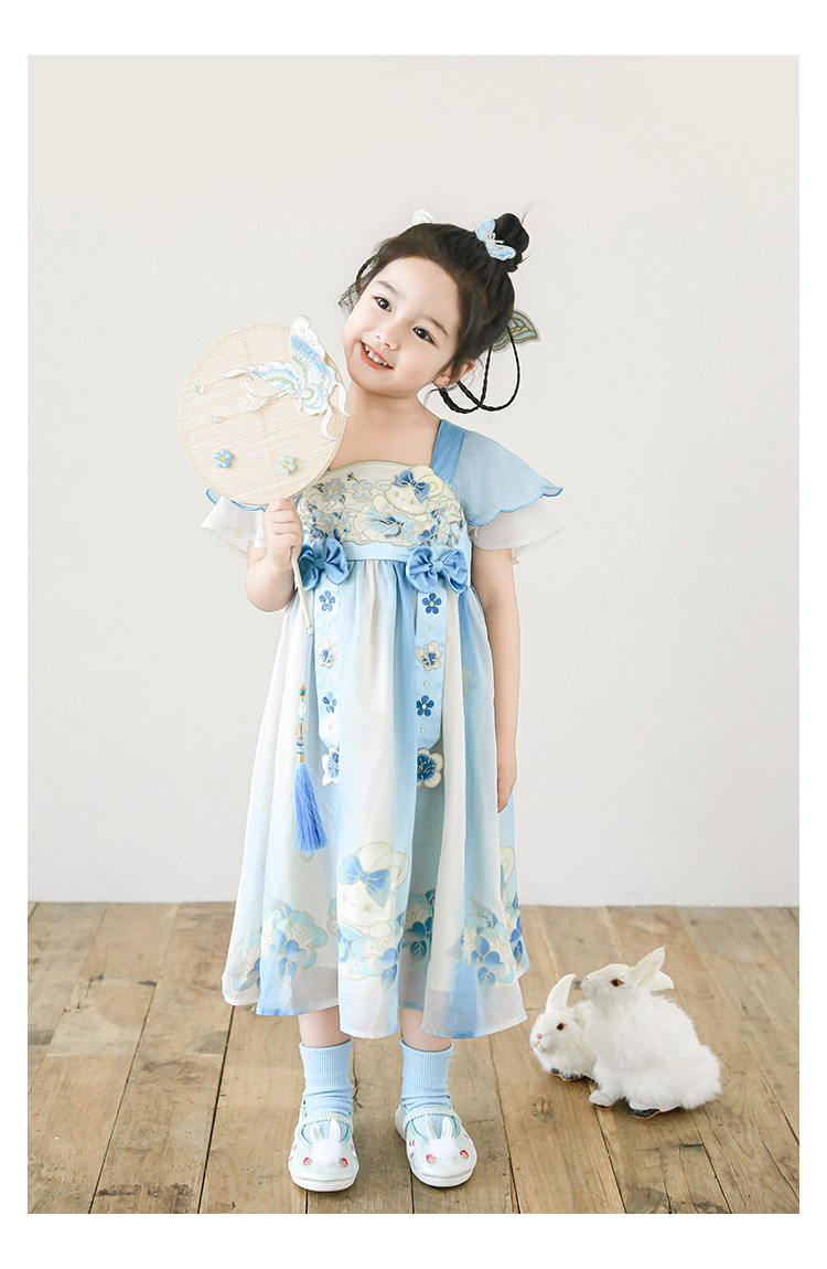 Wulibuyi 소녀 프린트 Hanfu 드레스 여름 가볍고 통기성이 뛰어난 중공업 자수 꽃잎 반팔 중국 스타일 드레스스토어 가기