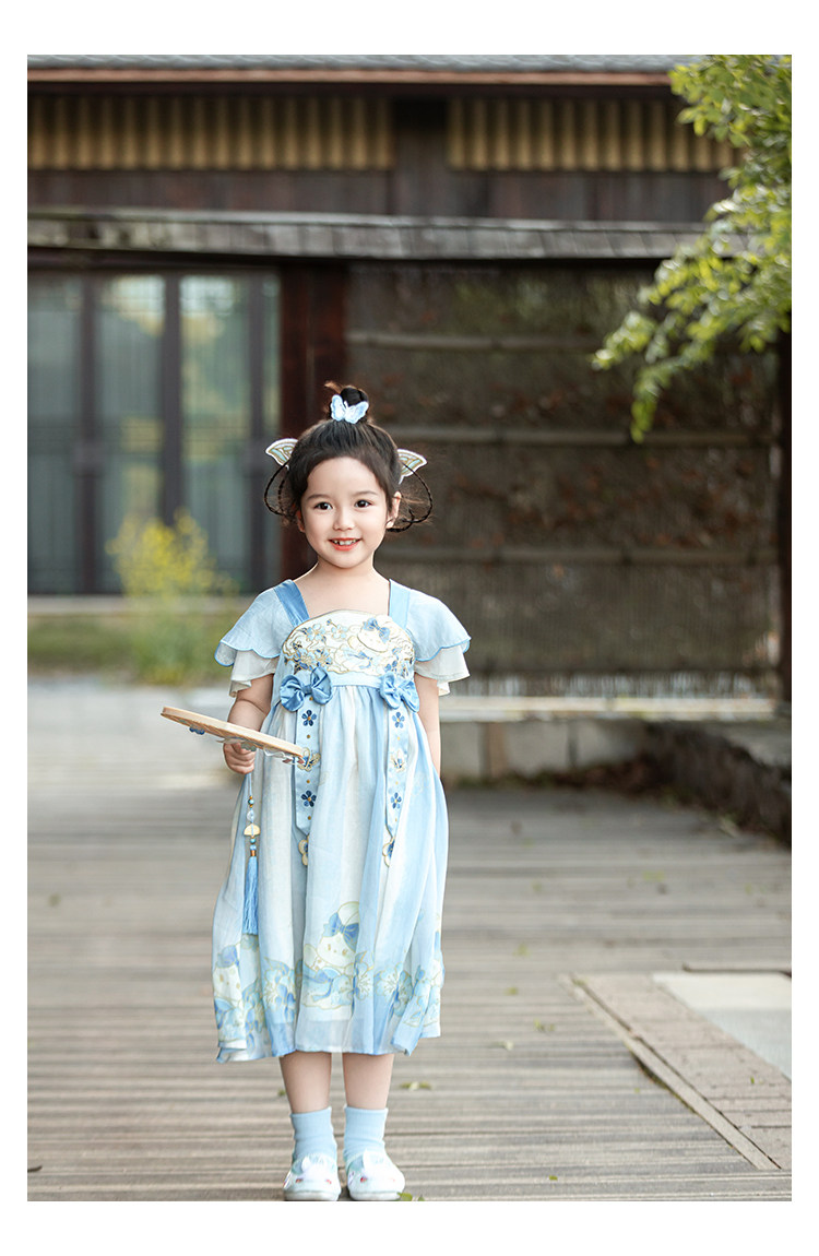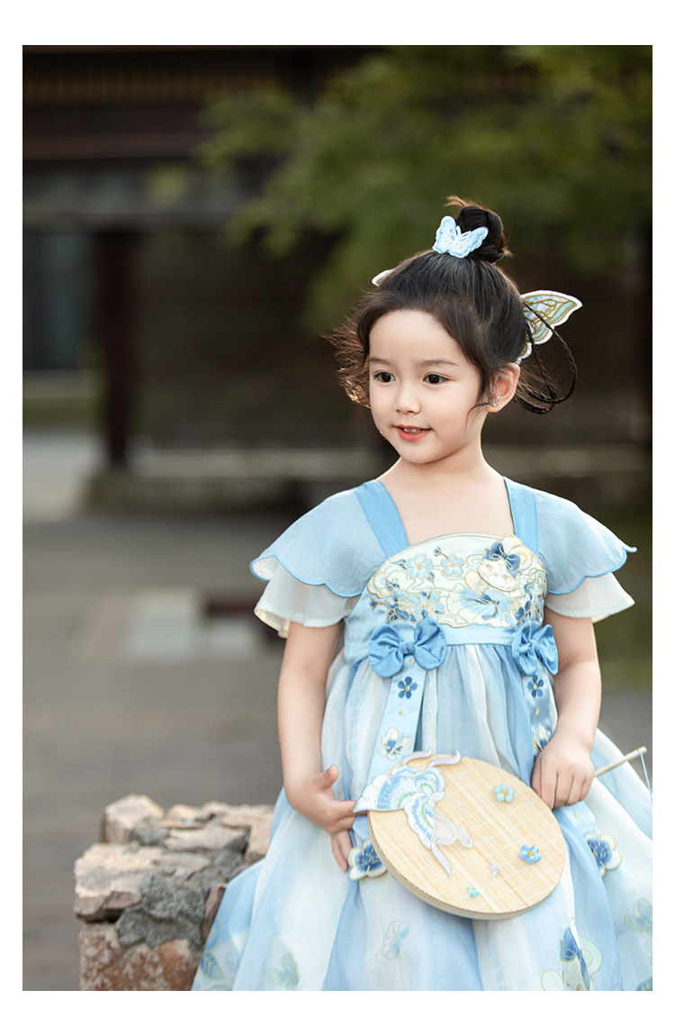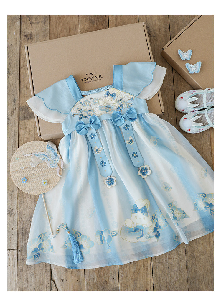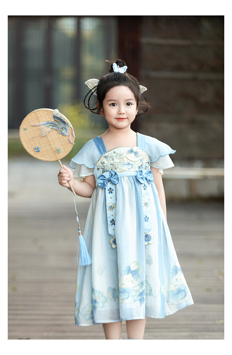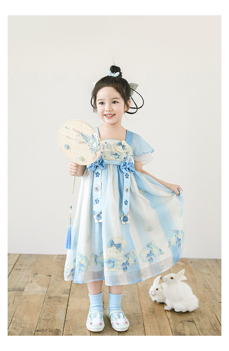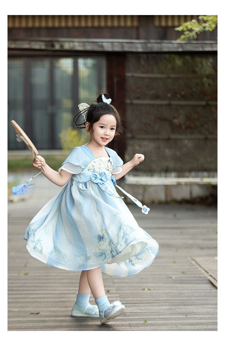 Wulibuyi 소녀 프린트 Hanfu 드레스 여름 가볍고 통기성이 뛰어난 중공업 자수 꽃잎 반팔 중국 스타일 드레스스토어 가기