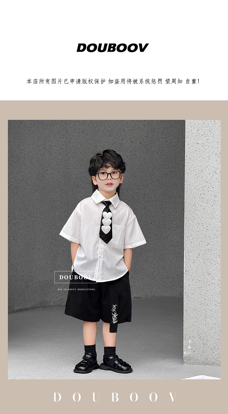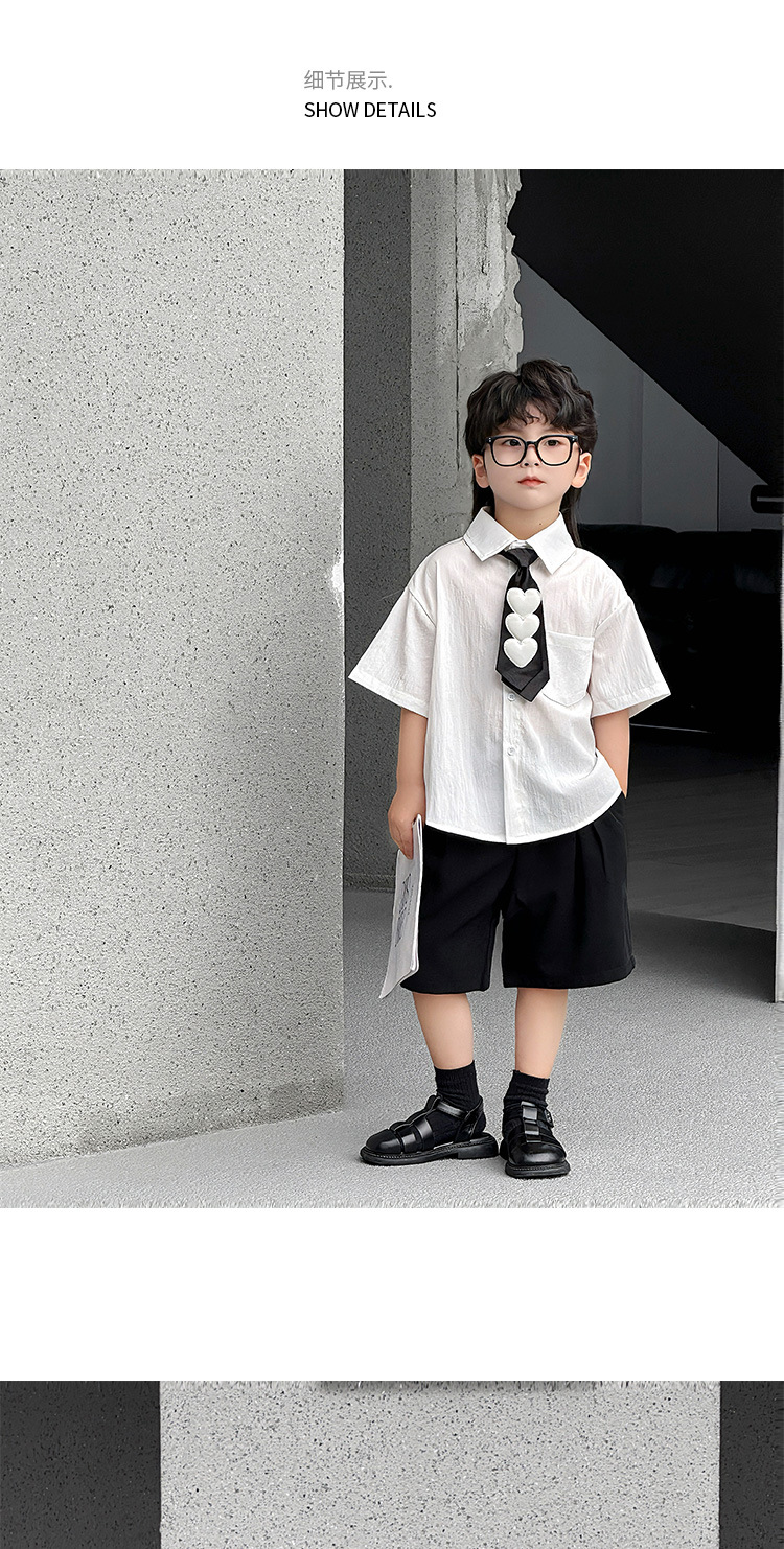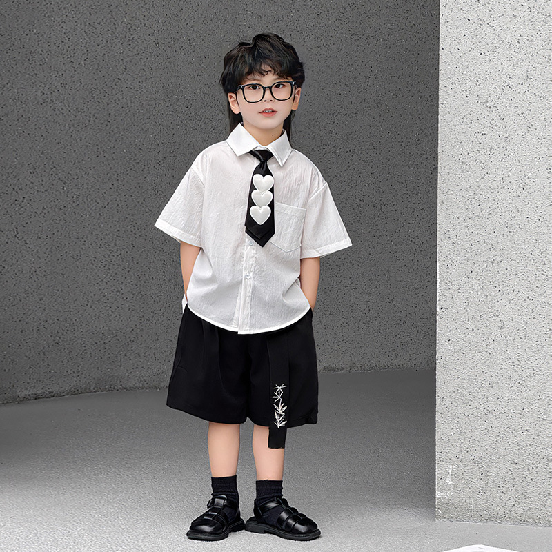 • 흰색 셔츠 + 쓰리하트 타이 + 블랙 자수 리본 쇼츠