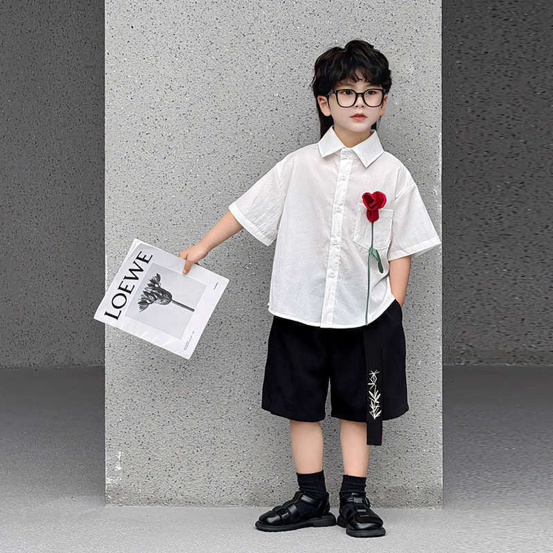 • 화이트 셔츠 + 레드 로즈 코사지 + 블랙 자수 리본 쇼츠