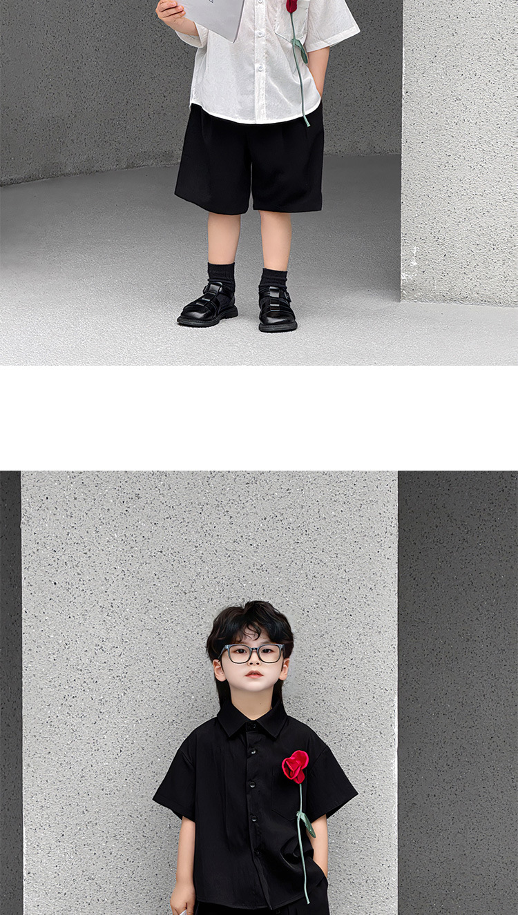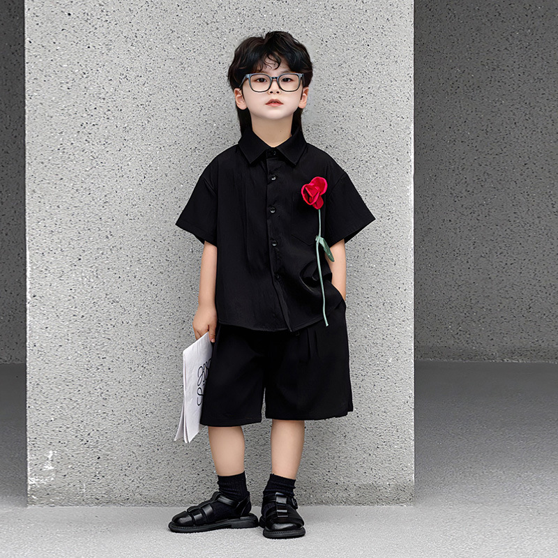 • 블랙 셔츠 + 레드 로즈 코사지 + 블랙 자수 리본 쇼츠