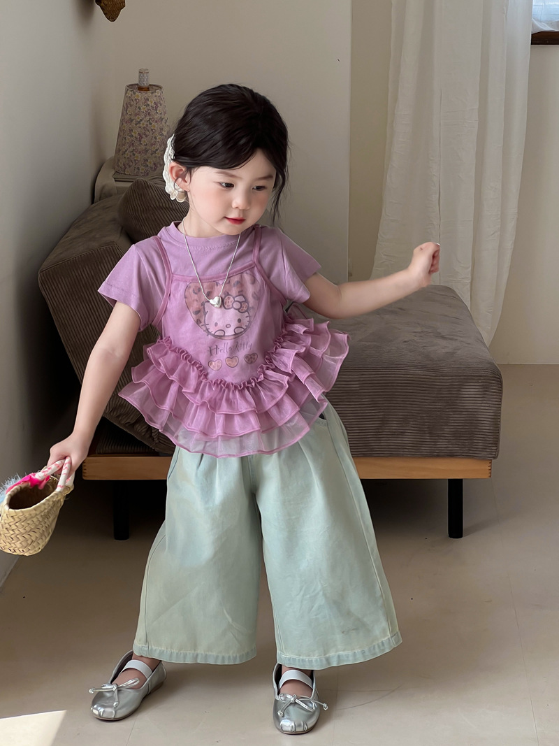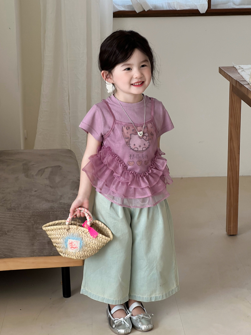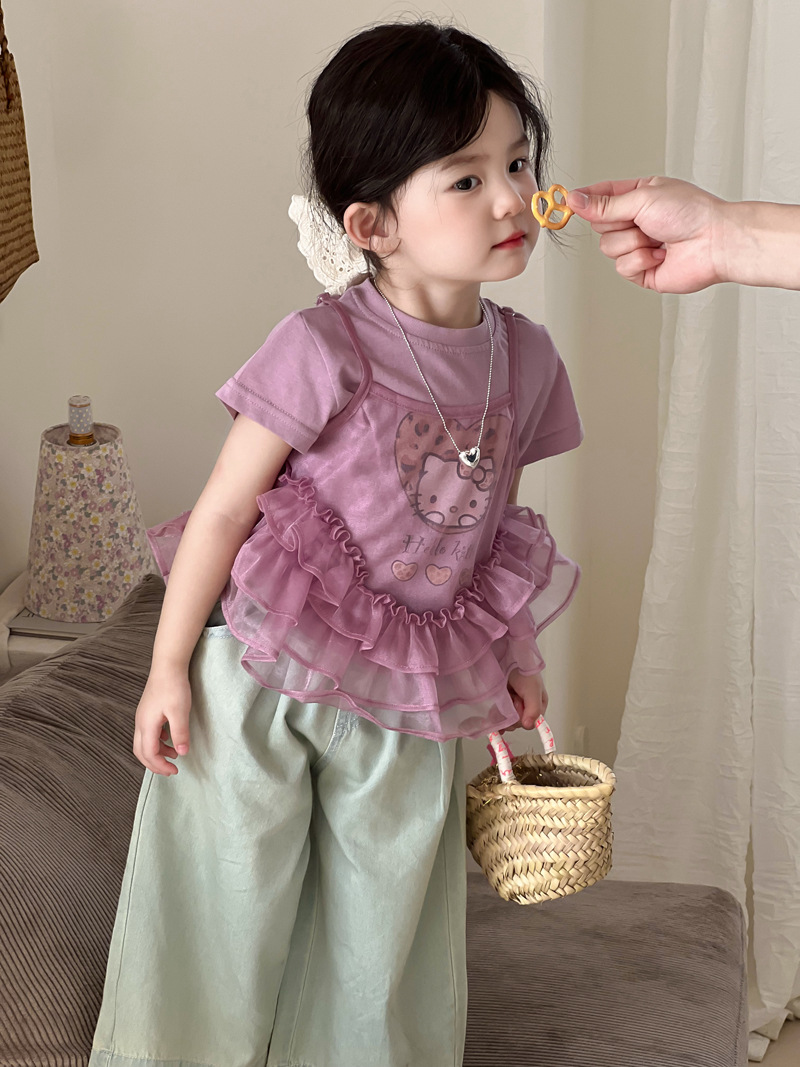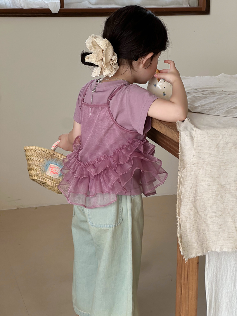한국 여자 티셔츠 세트 2025 여름 신인상 KT 반팔 T 어린이 메쉬 슬링 탑 베이비 T