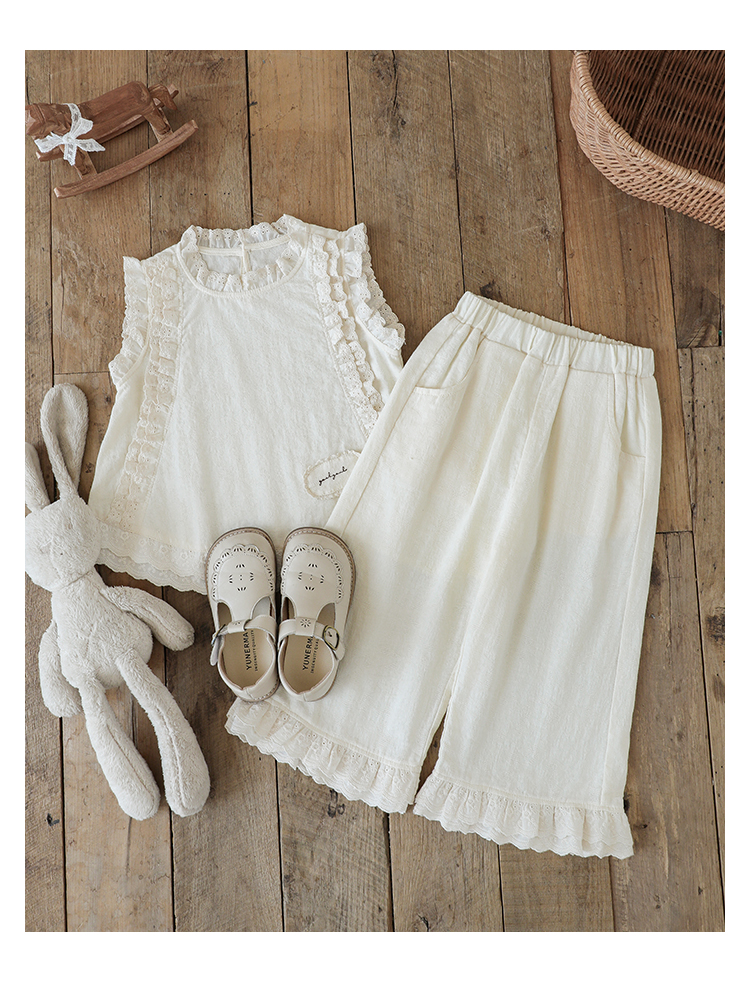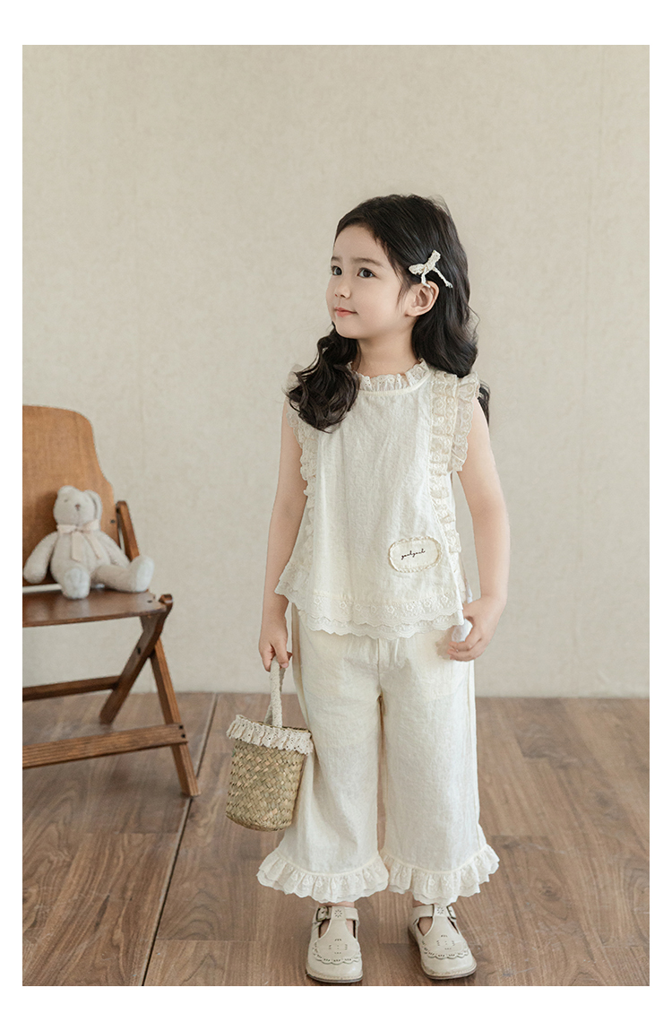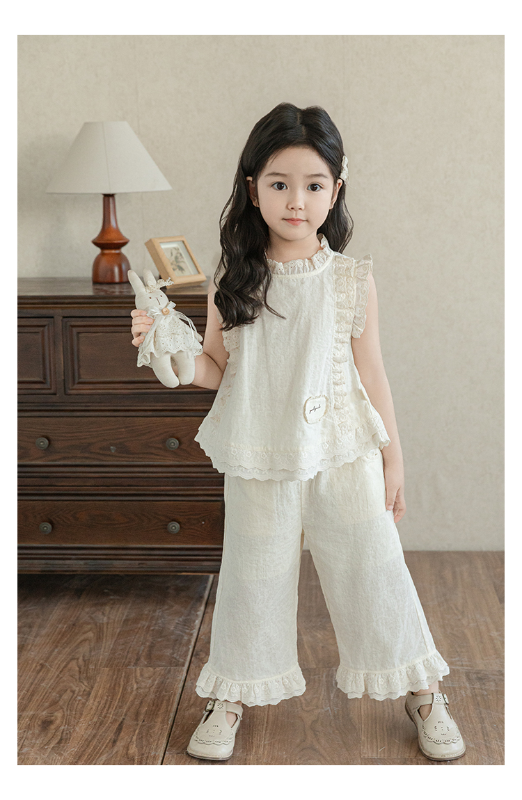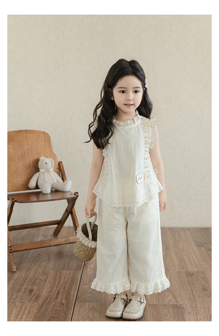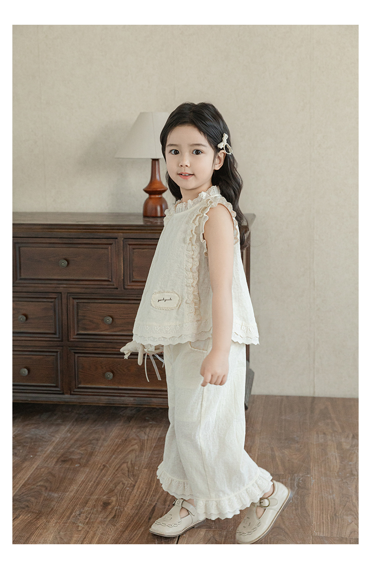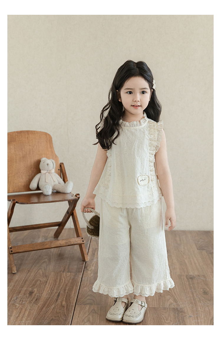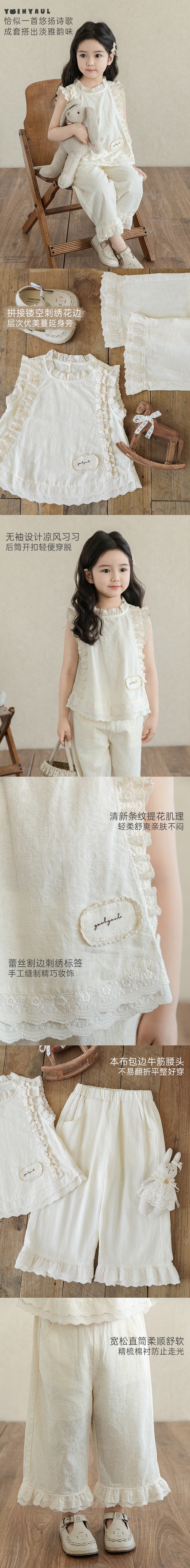 Wulibuyi 소녀 문학 정장 2025 여름 어린이 귀여운 중공 자수 꽃 조끼 느슨한 스트레이트 바지