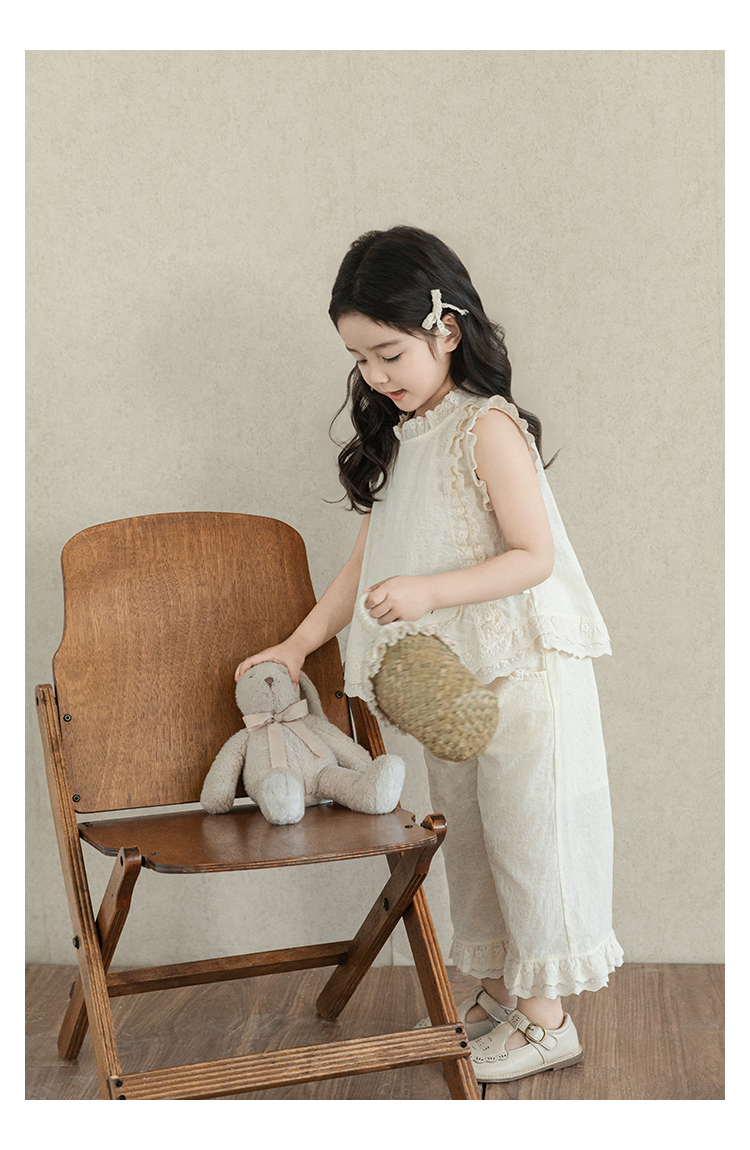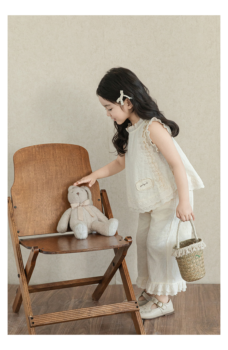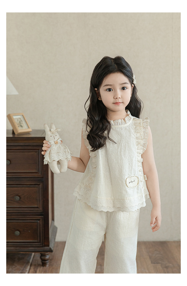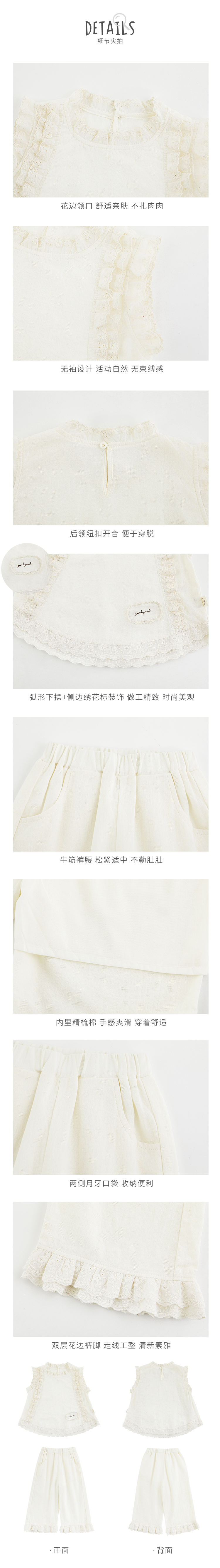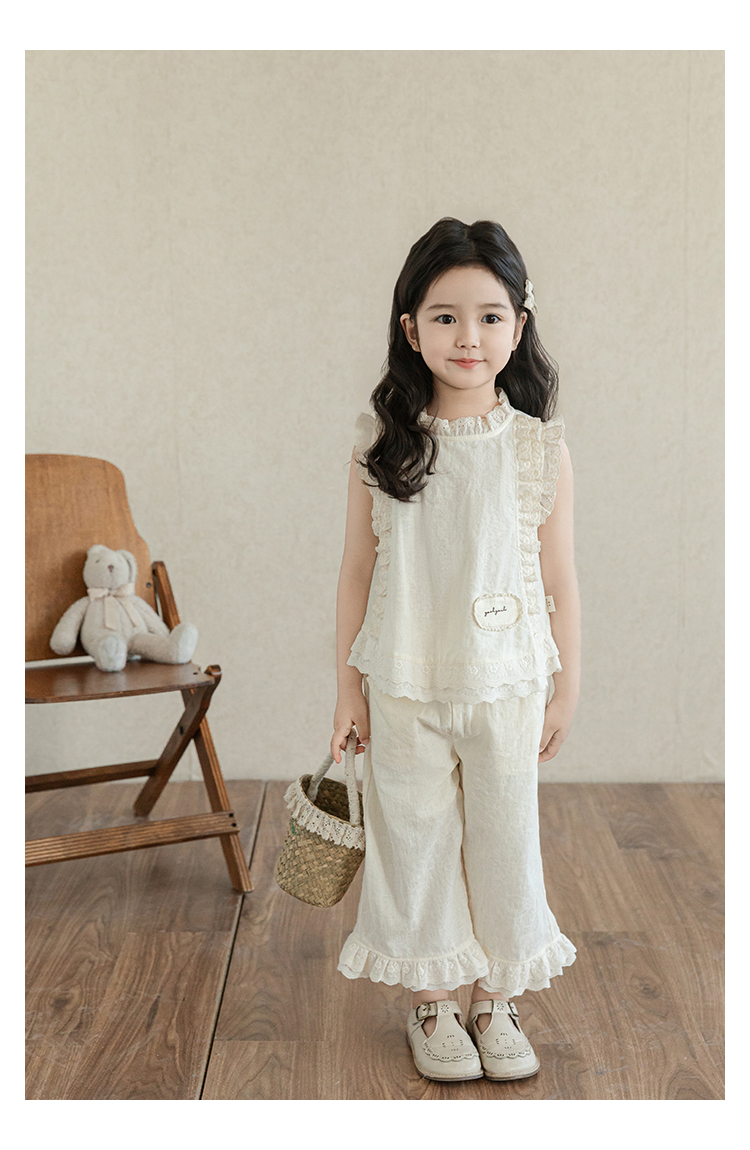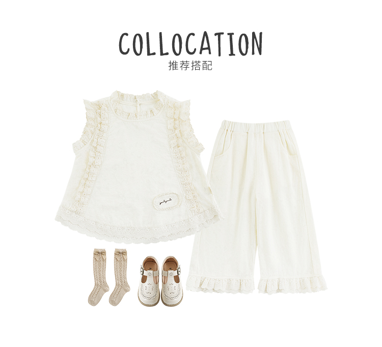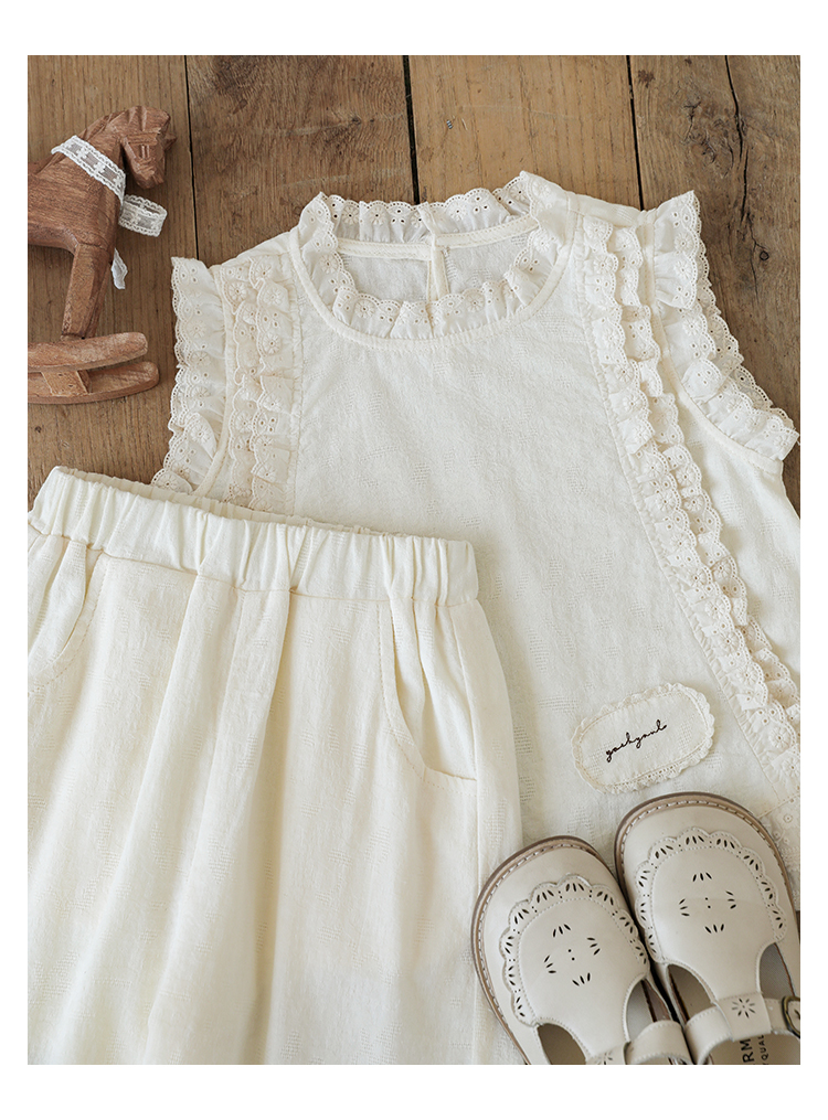 Wulibuyi 소녀 문학 정장 2025 여름 어린이 귀여운 중공 자수 꽃 조끼 느슨한 스트레이트 바지