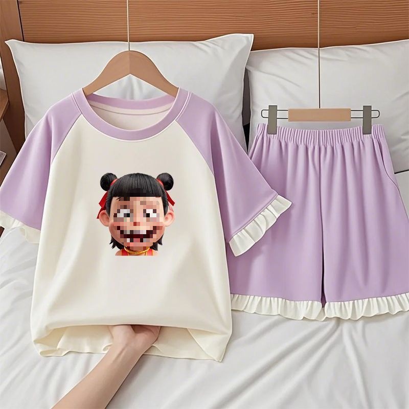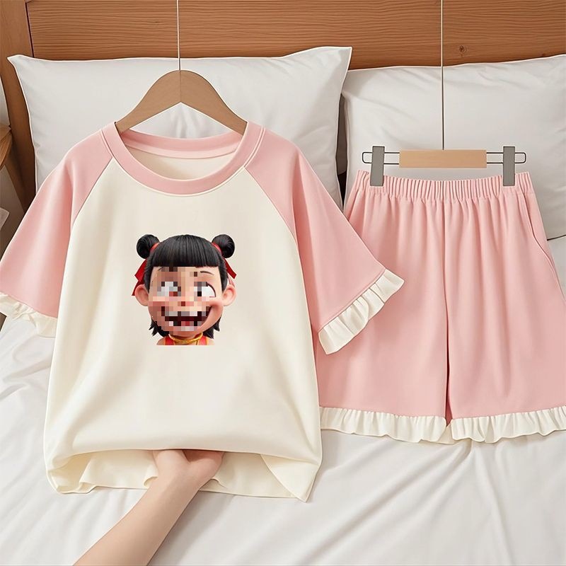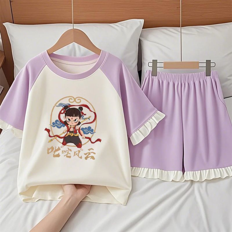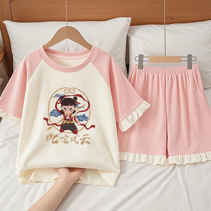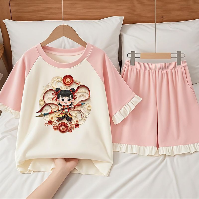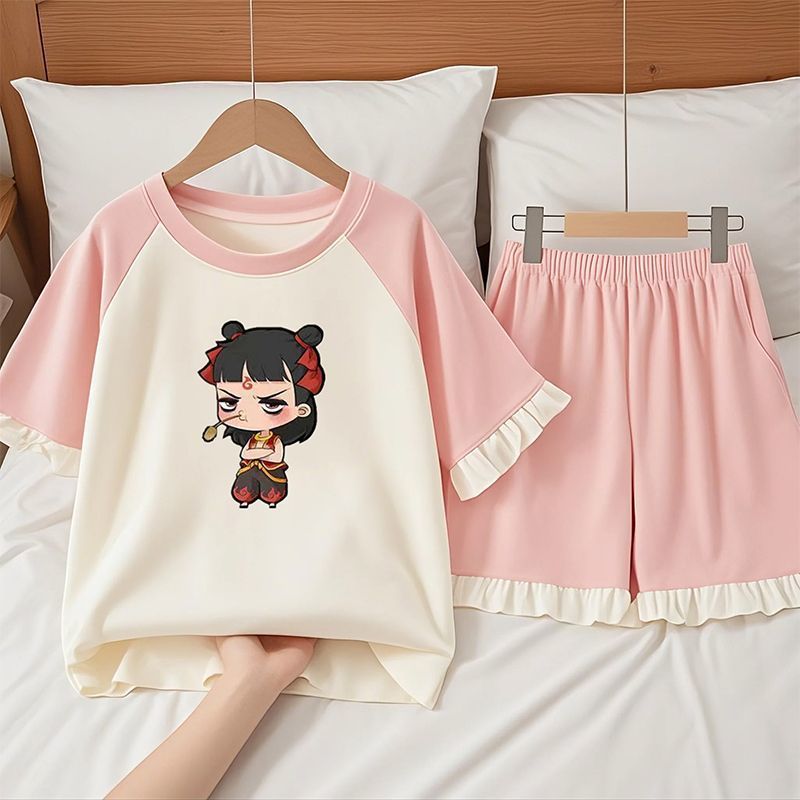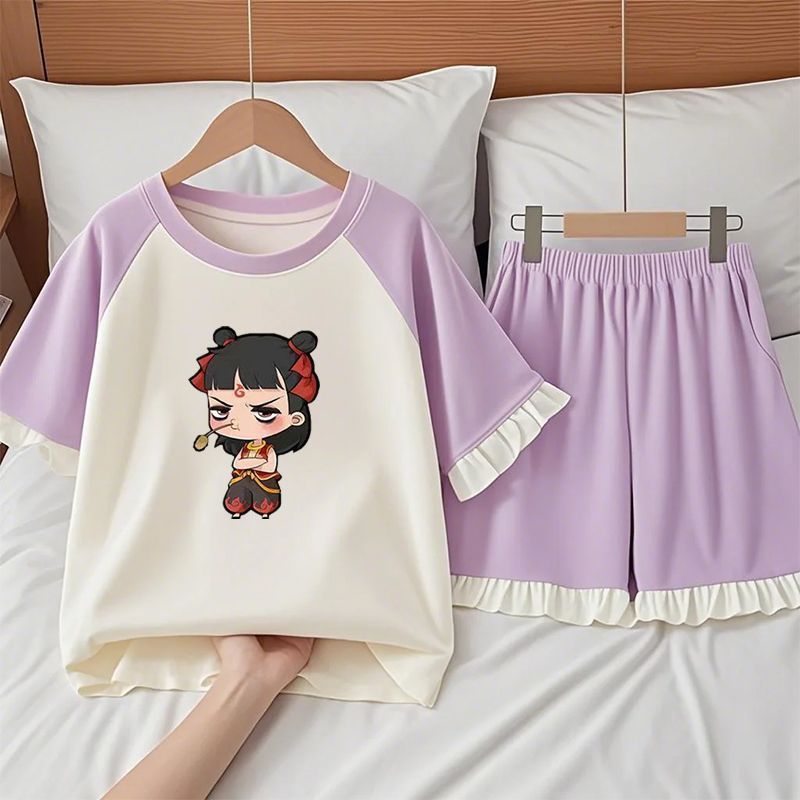 여아 순면 잠옷 2025 여름 작은 Nezha 반팔 반바지 중형 및 대형 아동복은 밖에서 착용 가능