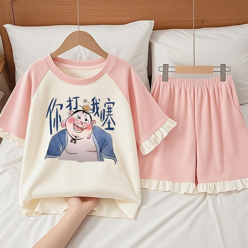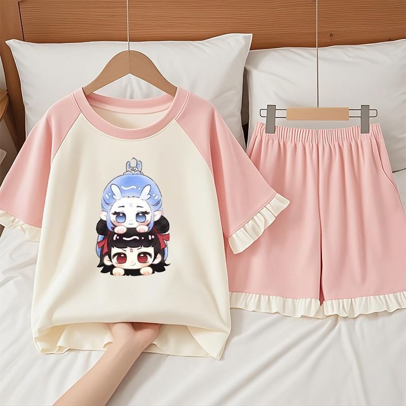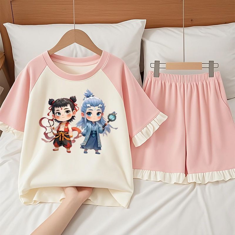 여아 순면 잠옷 2025 여름 작은 Nezha 반팔 반바지 중형 및 대형 아동복은 밖에서 착용 가능스토어 가기