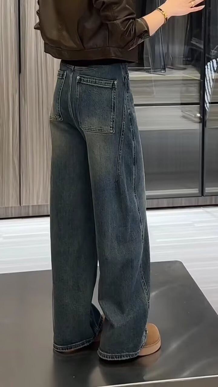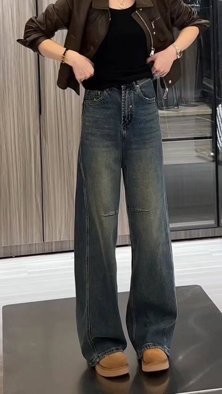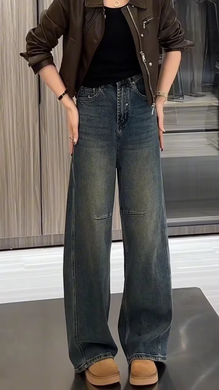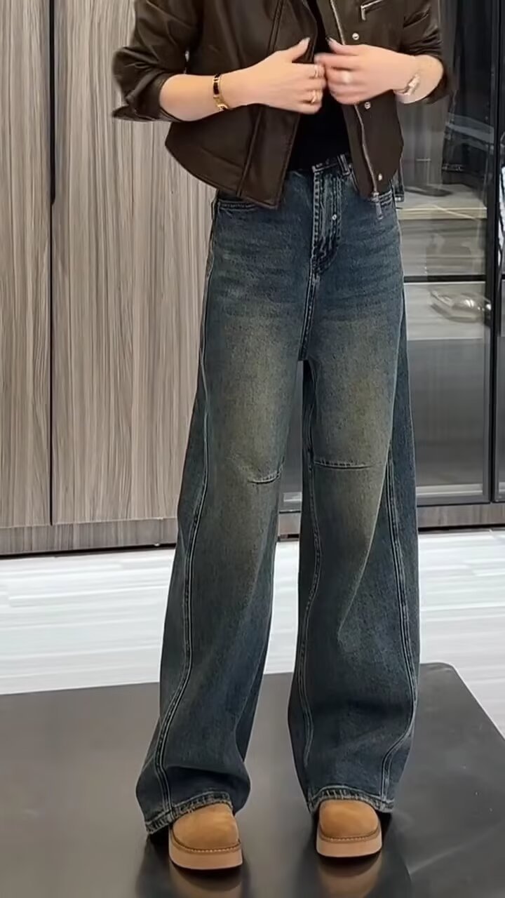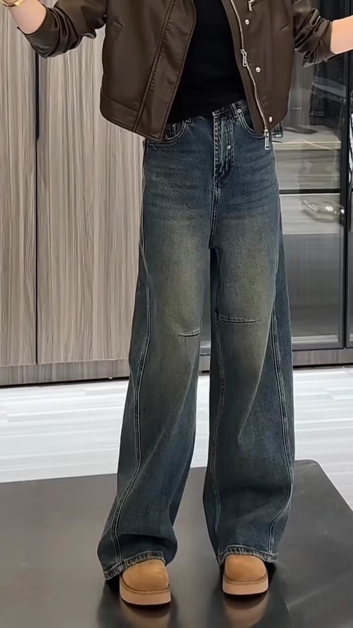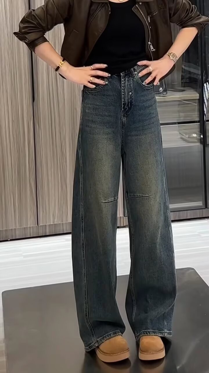 여성용 빅사이즈 스트레이트 청바지, 뚱뚱한 mm를 위한 봄, 가을, 배형 바디, 루즈한 하이웨이스트, 슬리밍, 와이드 레그, 세이버 모양의 바닥 길이 바지스토어 가기