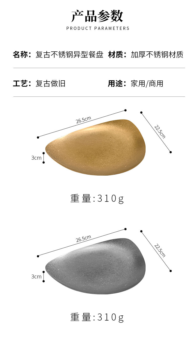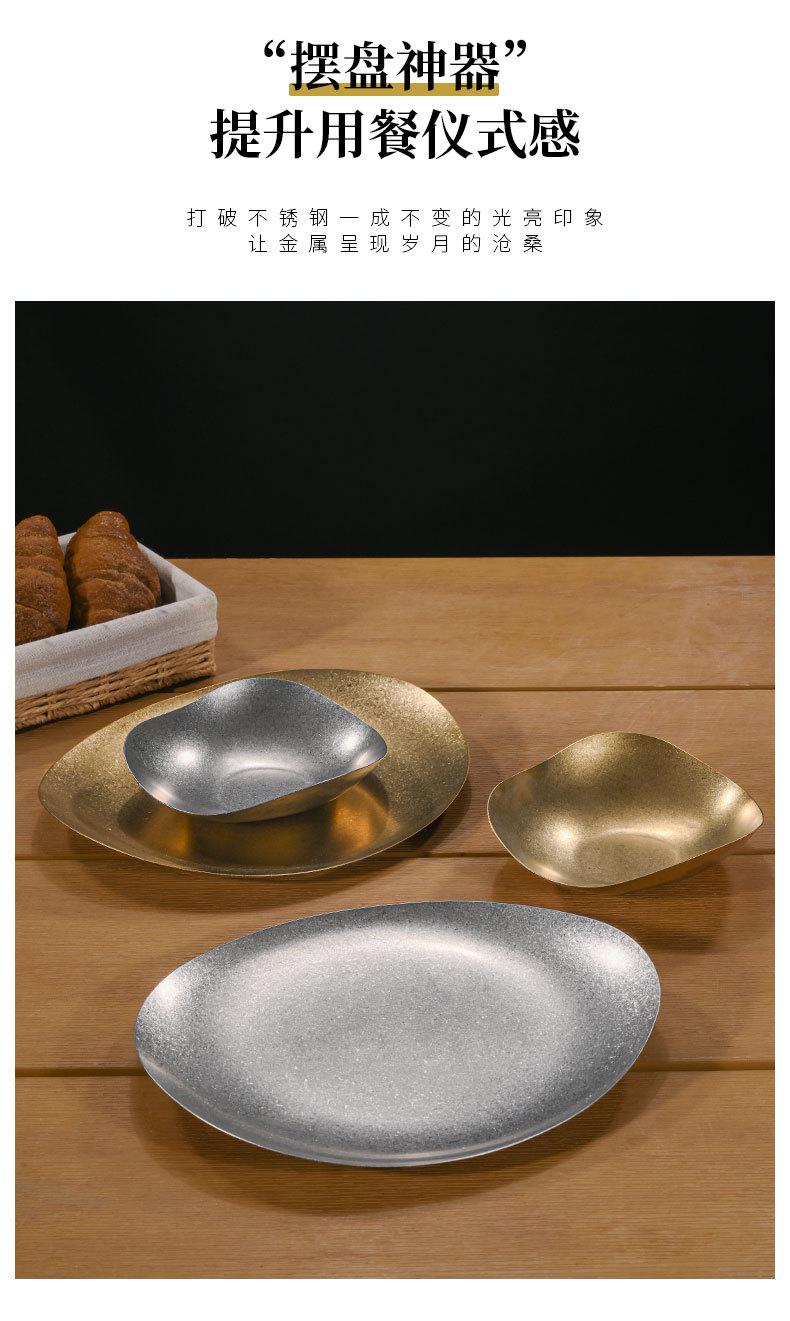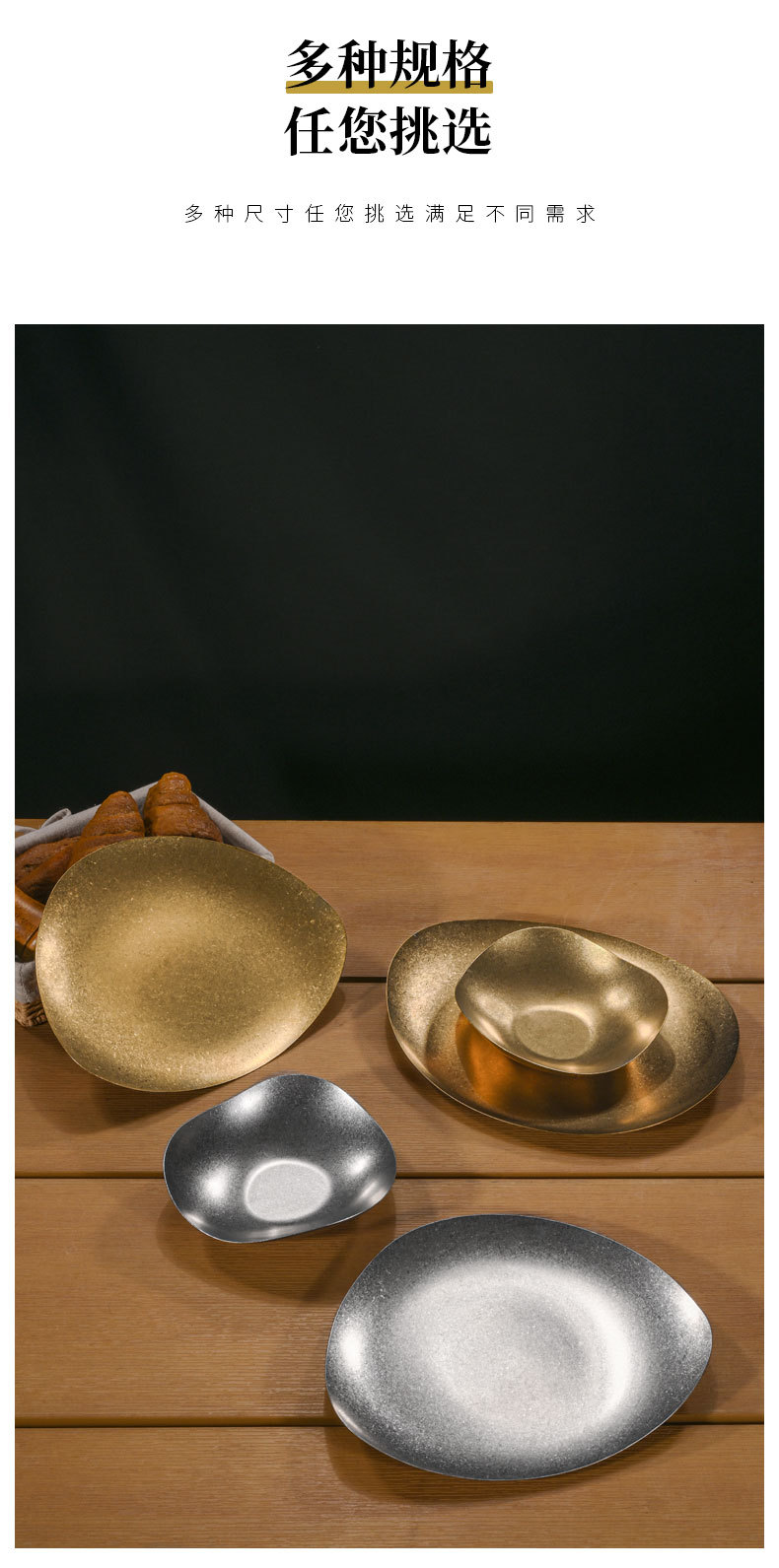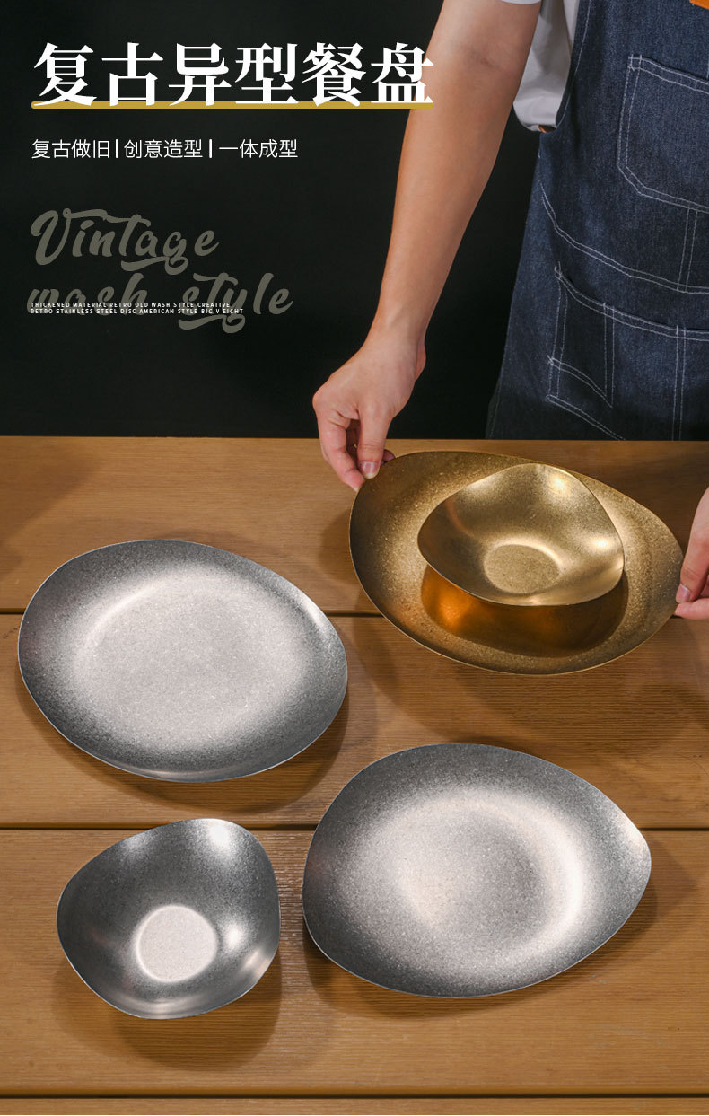 가벼운 고급 복고풍 금 접시 304 스테인레스 스틸 접시 특별한 모양의 불규칙한 얕은 접시 산업 스타일 트레이 고가치 디너 접시스토어 가기