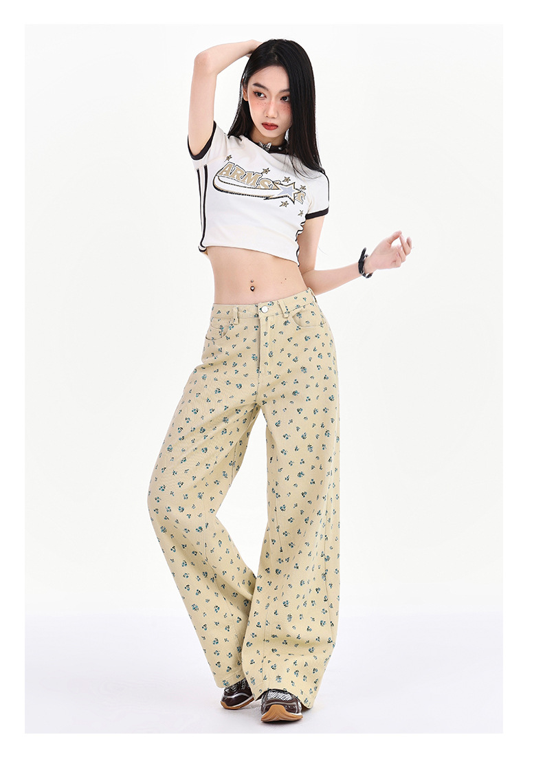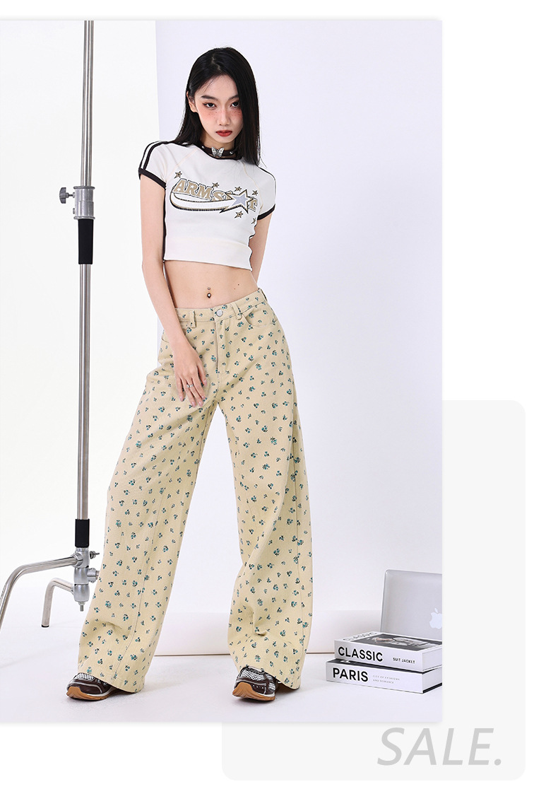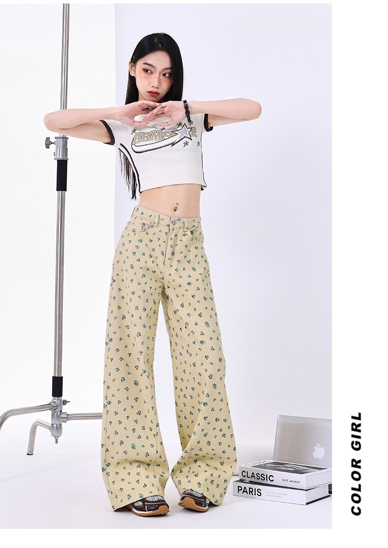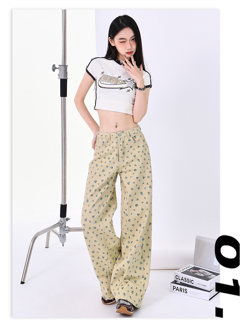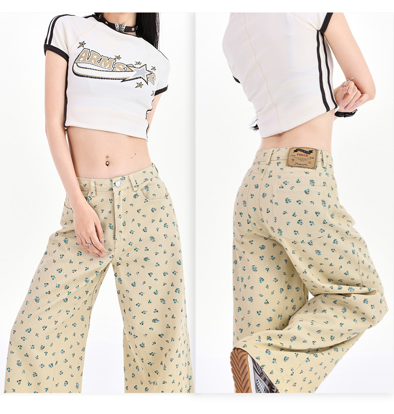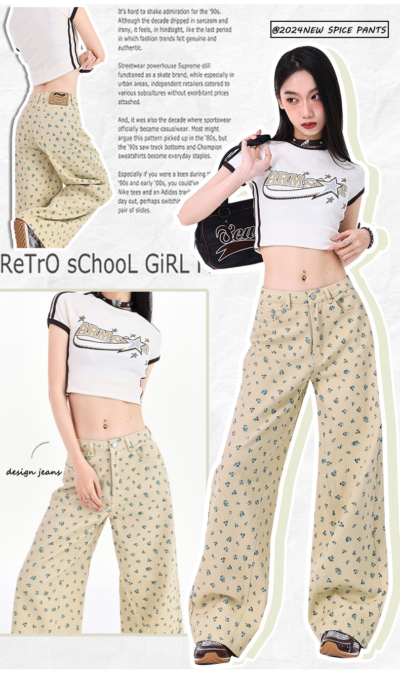 25번째 ootd!| 레트로 홍콩 스타일 작은 신선한 꽃무늬 스트레이트 청바지 슬리밍 루즈 와이드 레그 팬츠 여성용