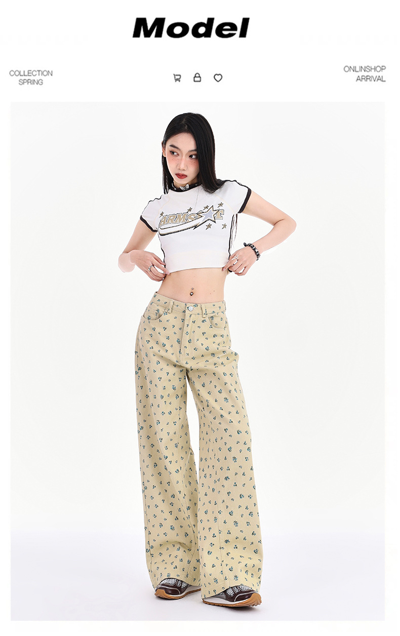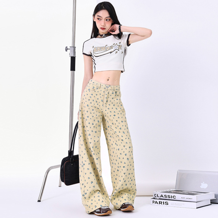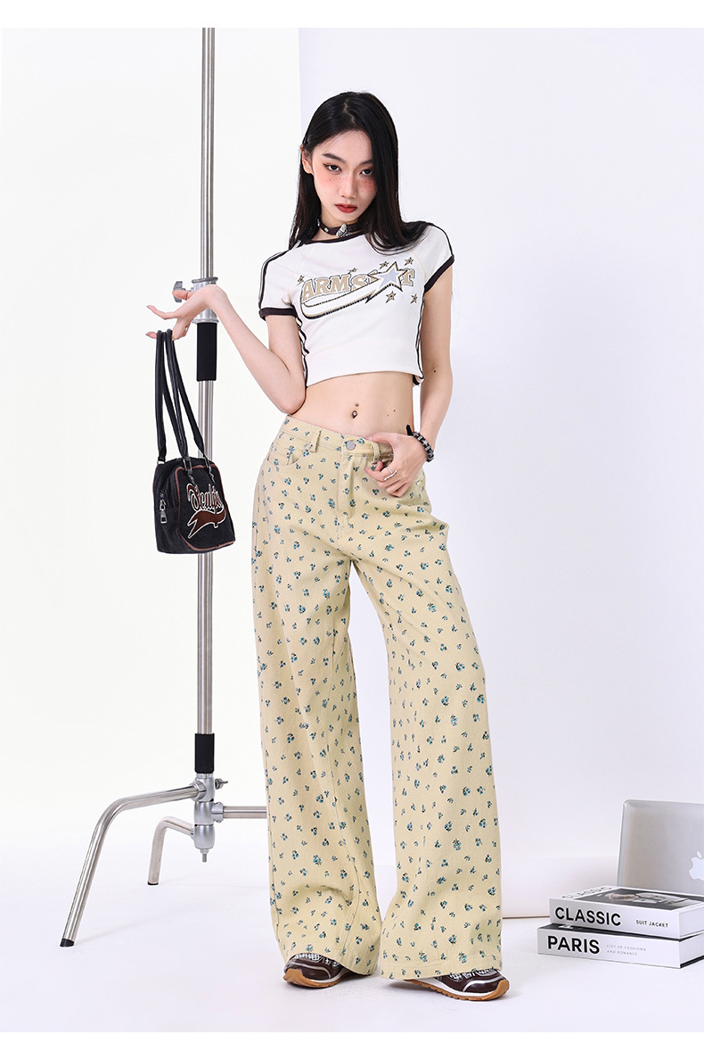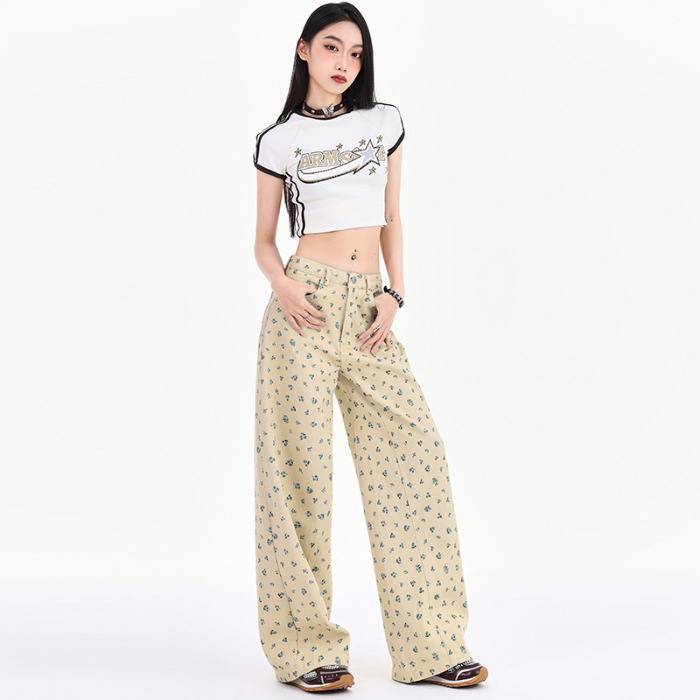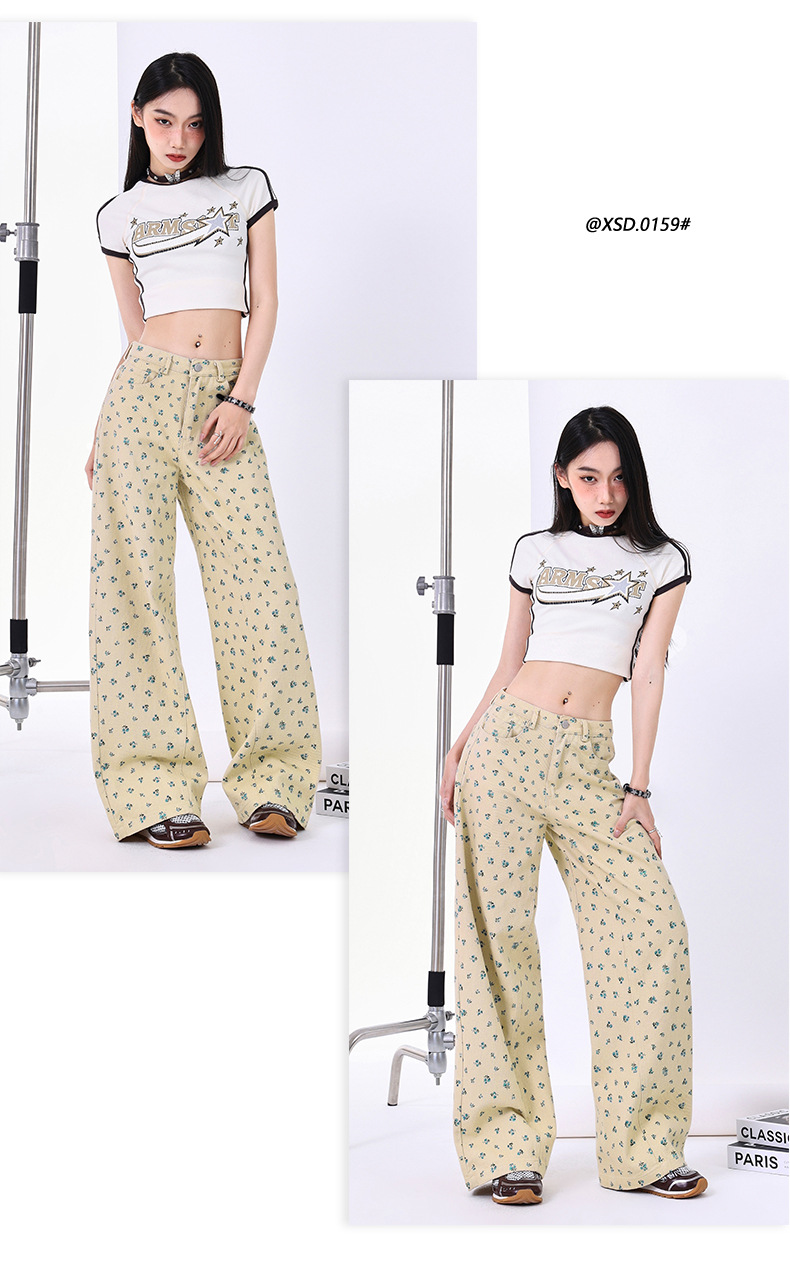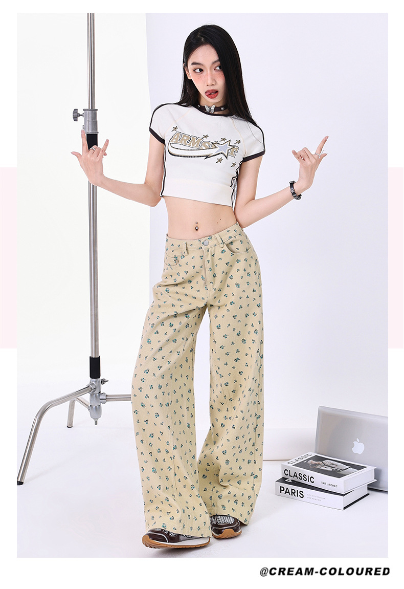 25번째 ootd!| 레트로 홍콩 스타일 작은 신선한 꽃무늬 스트레이트 청바지 슬리밍 루즈 와이드 레그 팬츠 여성용