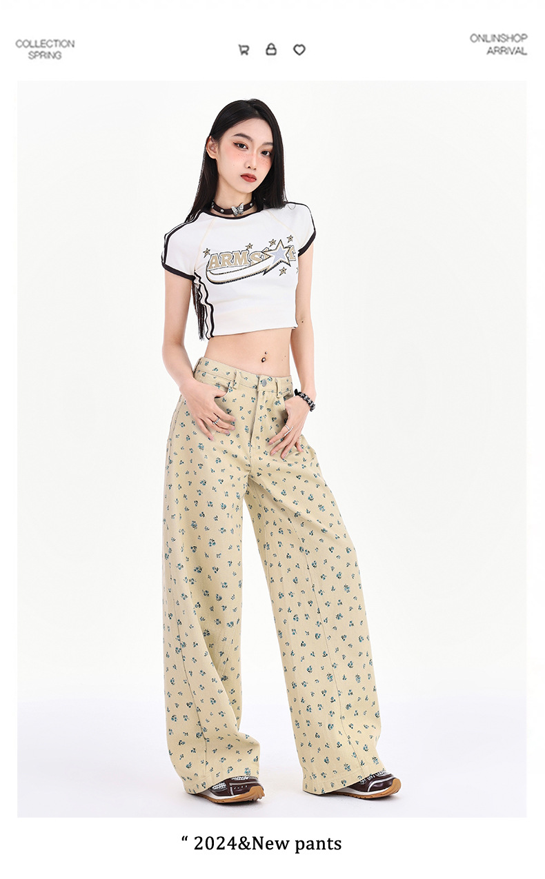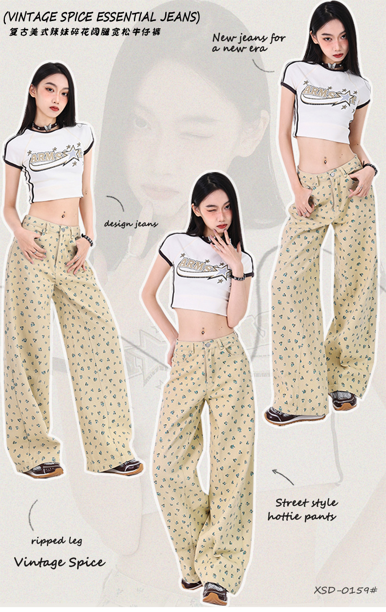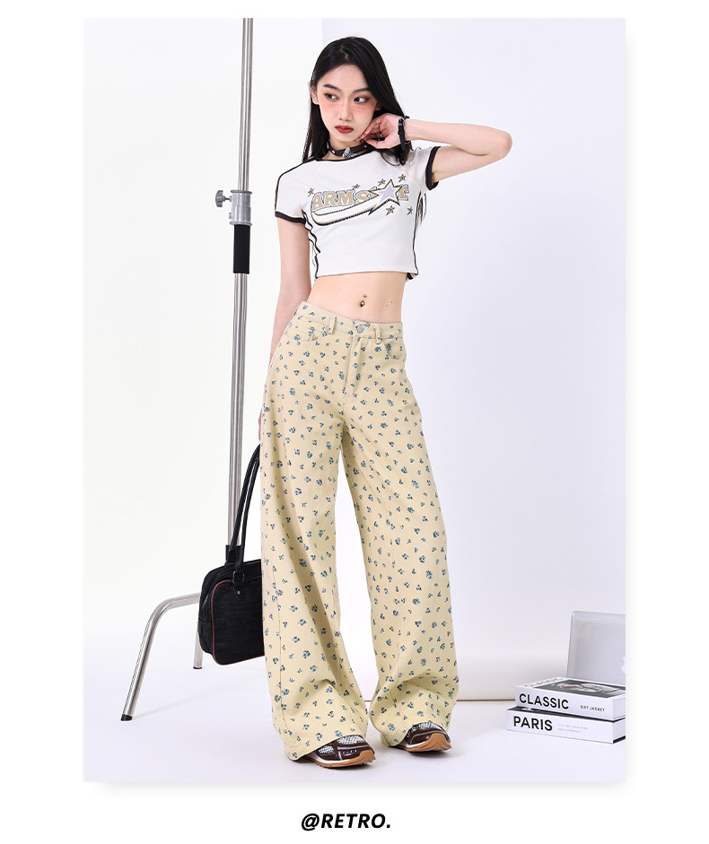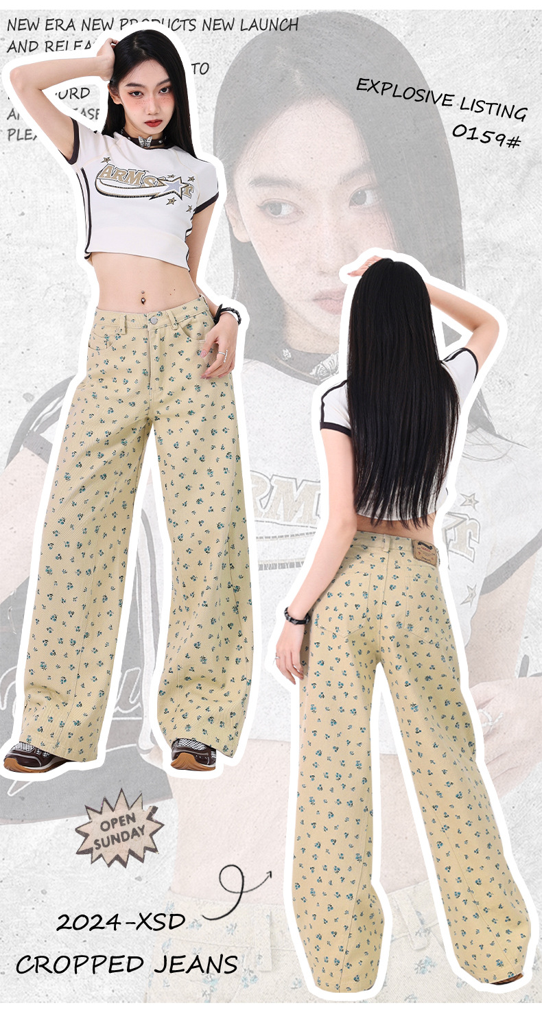 25번째 ootd!| 레트로 홍콩 스타일 작은 신선한 꽃무늬 스트레이트 청바지 슬리밍 루즈 와이드 레그 팬츠 여성용스토어 가기