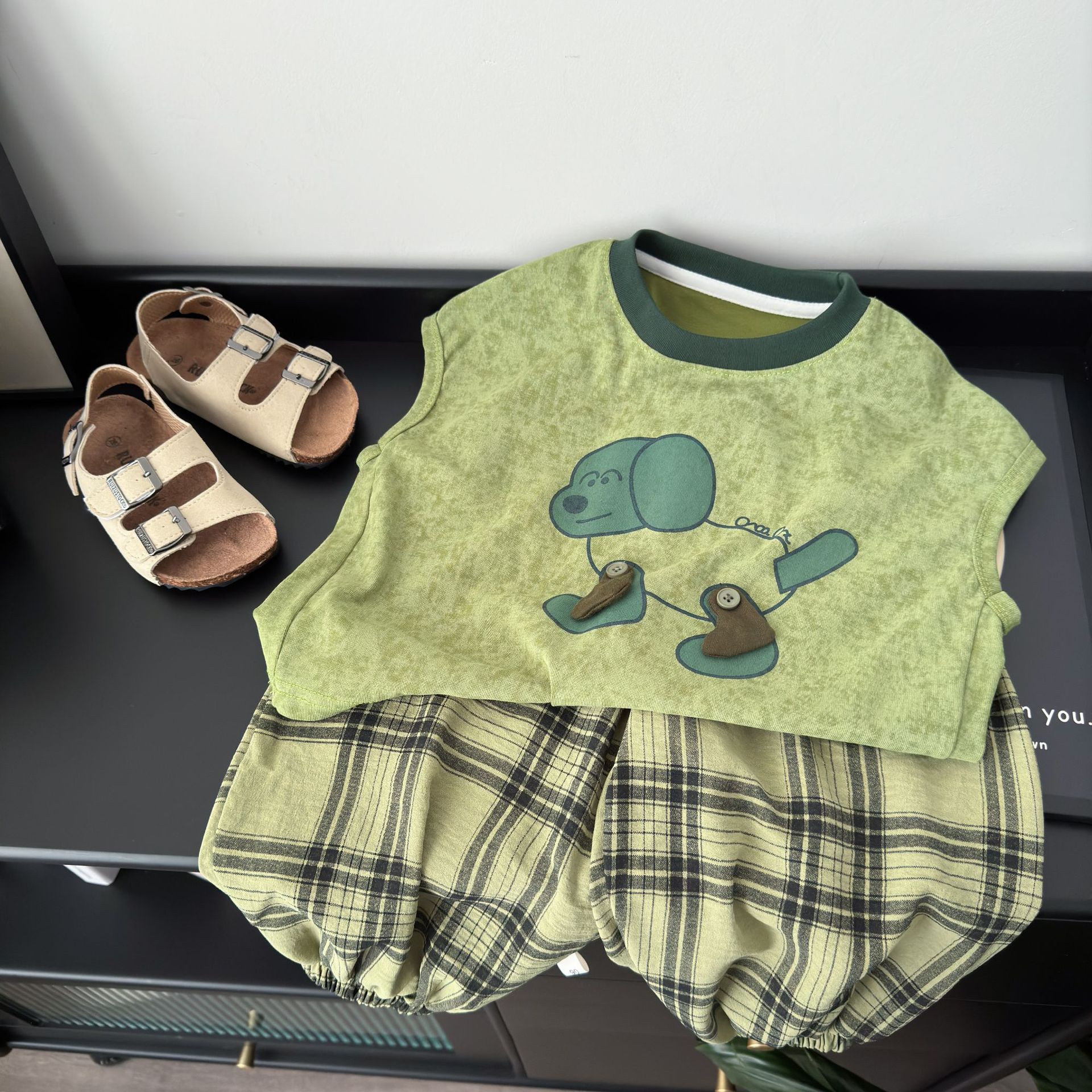 어린이 조끼 세트 2025 새로운 소년 소녀 민소매 어깨 안티 모기 바지 투피스 루즈 탑 프렐리스 바지