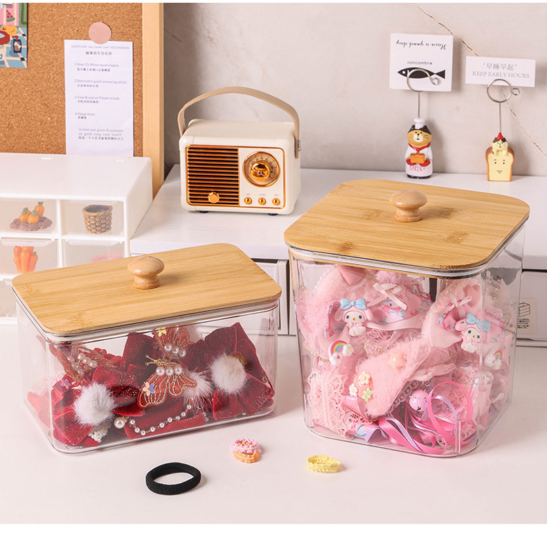 대나무 뚜껑 보관 바구니 가정용 거실 문구 장난감 보관 상자를 가진 투명한 데스크탑 방진 저장 상자 간식 잡화