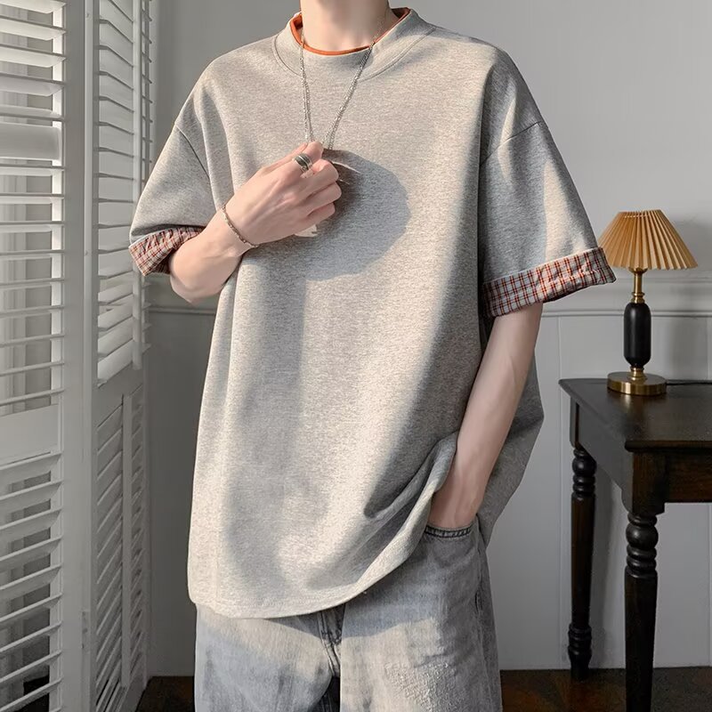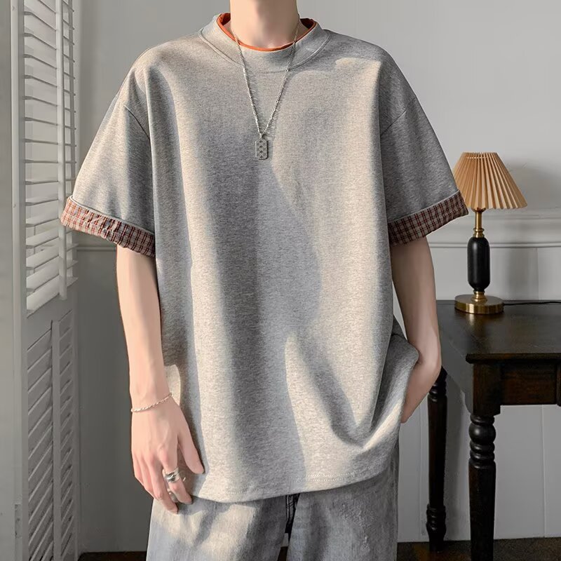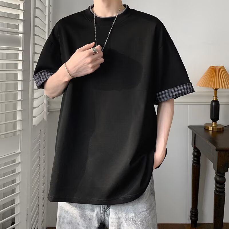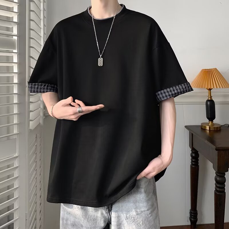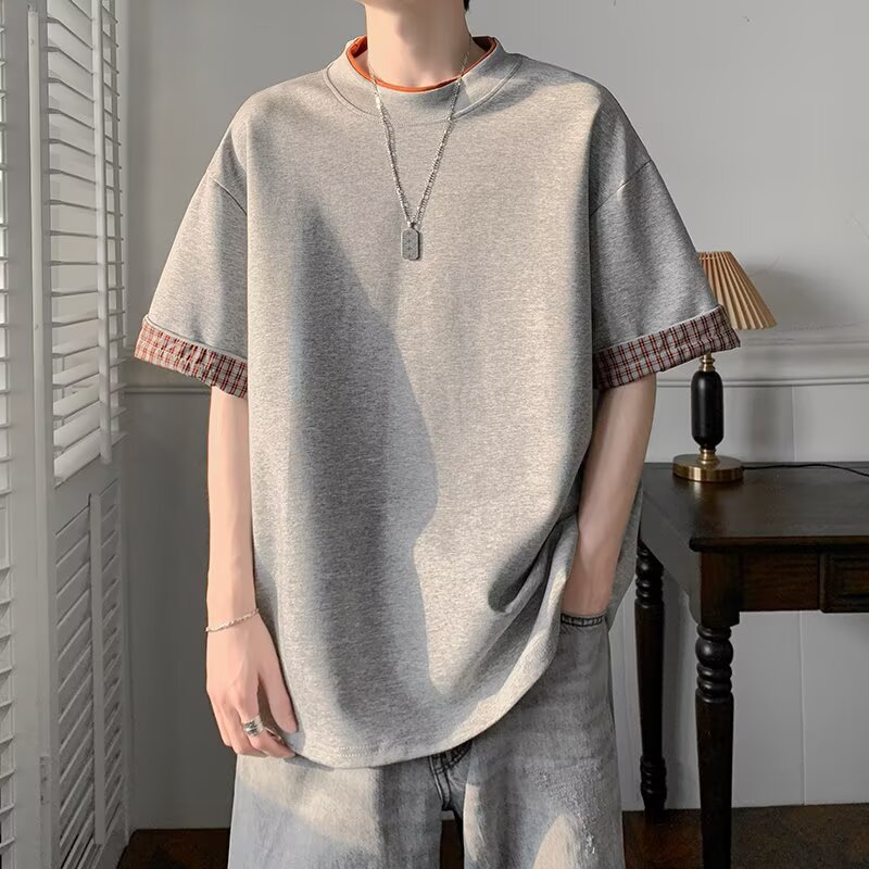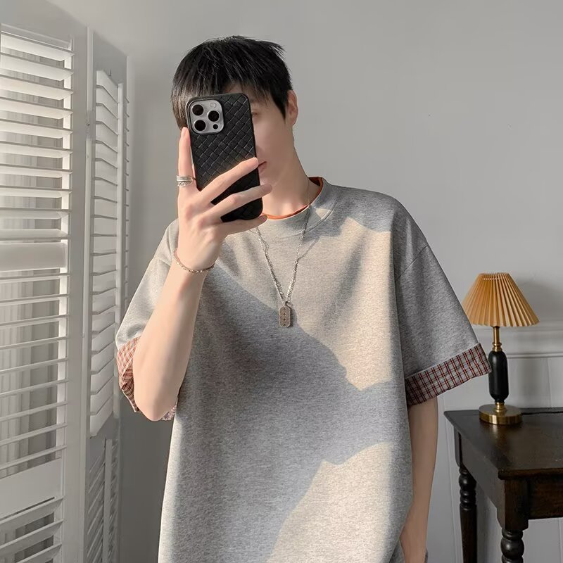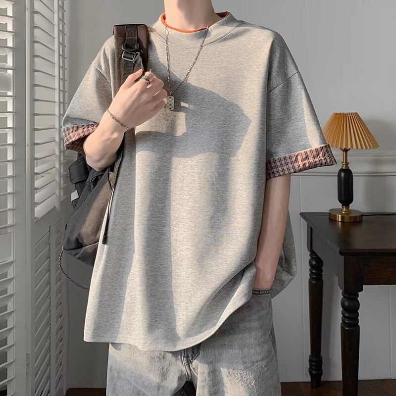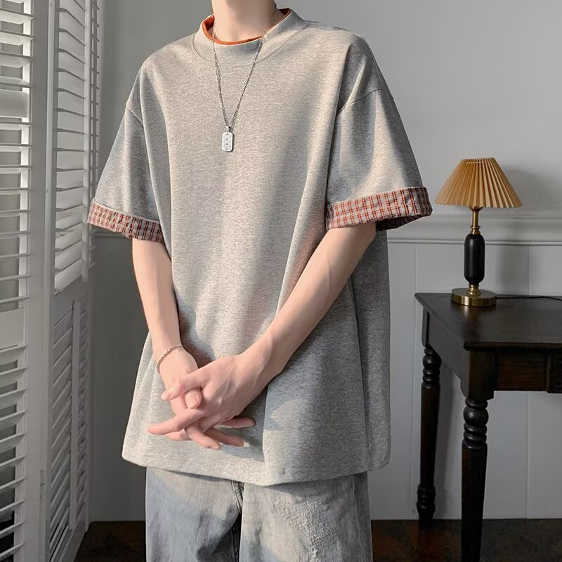 레트로 격자 무늬 커프스 디자인 반팔 티셔츠 남성 여름 신작 일본식 루즈하고 다재다능한 커플 반팔 탑