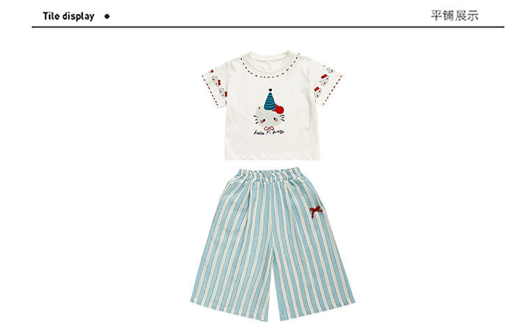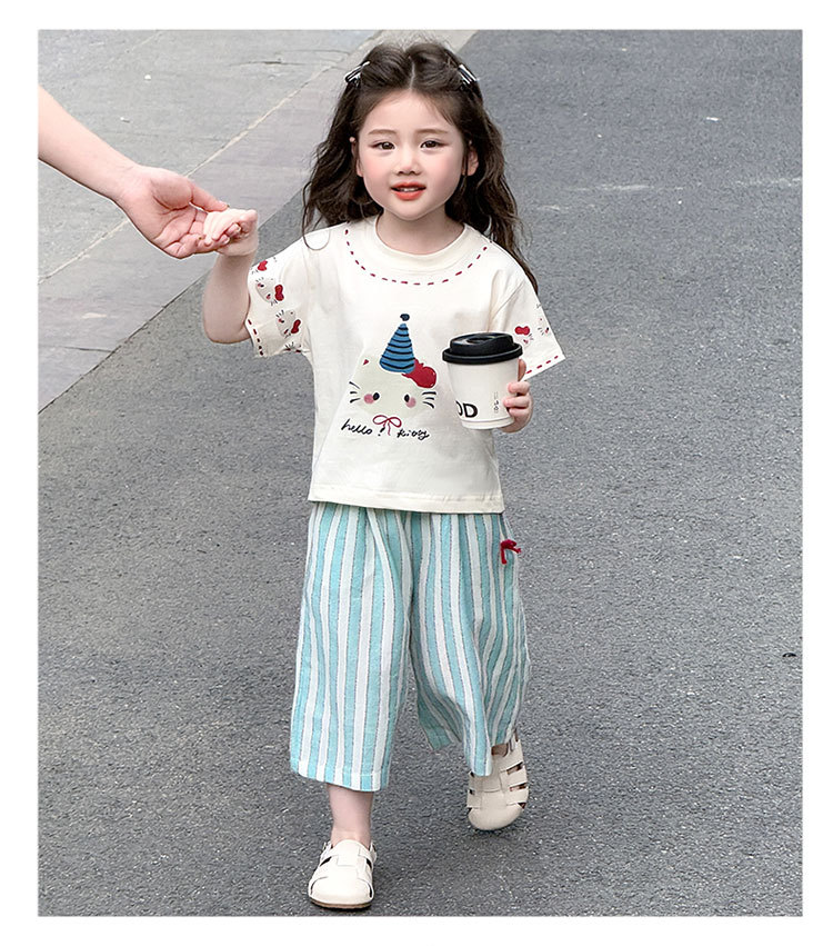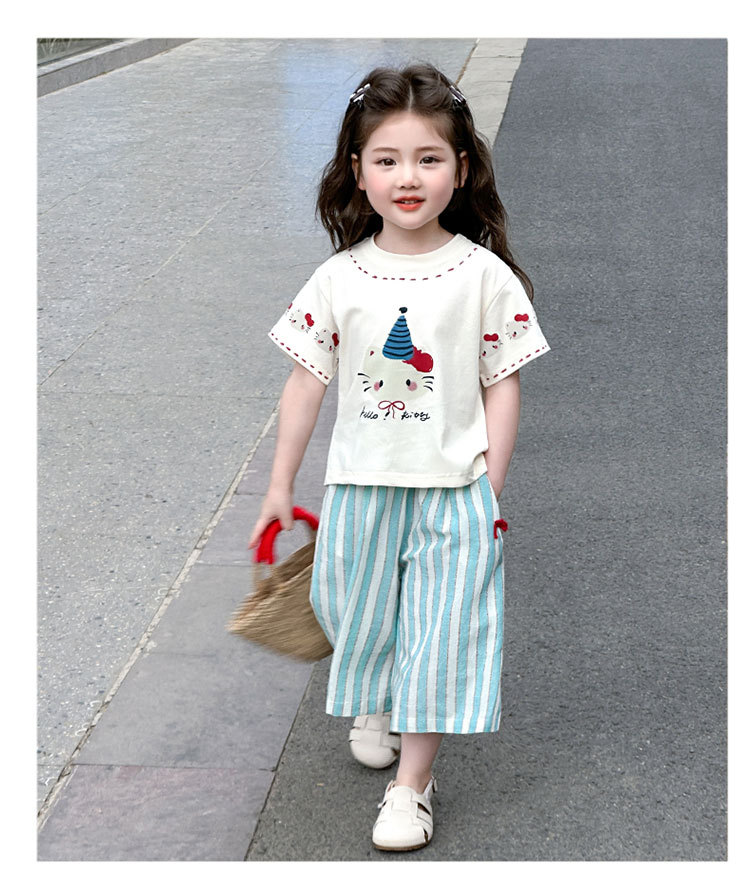 여자 여름 고양이 반팔 양복 2025 새로운 어린이 스타일 만화 탑 스트라이프 와이드 레그 팬츠 투피스 세트스토어 가기