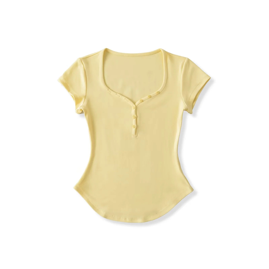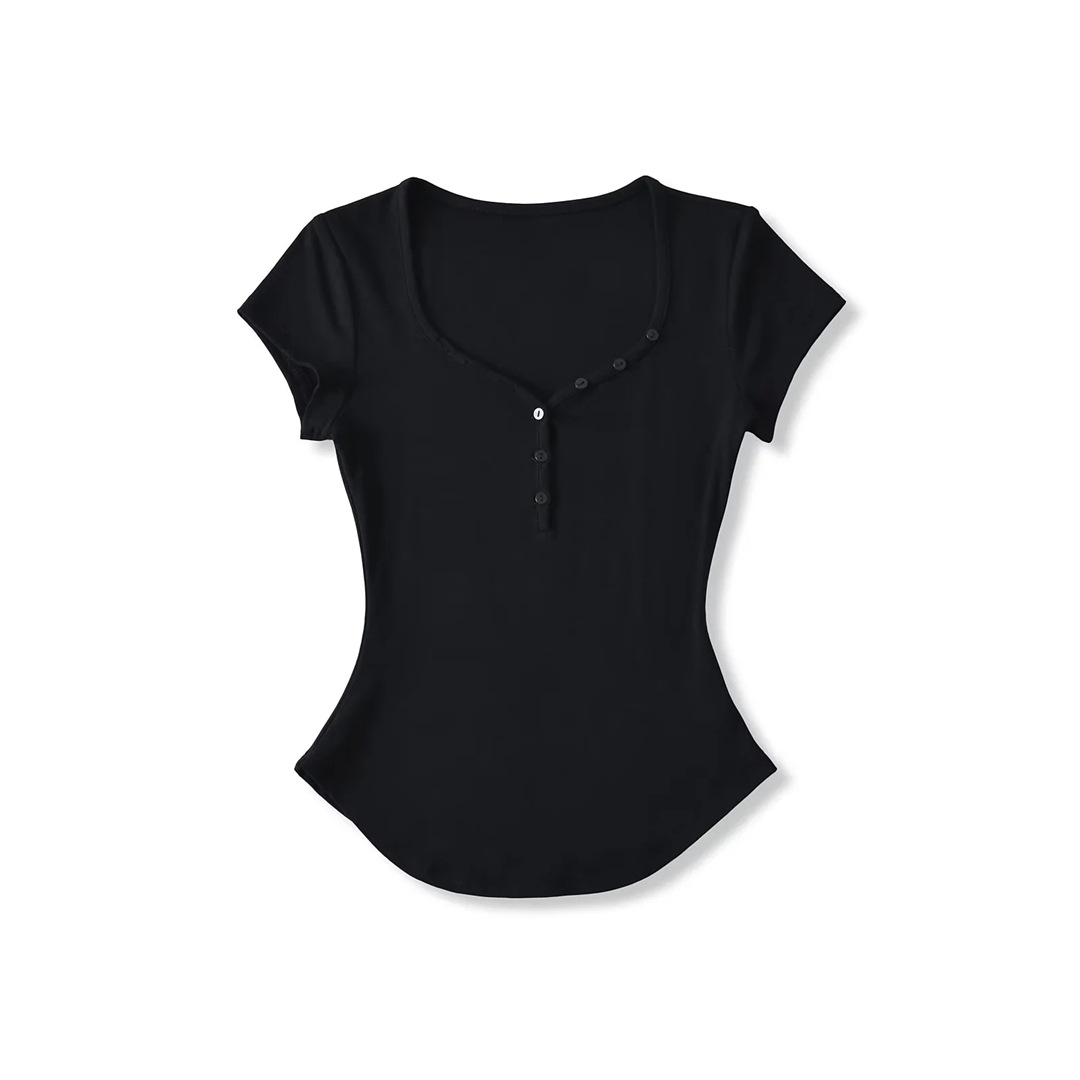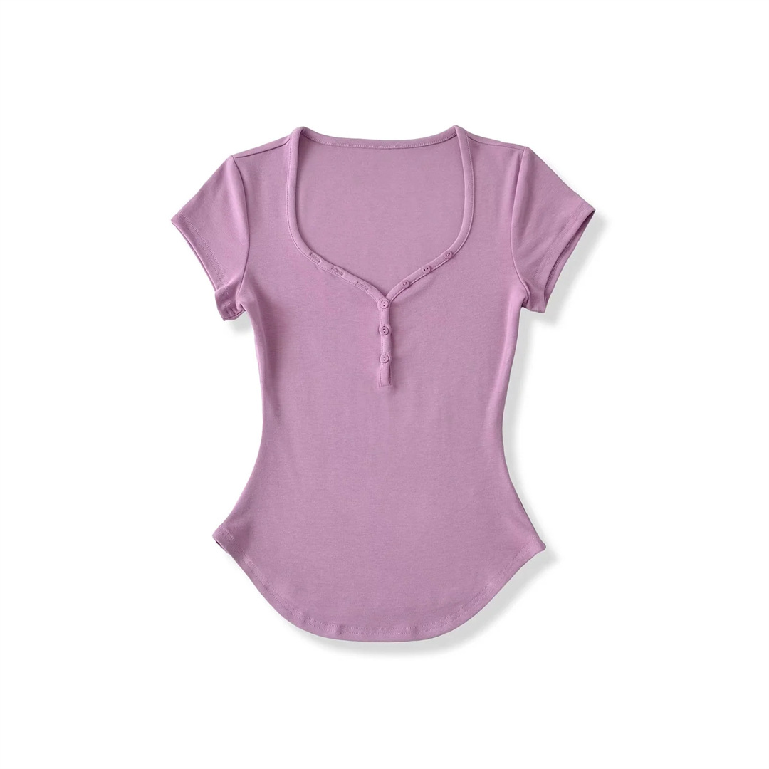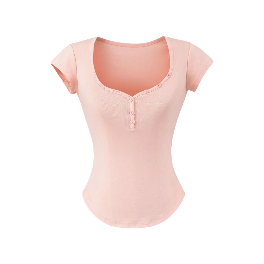 솔리드 컬러 밑단 곡선 반팔 티셔츠 여성용 퓨어 러시 스타일 핫 걸 복숭아 하트 넥 가슴 버튼 슬림 피트 오버 숄더 탑