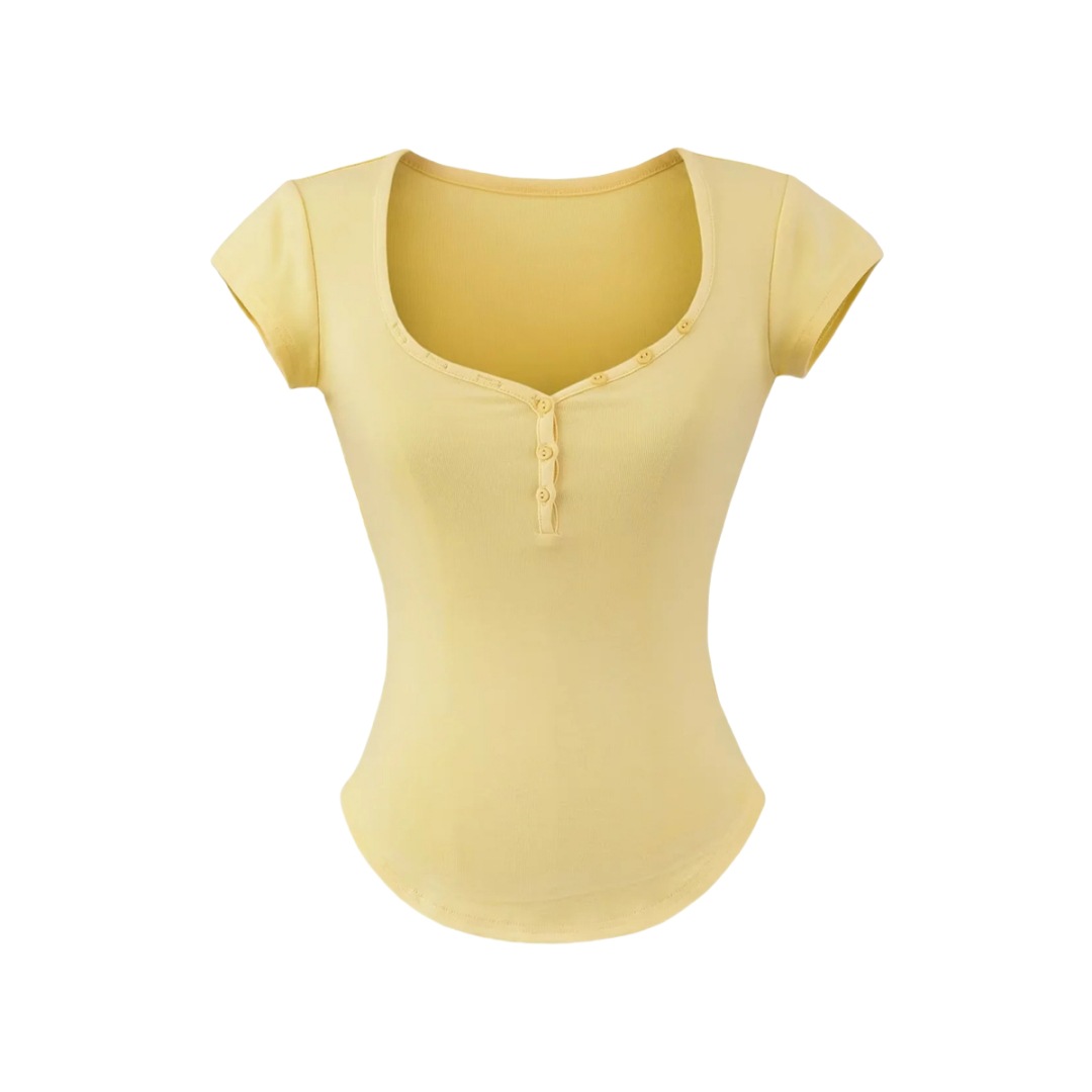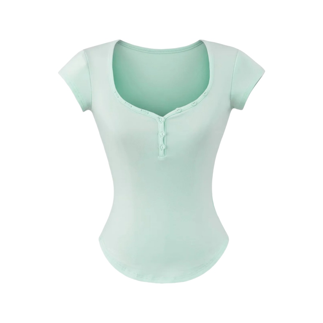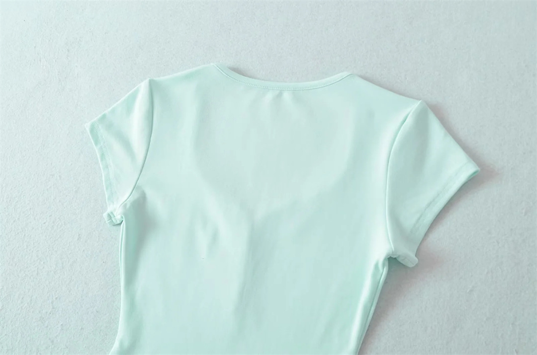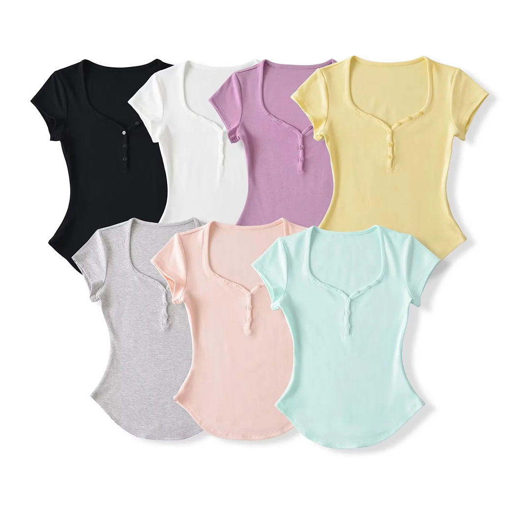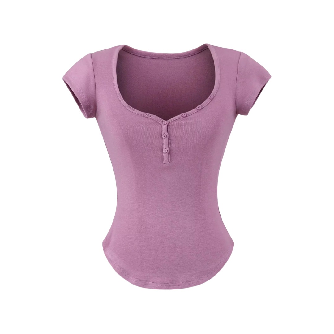 솔리드 컬러 밑단 곡선 반팔 티셔츠 여성용 퓨어 러시 스타일 핫 걸 복숭아 하트 넥 가슴 버튼 슬림 피트 오버 숄더 탑