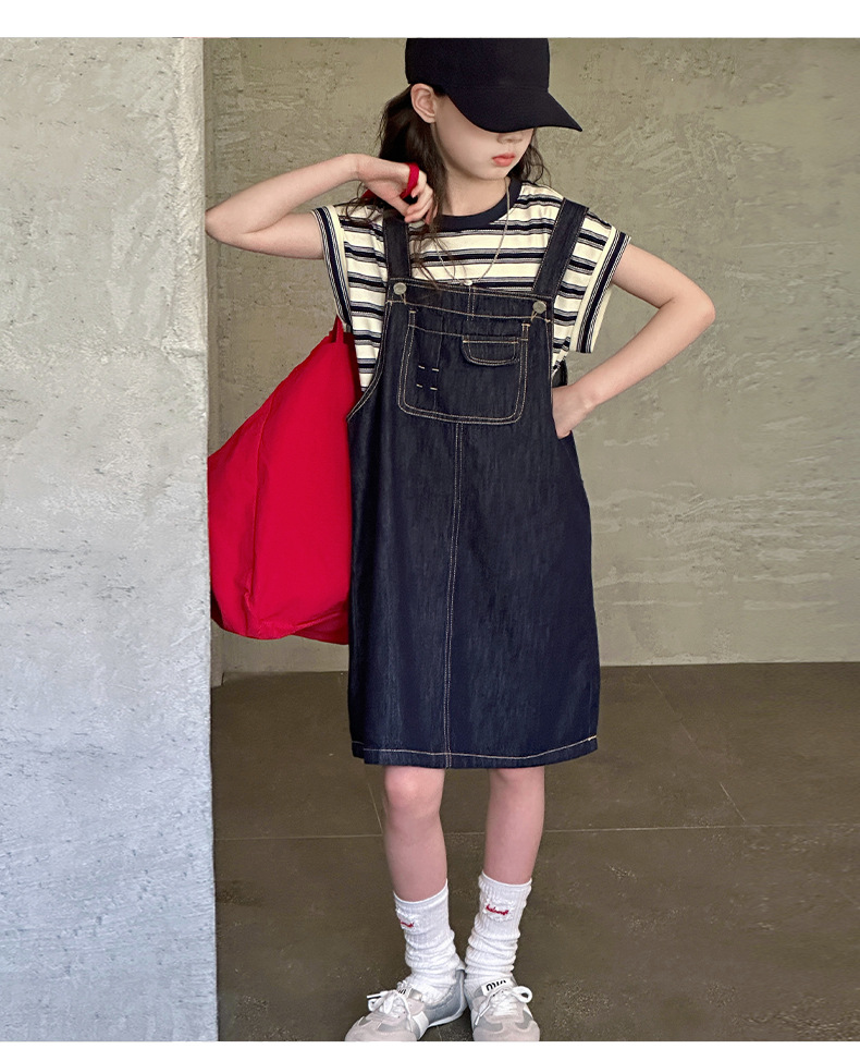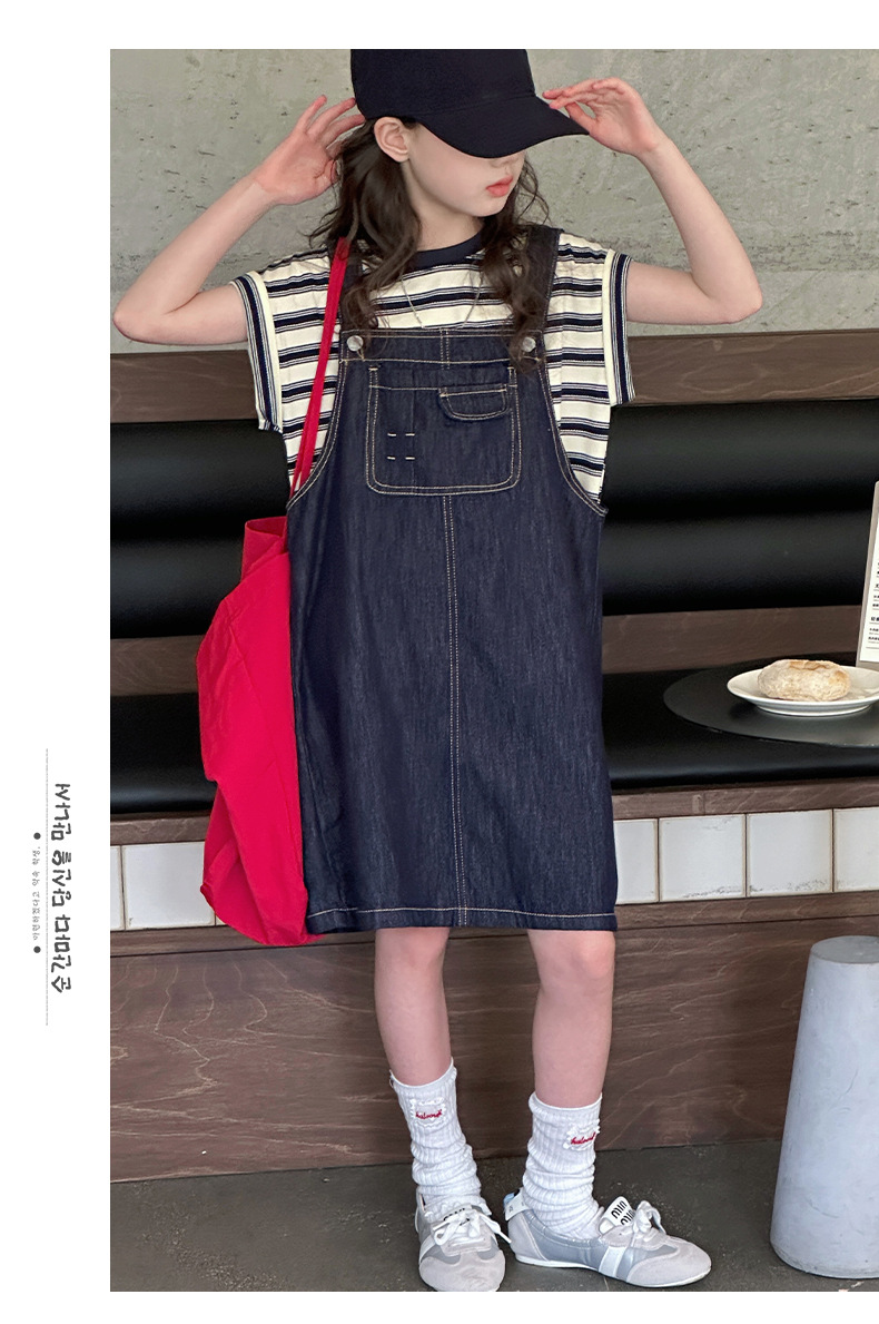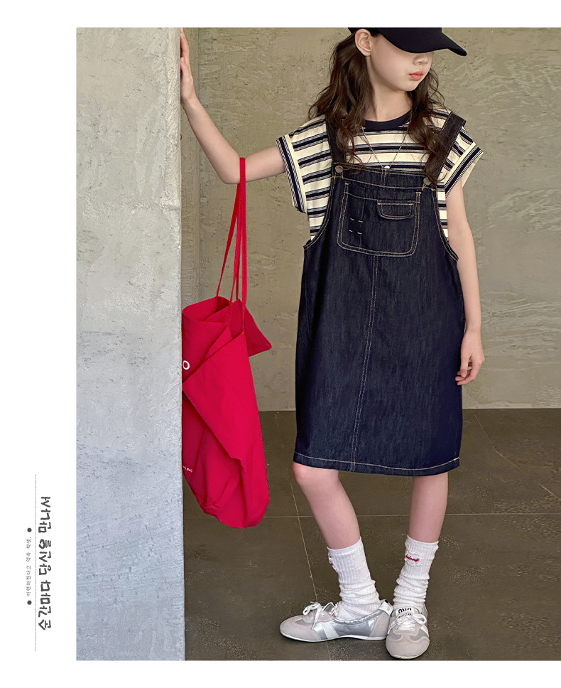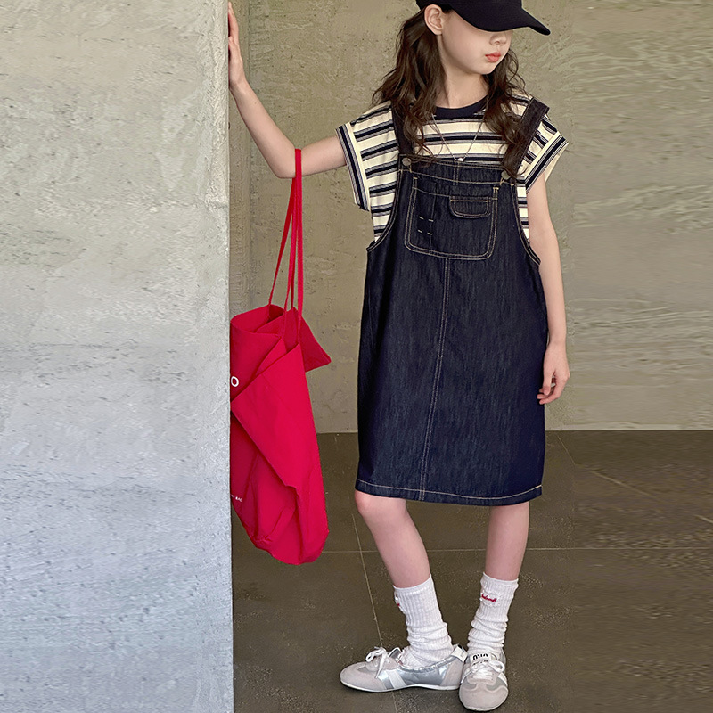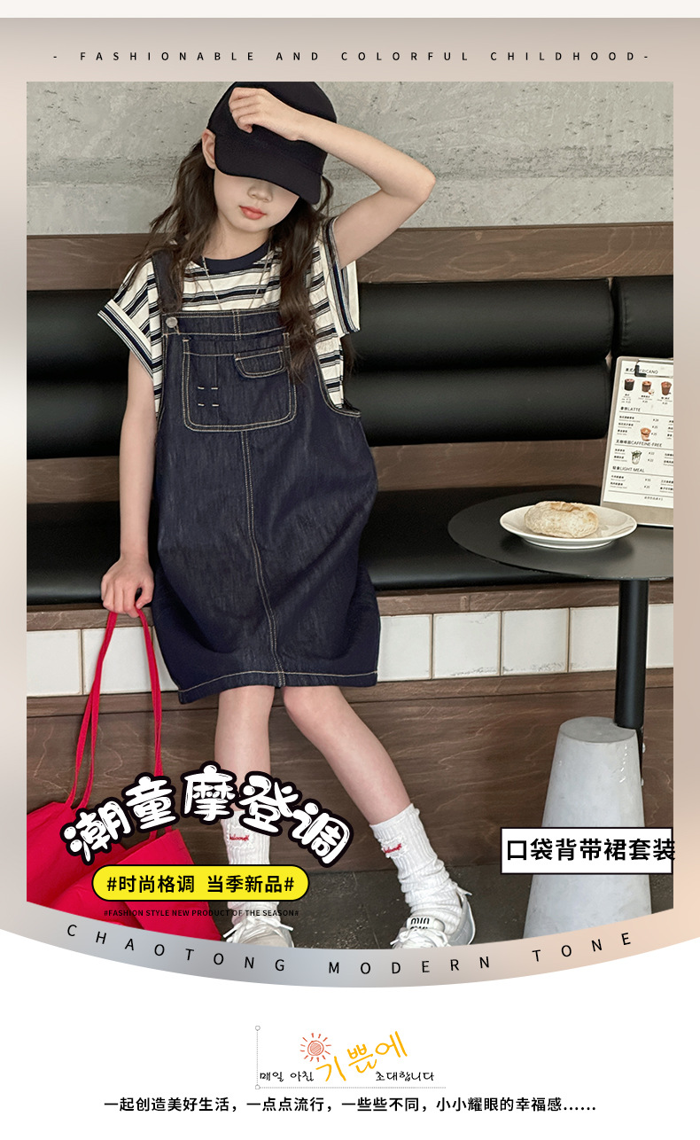 여름 소녀 줄무늬 티셔츠 데님 서스펜더 스커트 세트 아동복 어린이 새 소녀 서스펜더 스커트 투피스 서양식스토어 가기