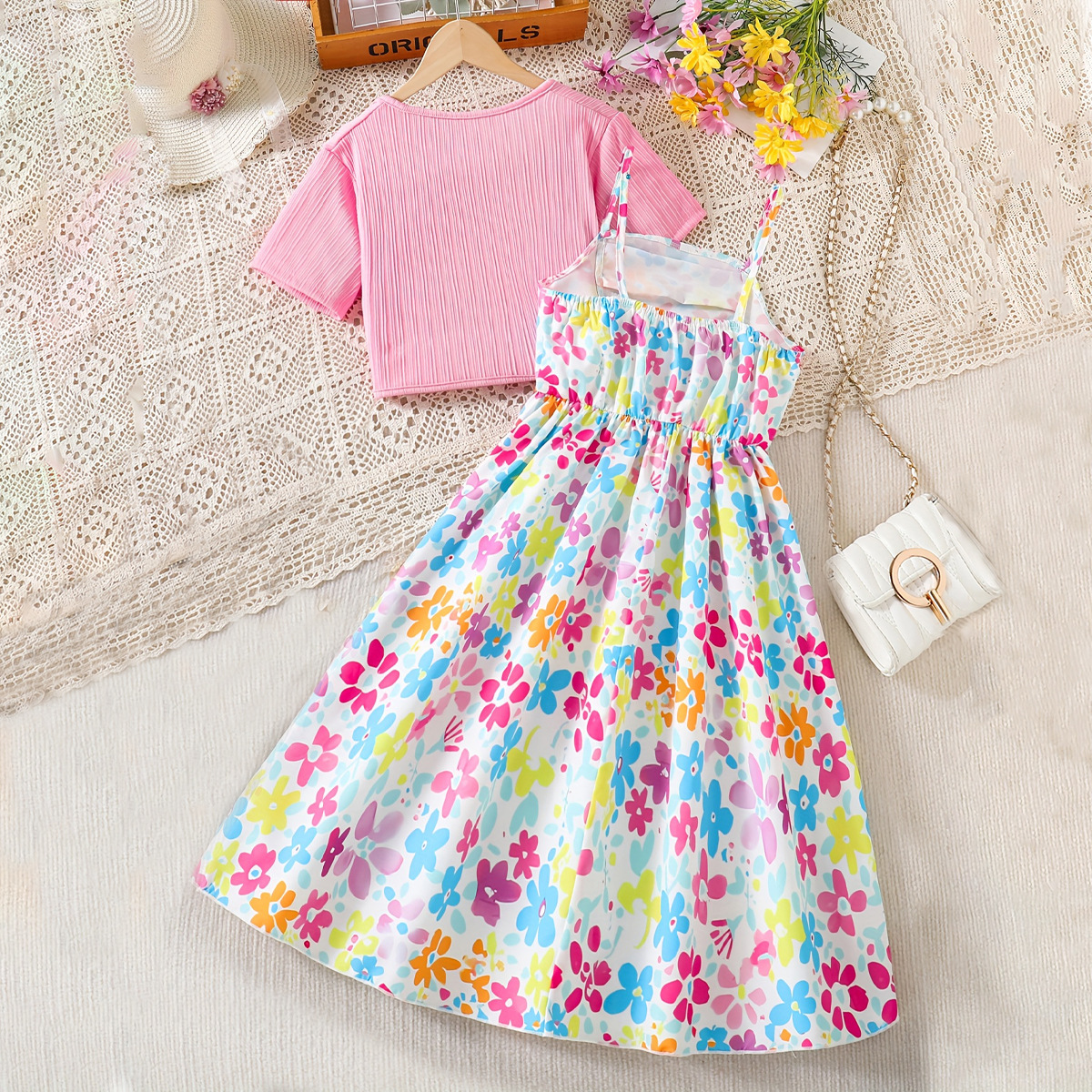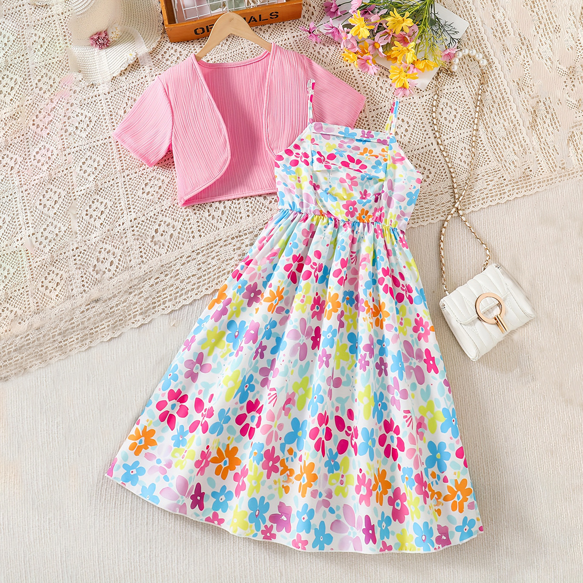 女童套装外贸款欧美碎花满印吊带裙+粉色短袖开衫上衣洋气两件套