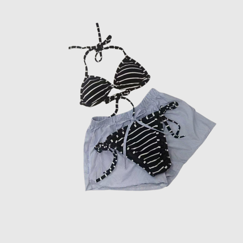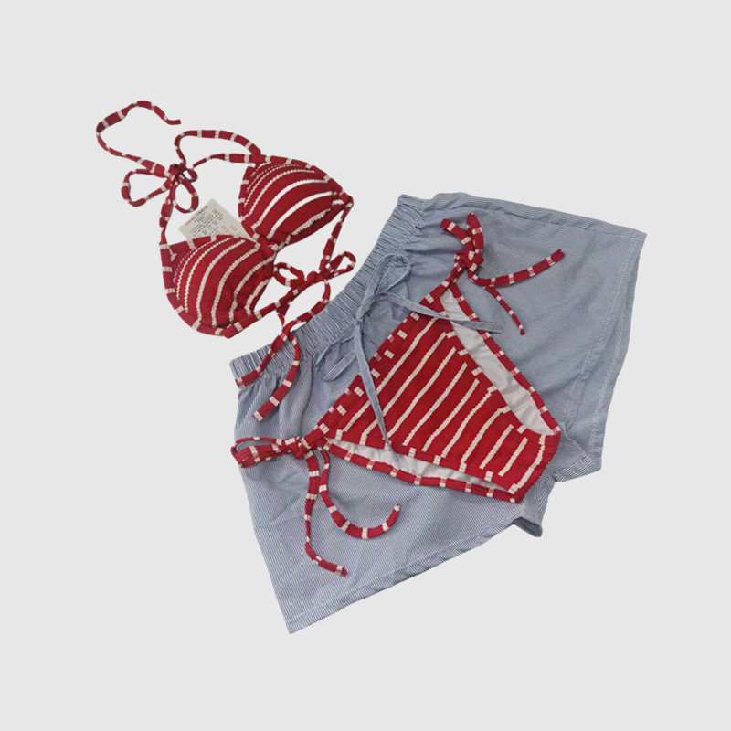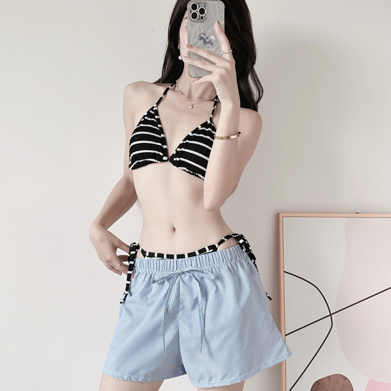 태국 홀리데이 스플릿 비키니 3 피스 세트 섹시한 스파이스 걸스 스트라이프 심플 루즈 반바지 여성용 온천 수영복