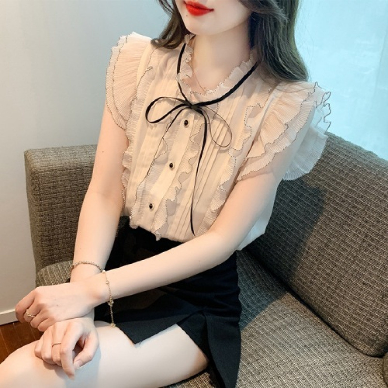 여성용 프렌치 슈퍼 요정 보우 타이 쉬폰 셔츠, 틈새 디자인, 나이를 줄여주는 플라잉 슬리브스토어 가기
