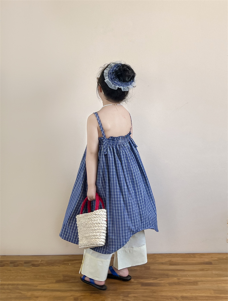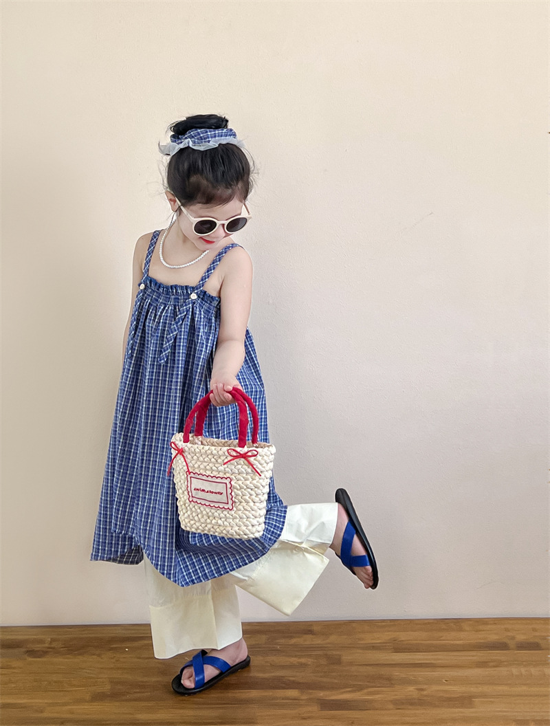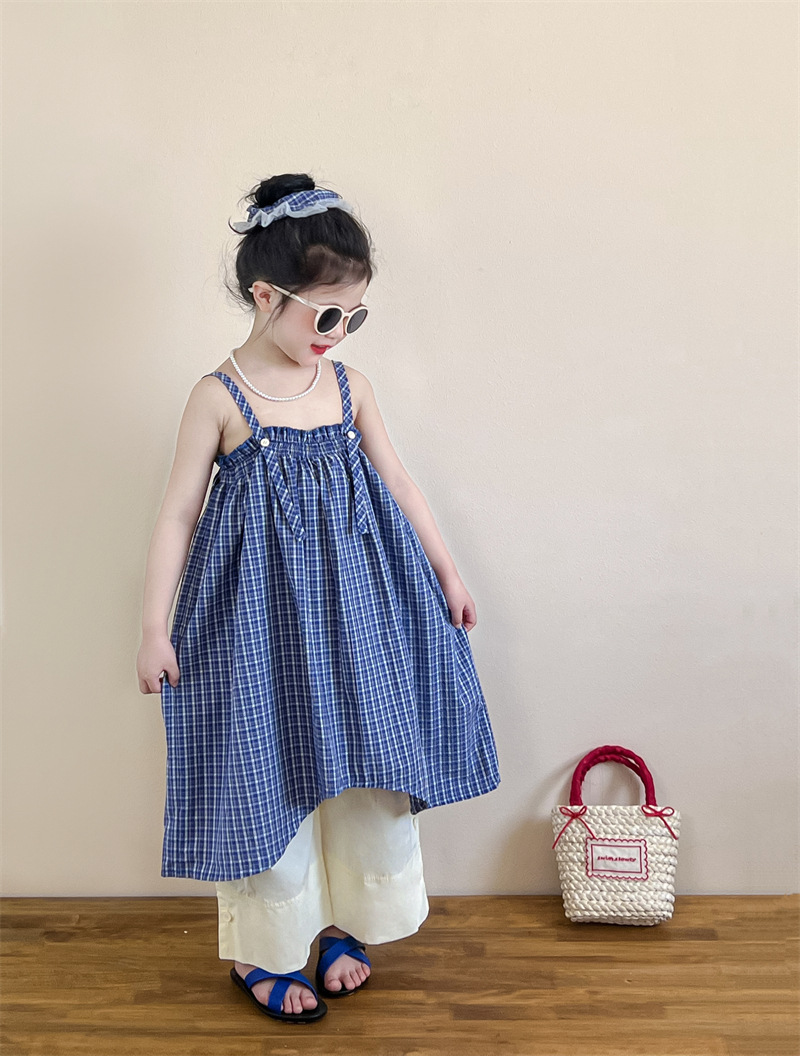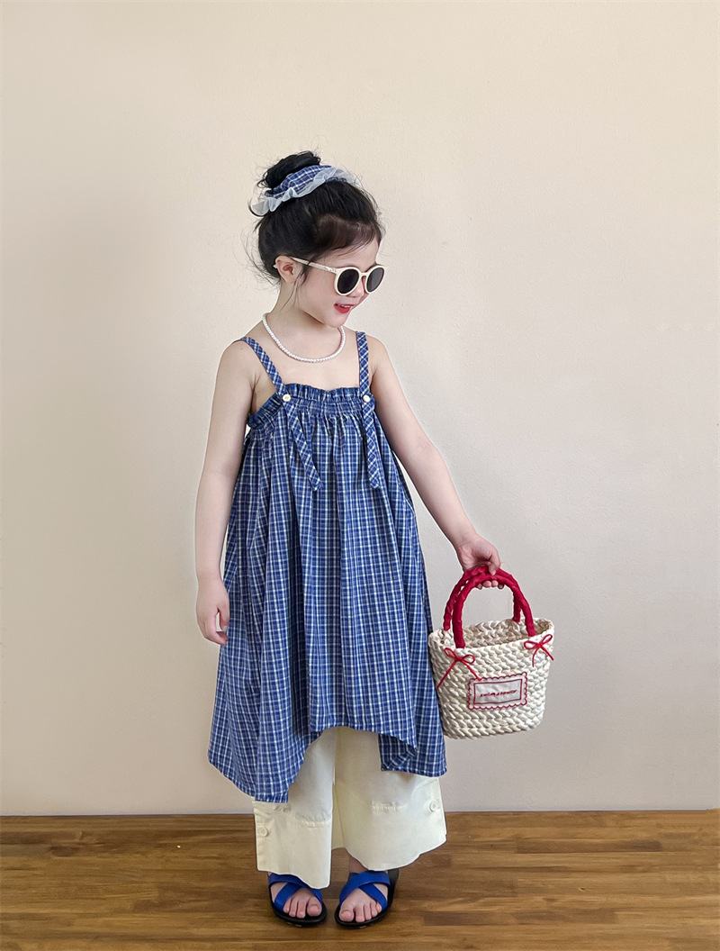 헤어 링 ~ 소녀 여름 블루 격자 불규칙한 슬링 스커트 버튼 넓은 다리 바지 세트스토어 가기