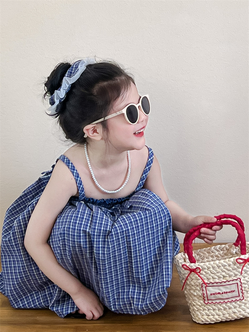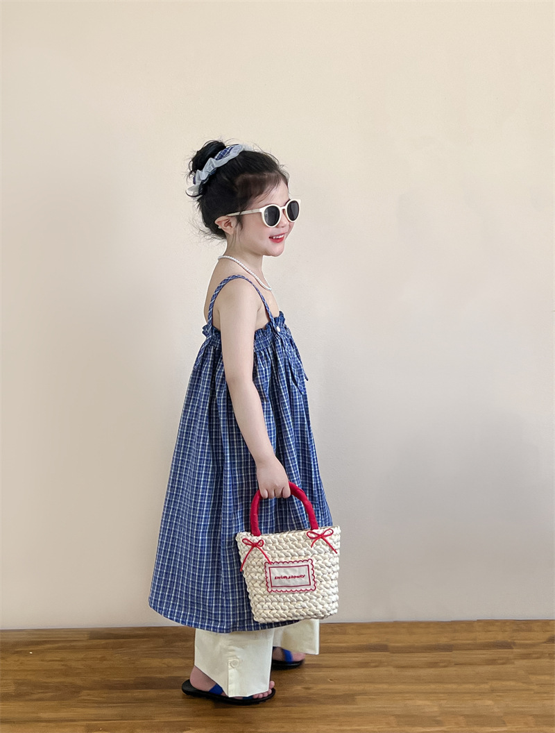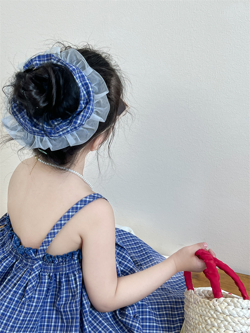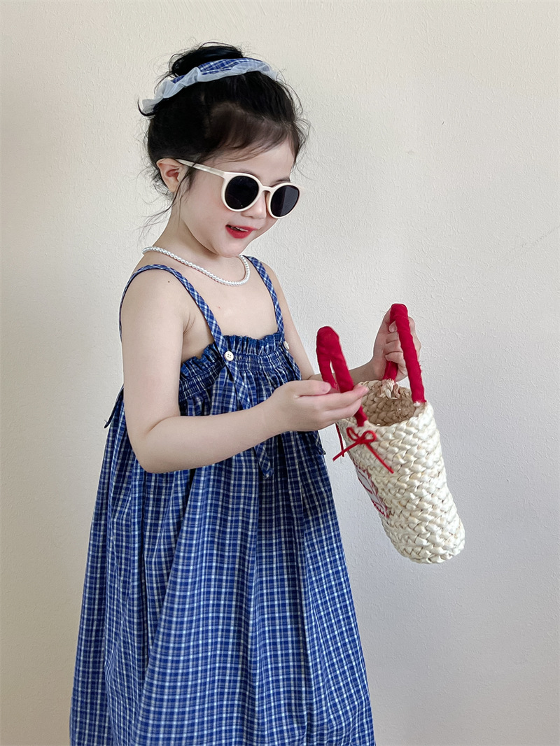 헤어 링 ~ 소녀 여름 블루 격자 불규칙한 슬링 스커트 버튼 넓은 다리 바지 세트스토어 가기