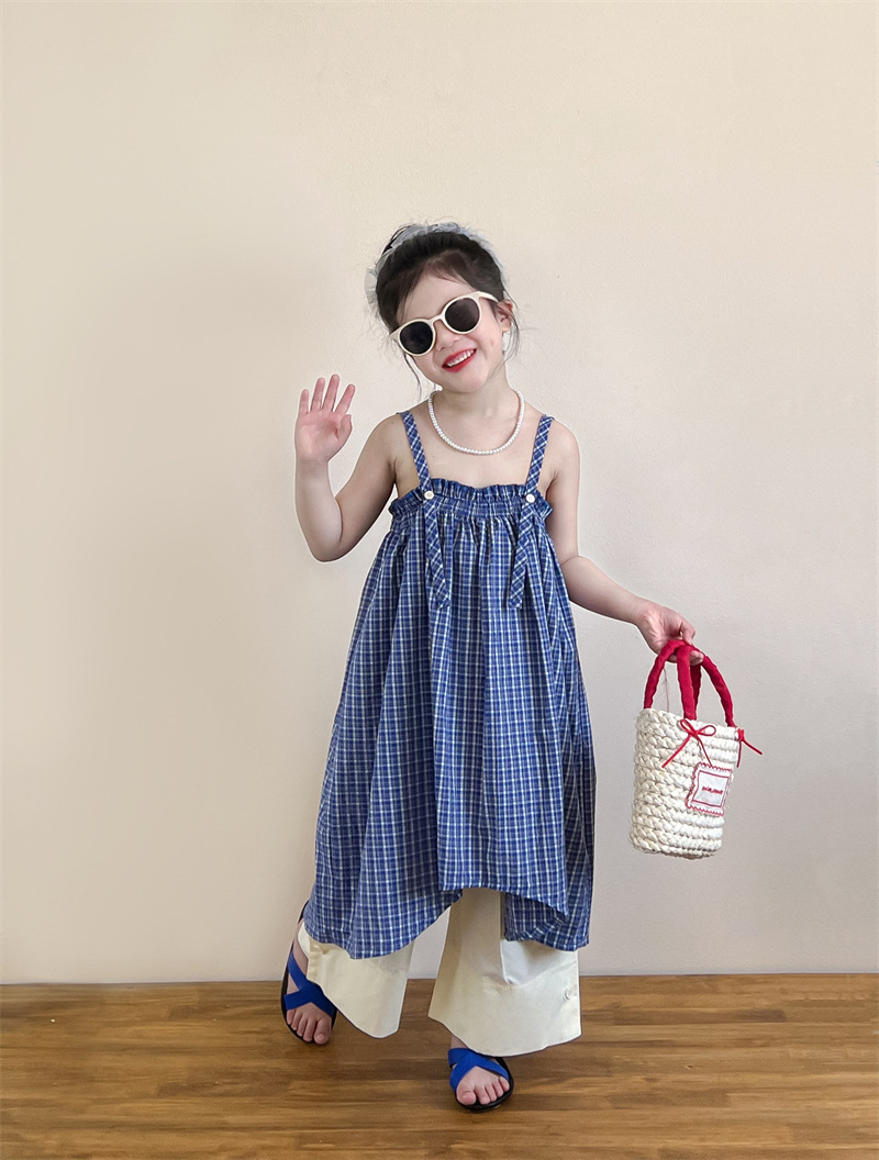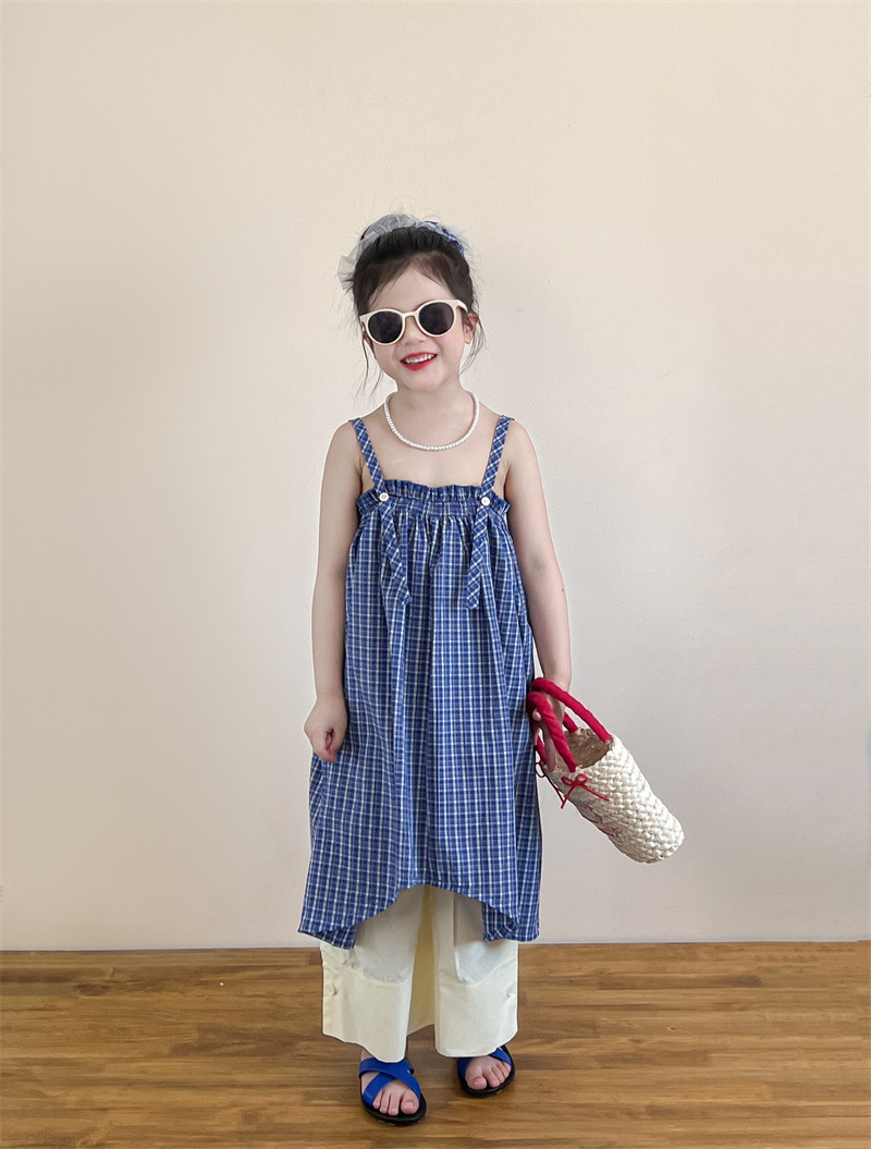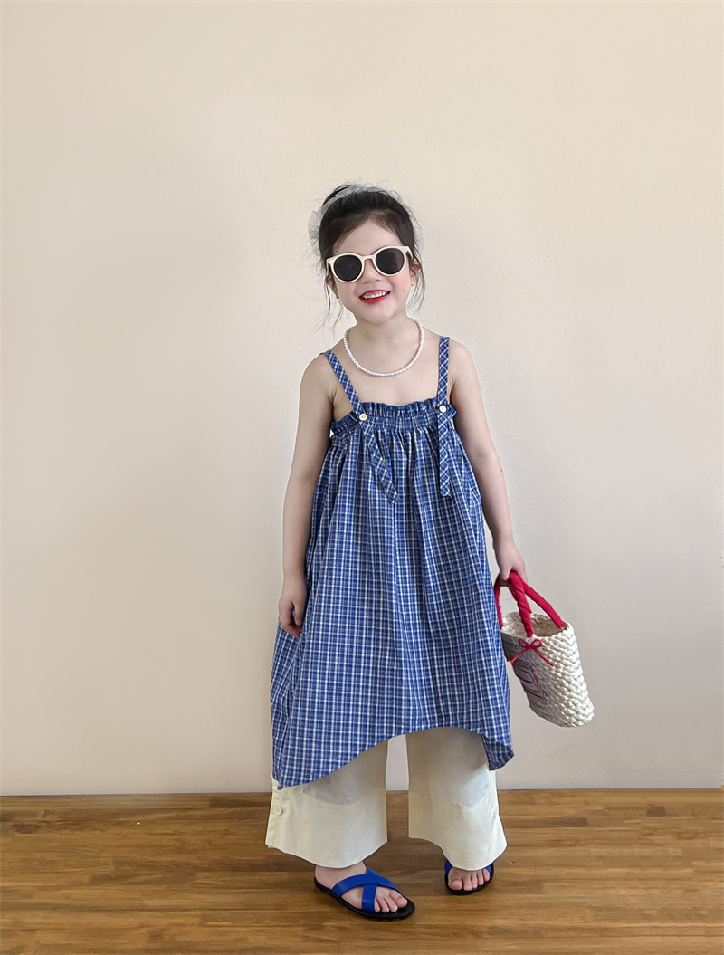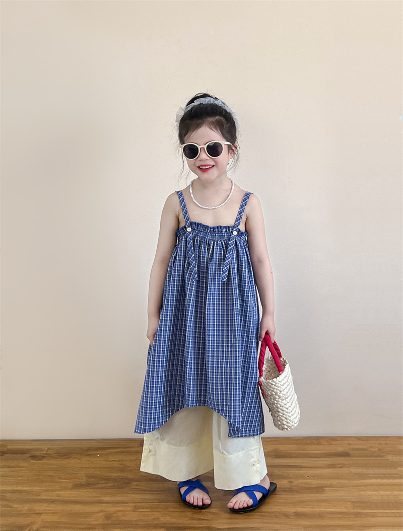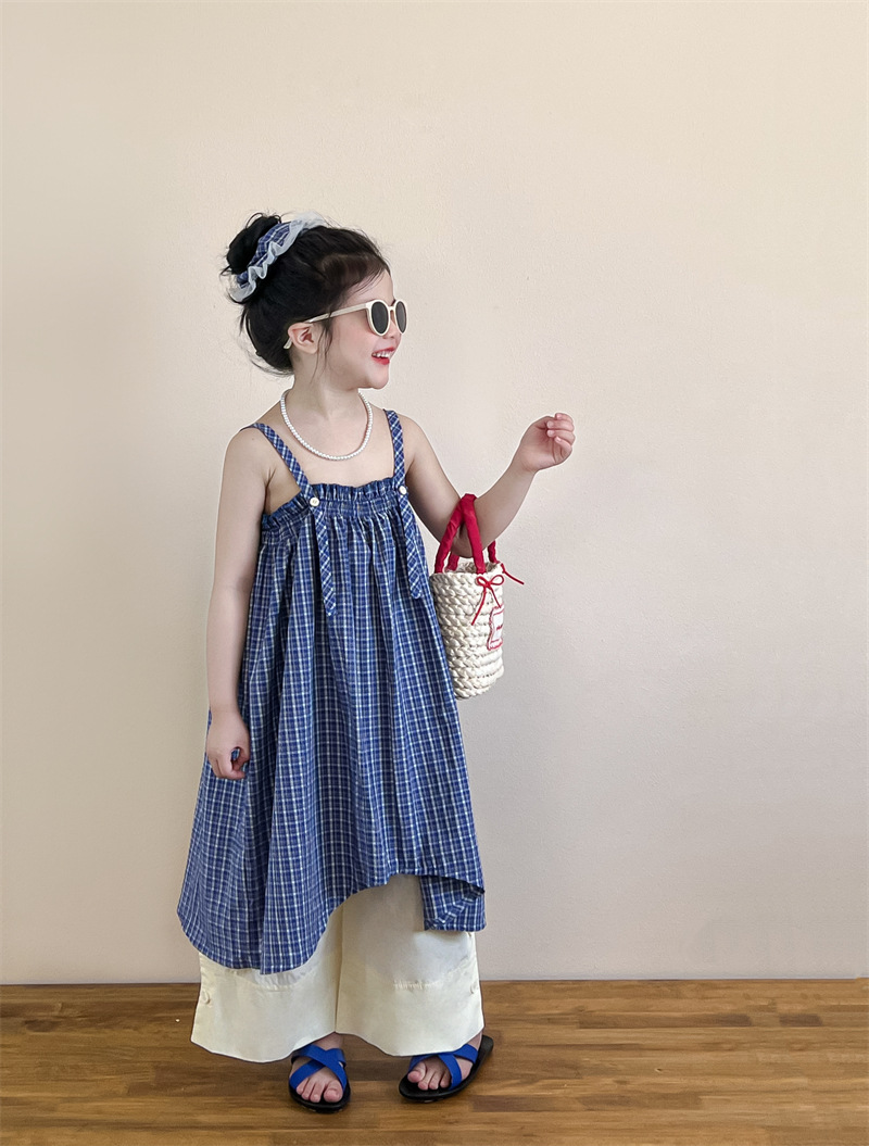 헤어 링 ~ 소녀 여름 블루 격자 불규칙한 슬링 스커트 버튼 넓은 다리 바지 세트