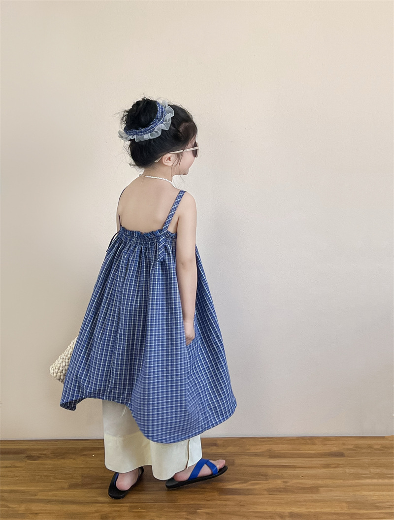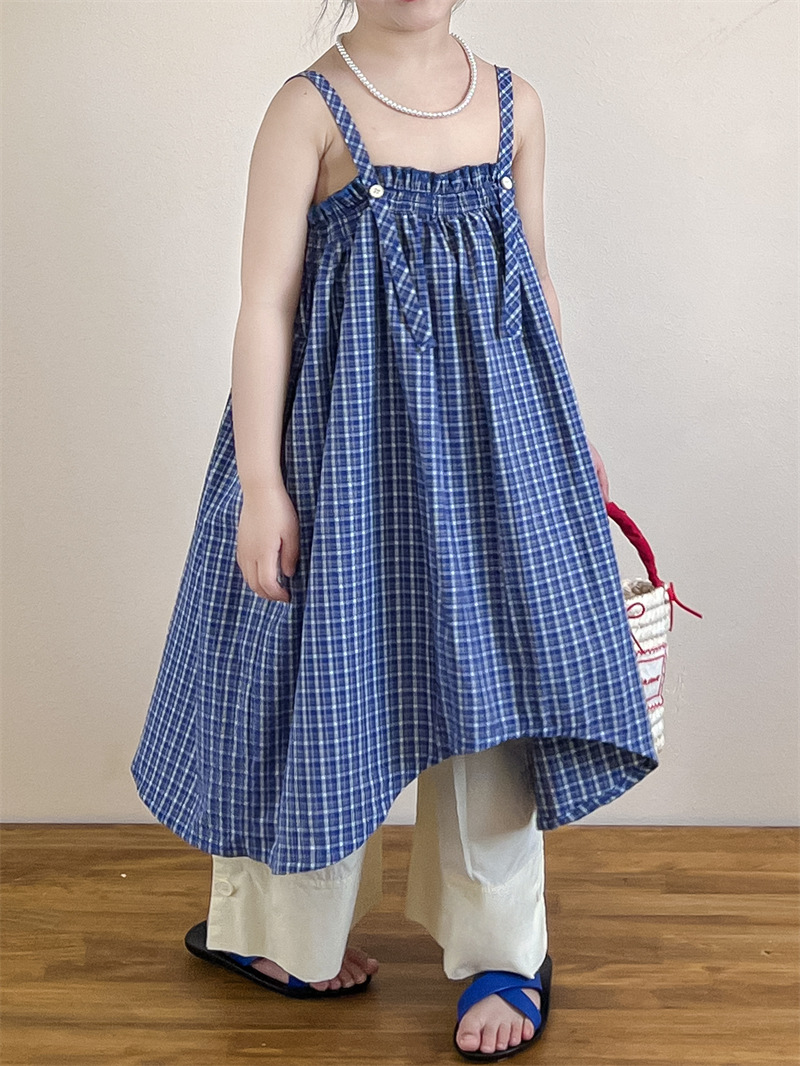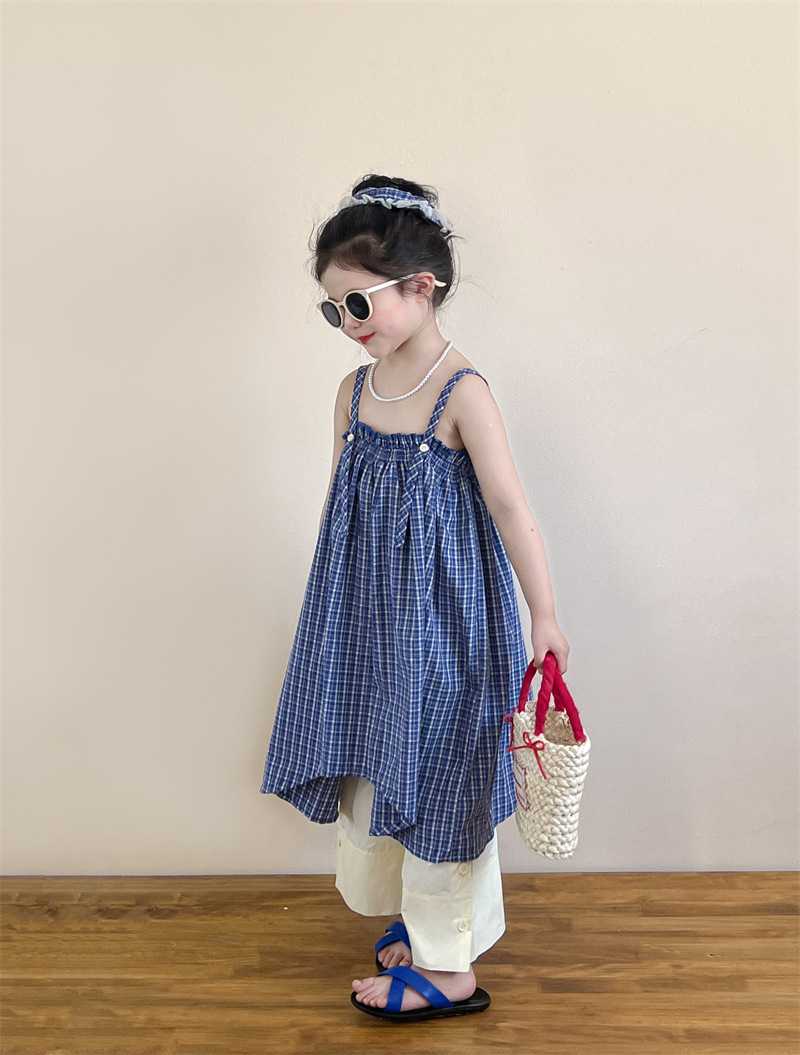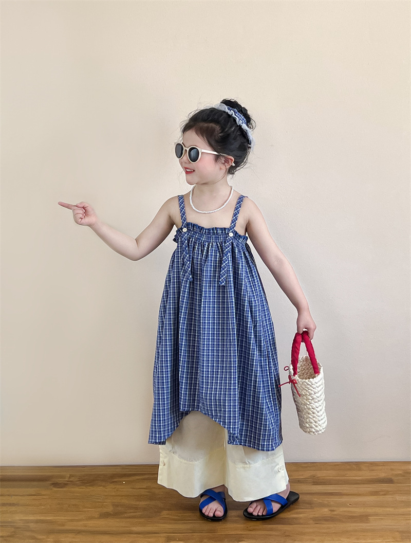 헤어 링 ~ 소녀 여름 블루 격자 불규칙한 슬링 스커트 버튼 넓은 다리 바지 세트