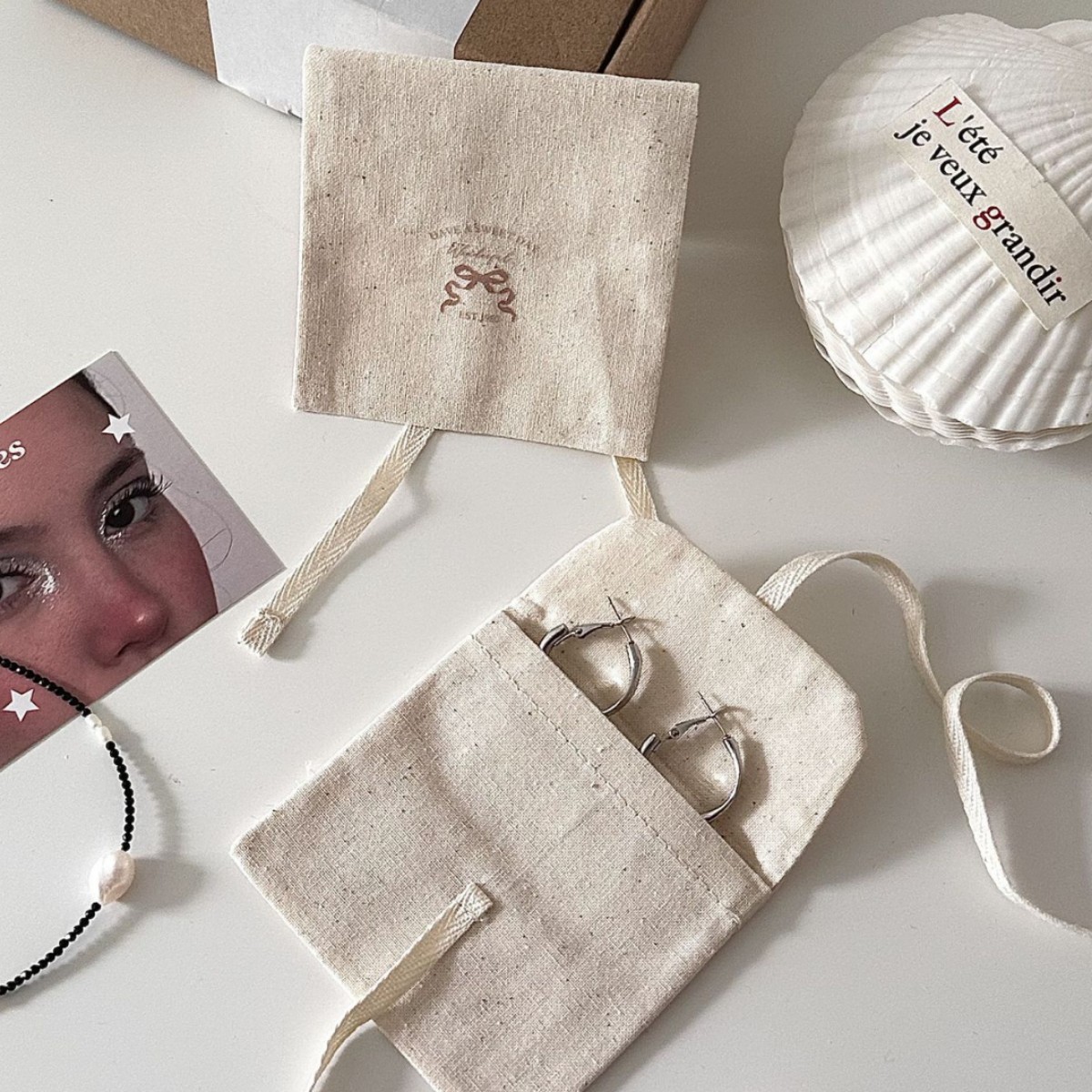 작은 활 끈면 및 린넨 보관 가방 선물 크리스탈 보석 선물 포장 가방 사진 소품스토어 가기