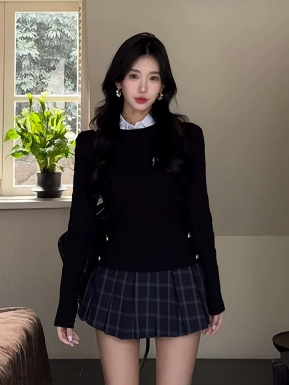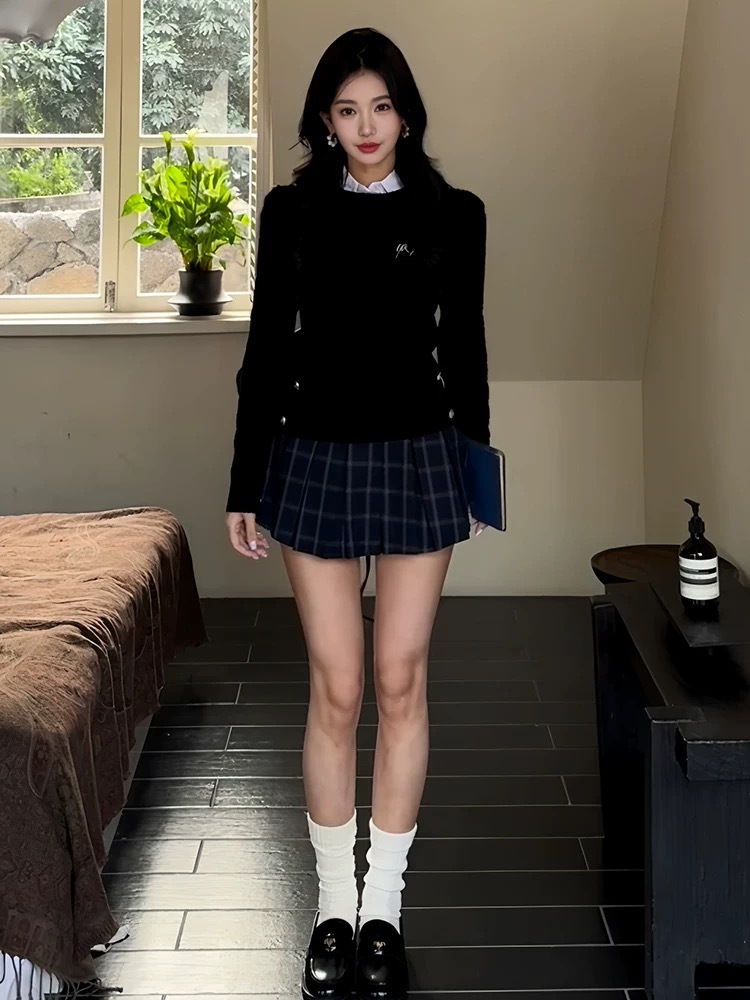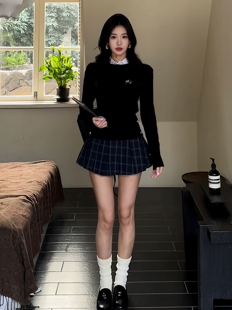• 니트 스웨터 + 체크 무늬 스커트 (고품질)