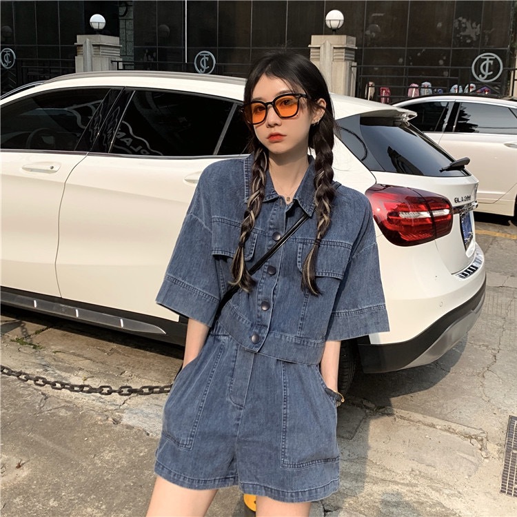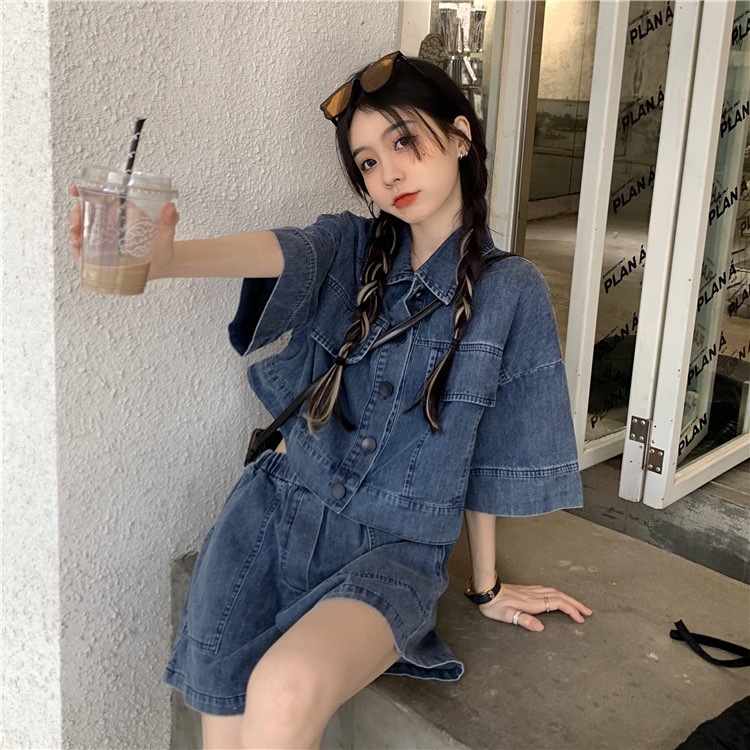 여성을위한 연령 감소 기질 반팔 셔츠 데님 정장 2025 여름 새로운 대형 반바지 재킷 투피스 세트스토어 가기