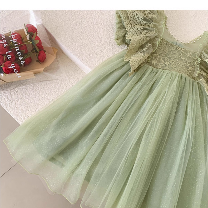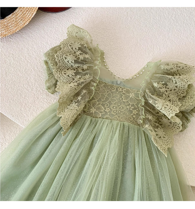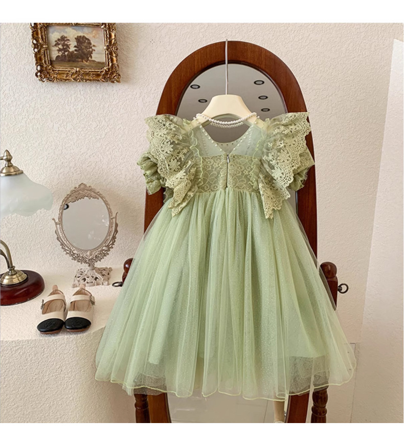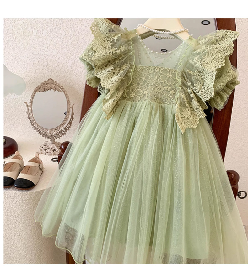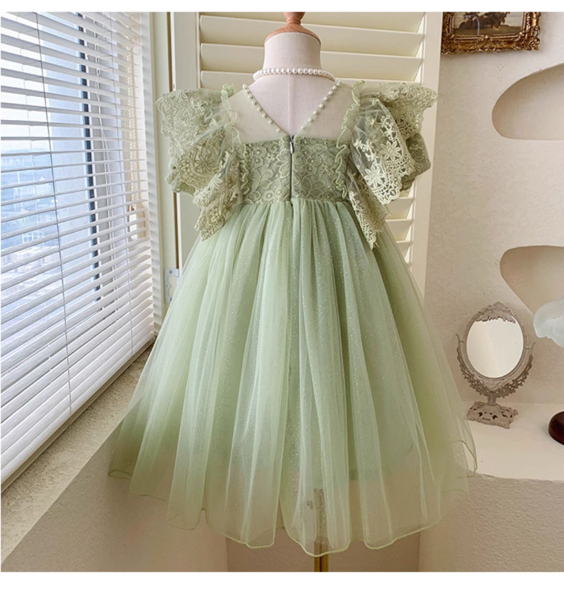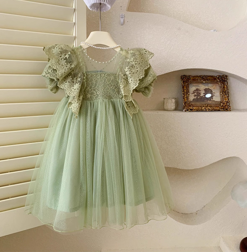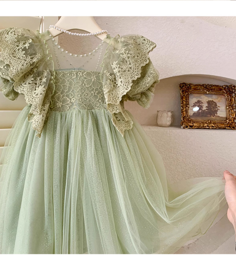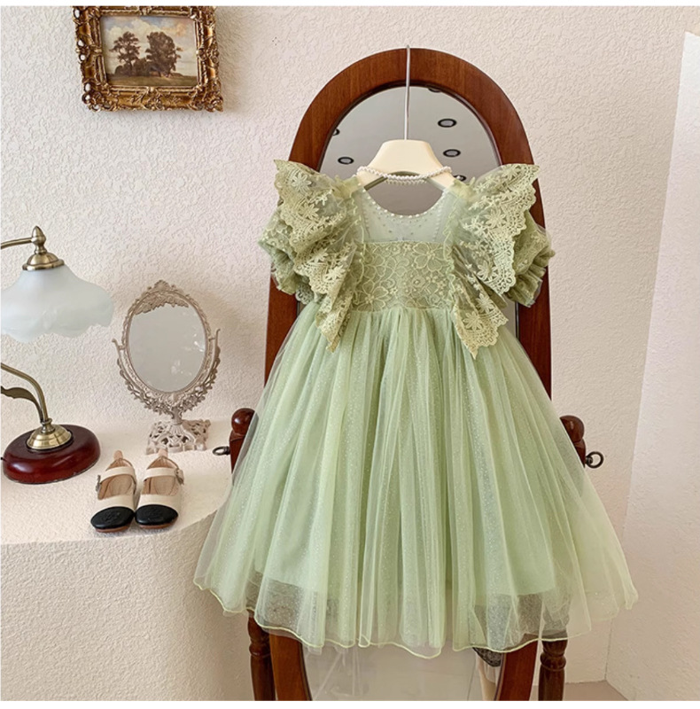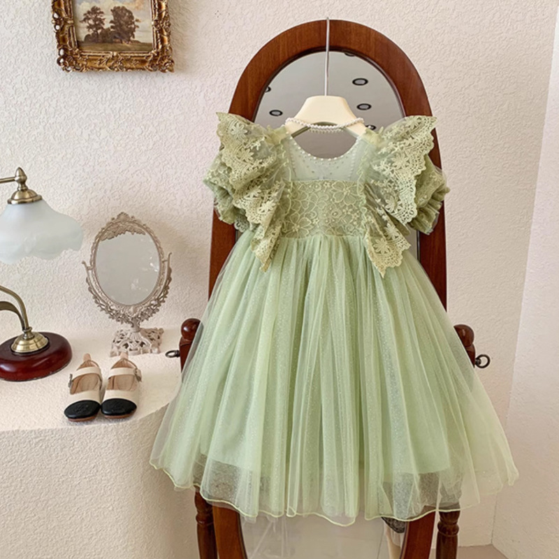 한국 소녀 드레스 여름 어린 소녀 녹색 메쉬 요정 드레스 아기 유행 레이스 푹신한 공주 드레스