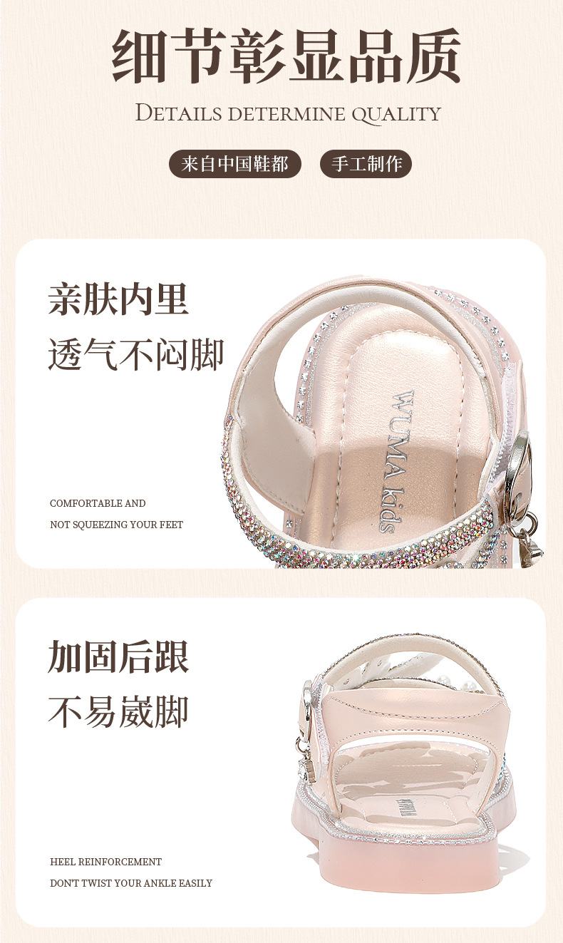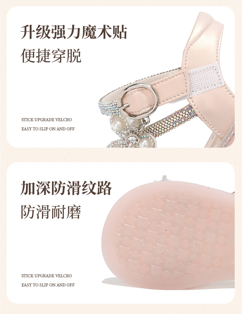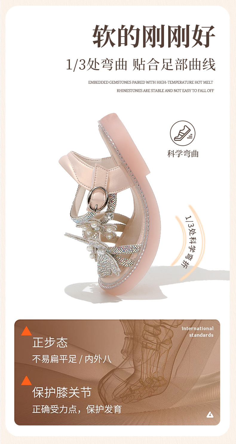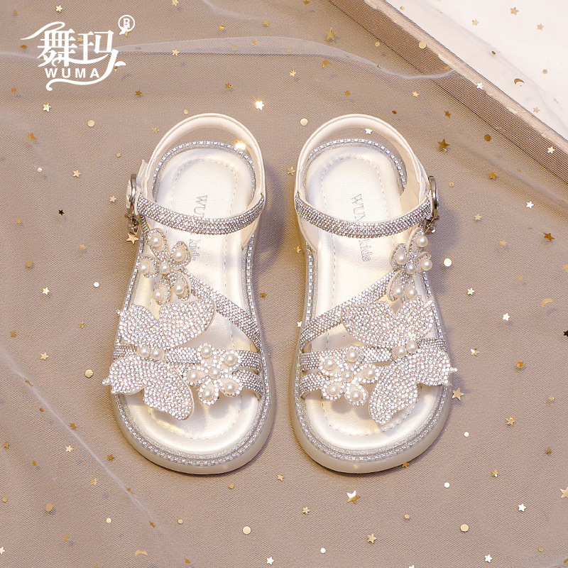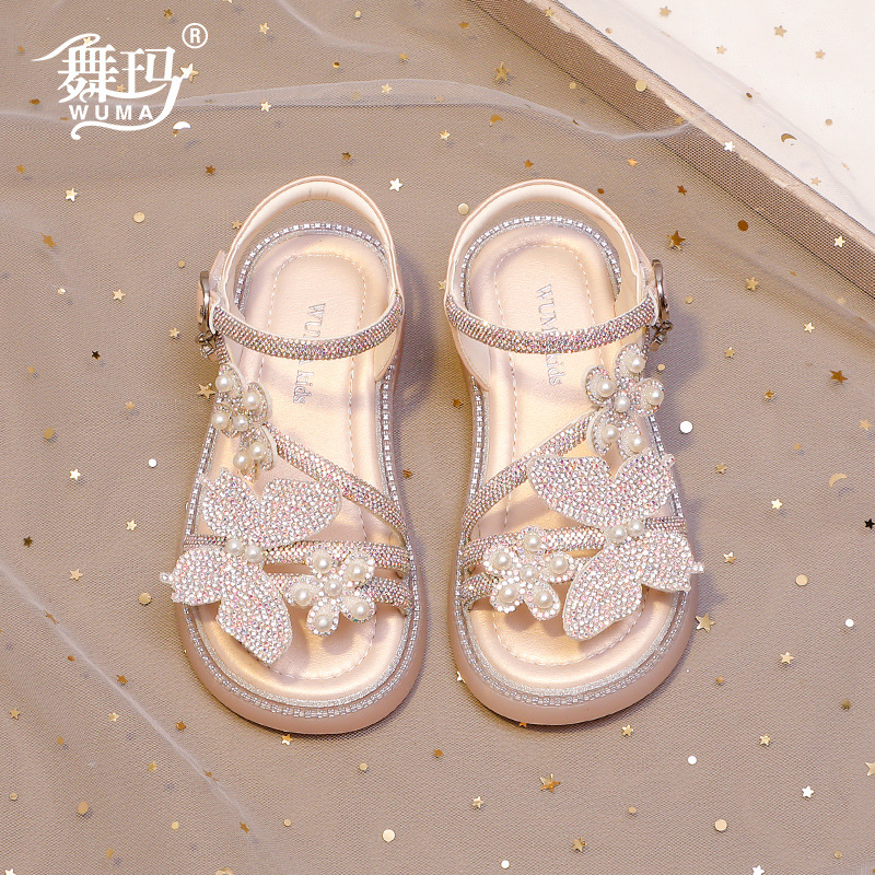 마우마 소녀 샌들 어린이 신발 2025 새로운 여름 작은 소녀 진주 나비 오픈 발가락 크리스탈 공주 신발