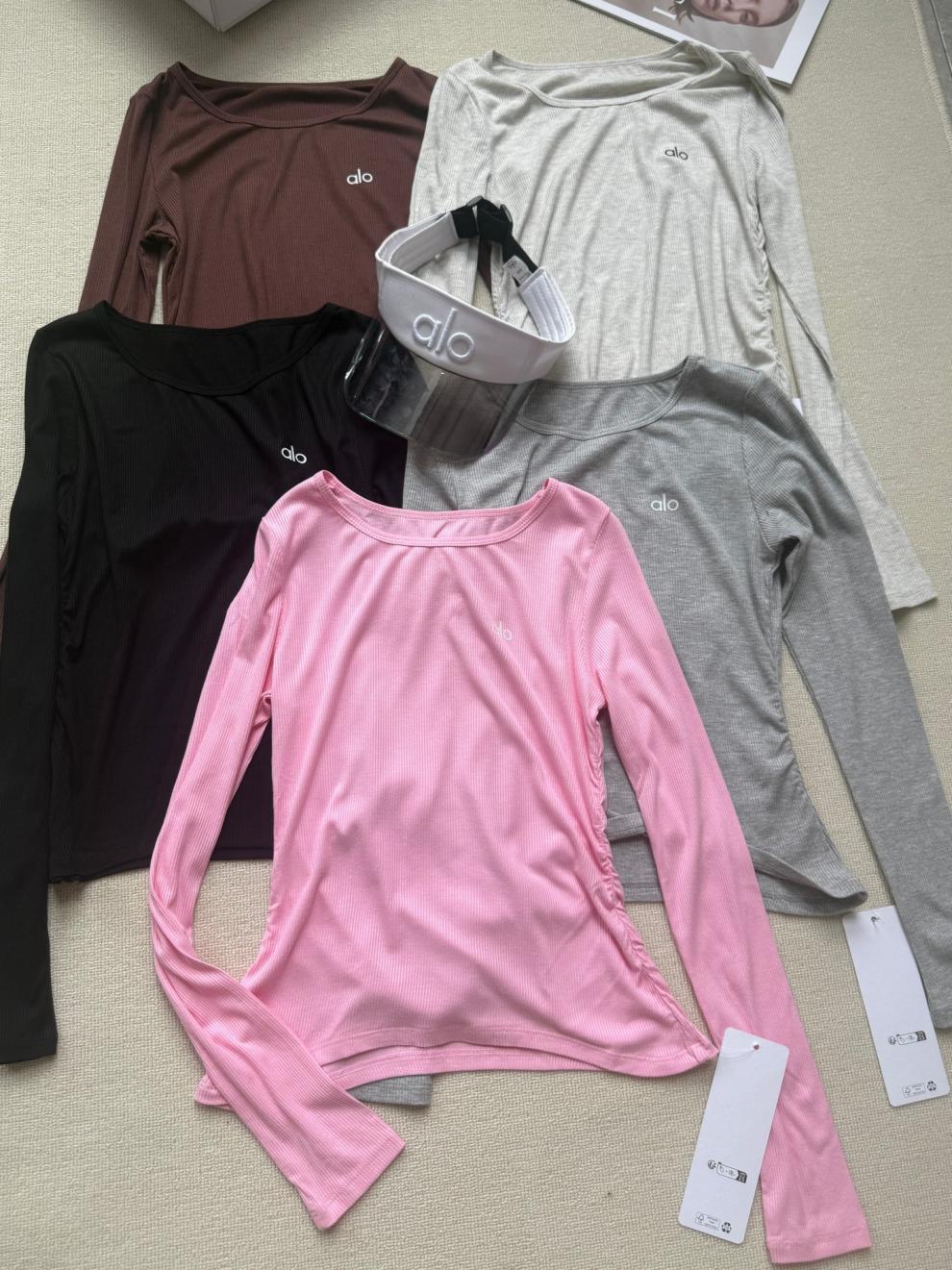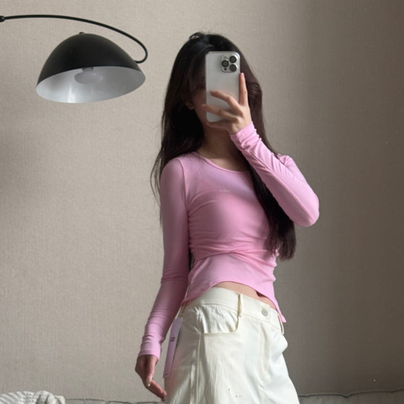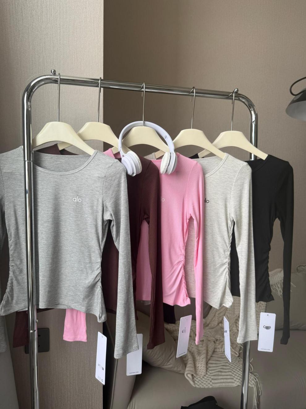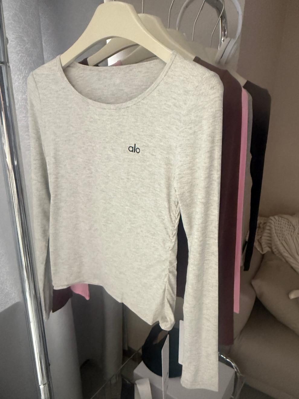 Alo 요가 의류 요가 가을과 겨울 벌거 벗은 갈비뼈 플리츠 슬림 핏 크루 넥 스포츠 여성 피트니스 스포츠 긴 소매 탑스토어 가기