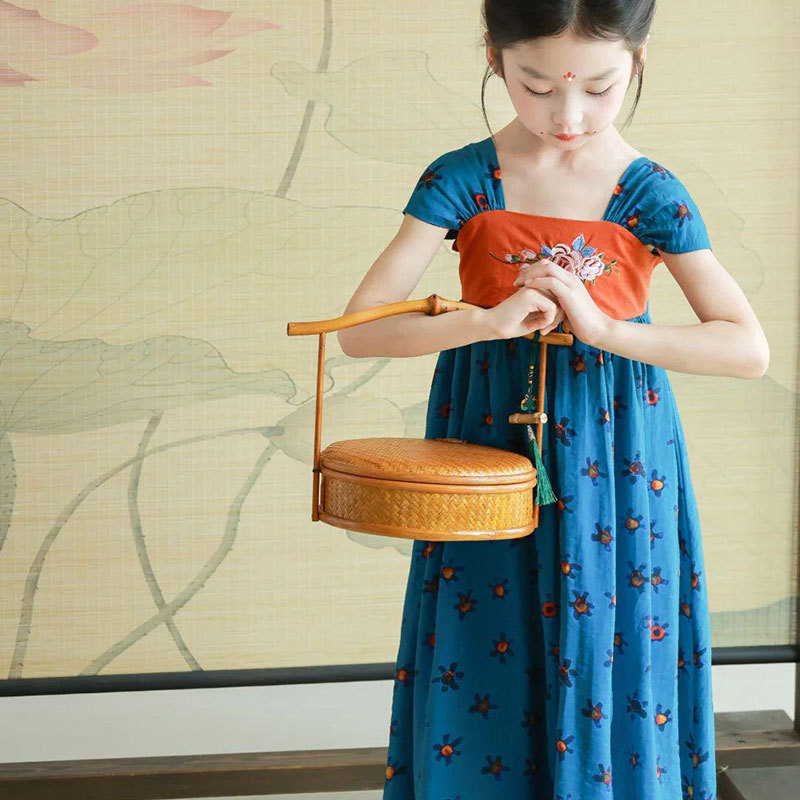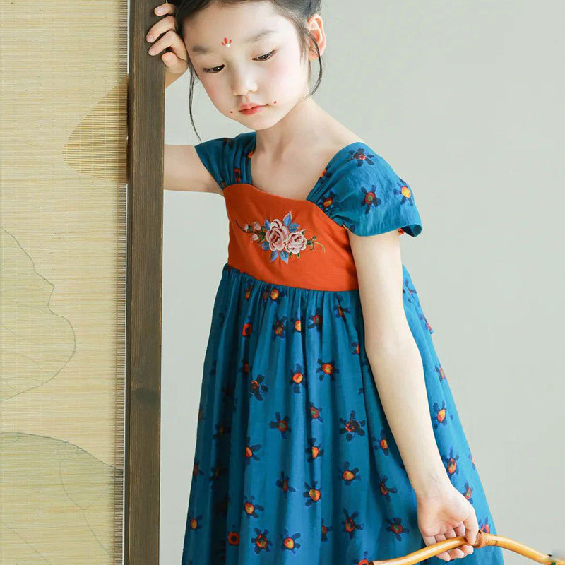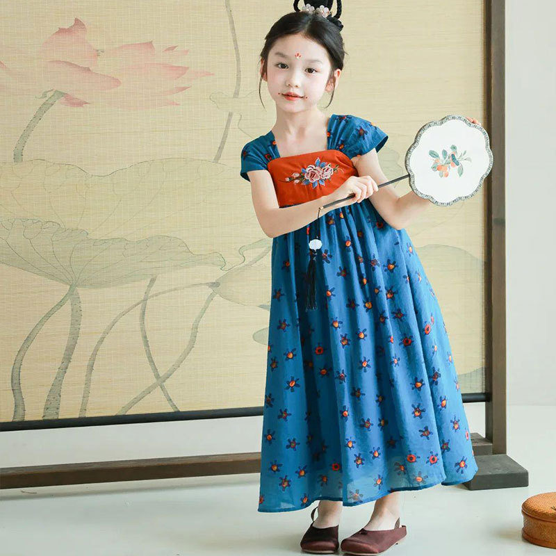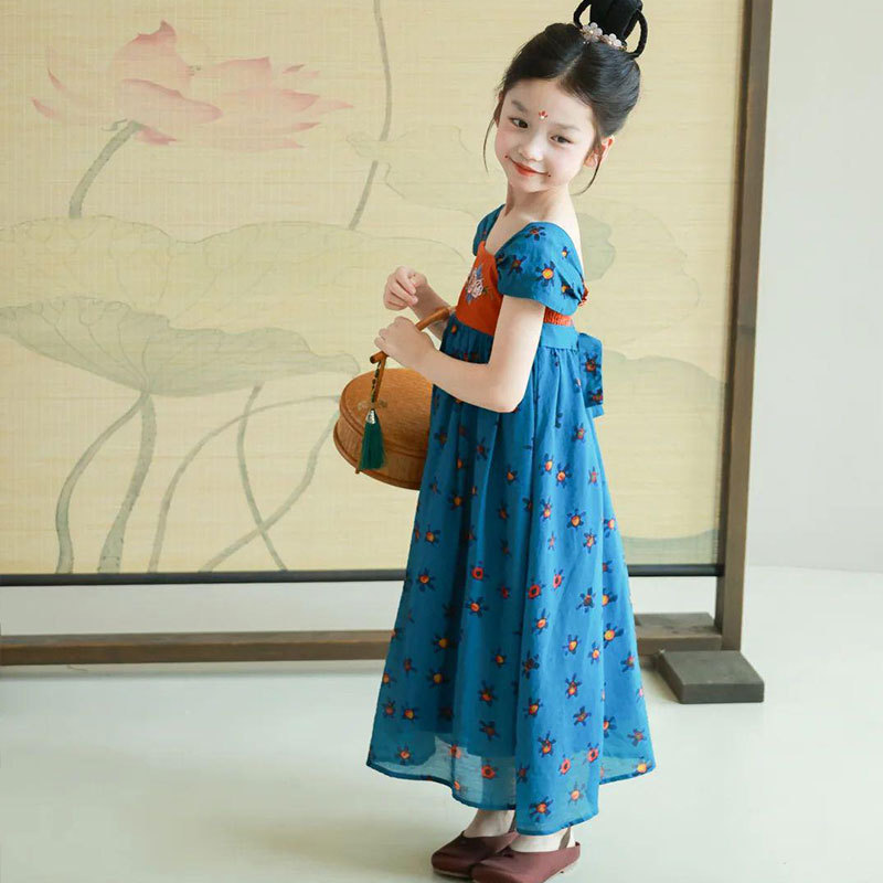 소녀 청삼 어린이 여름 2025 새 푸른 꽃 청삼 중국식 원피스 한후 폭발 기질스토어 가기