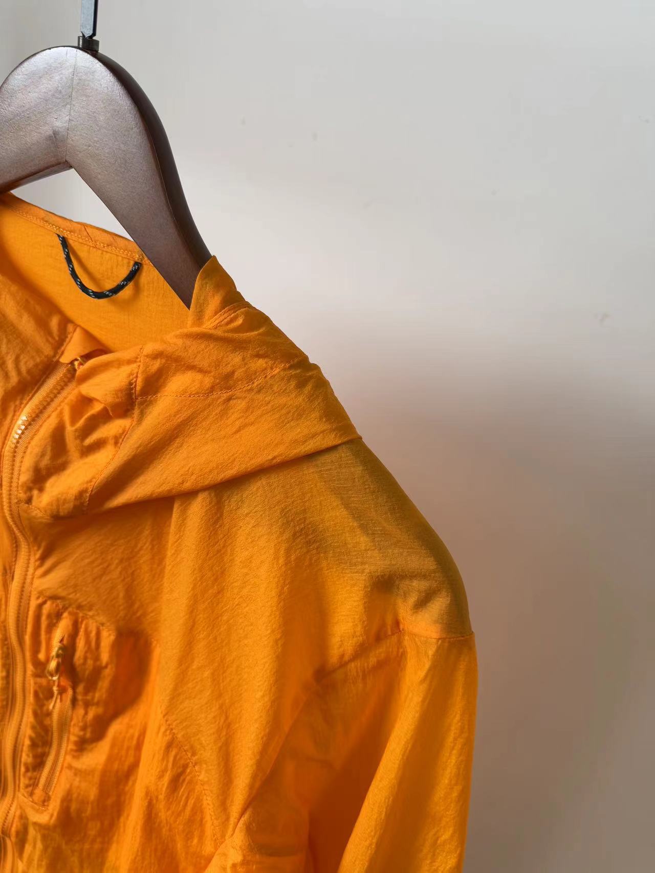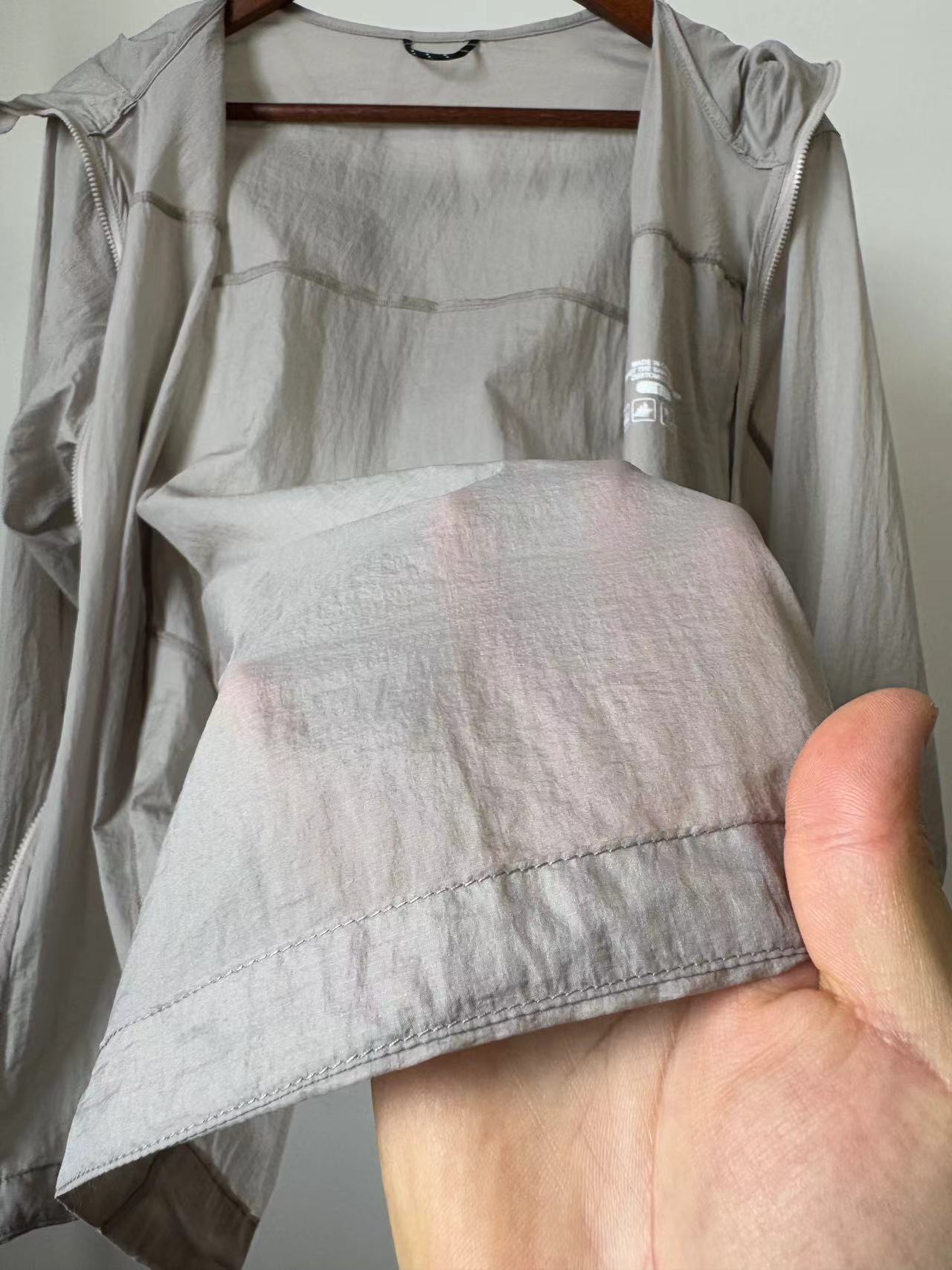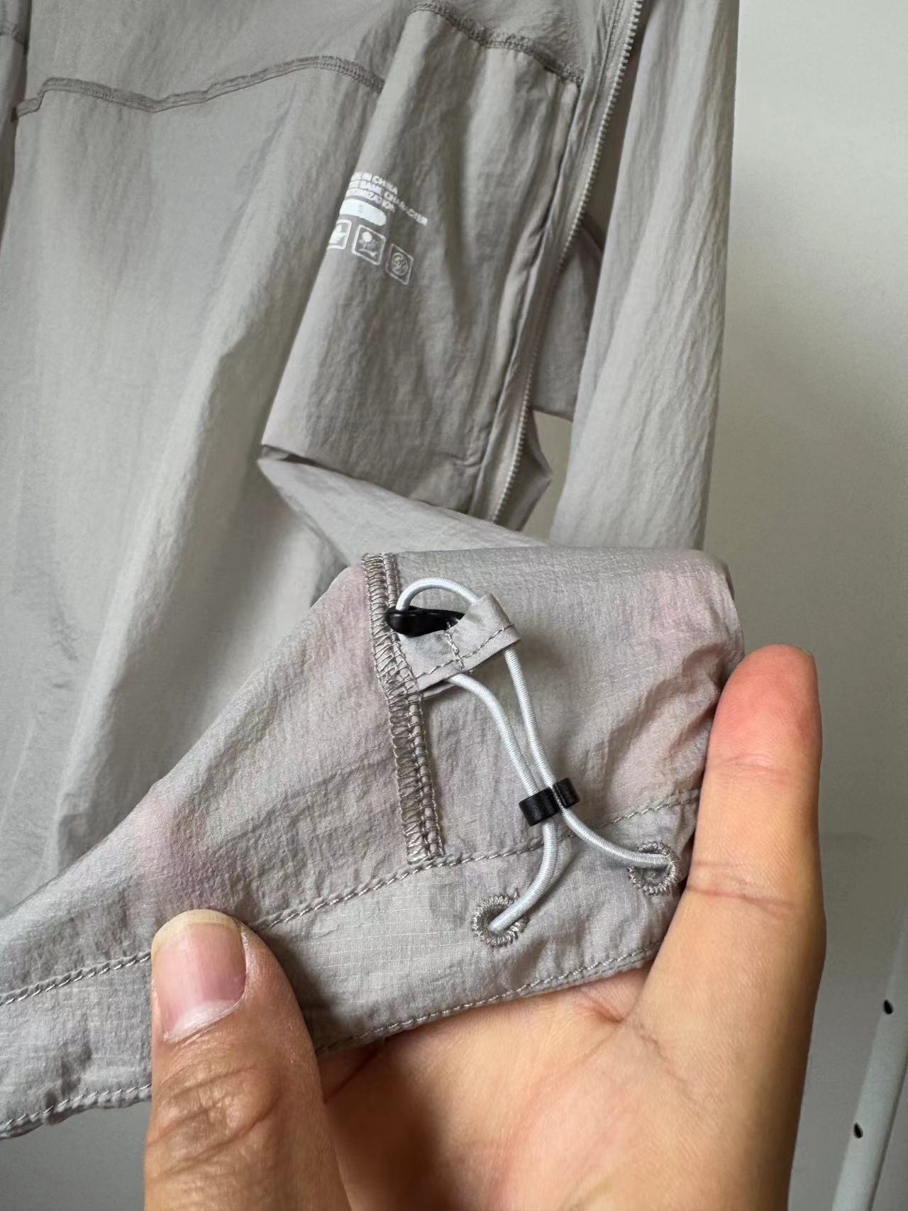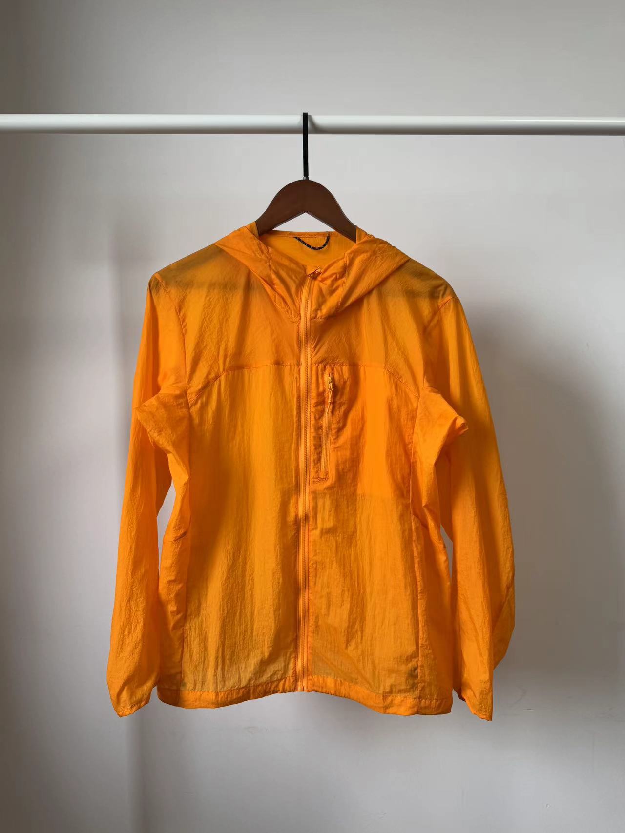轻薄具有的结构:可调节兜帽、拉链、下摆双侧调节扣,可收纳于自身胸袋,因此可轻松放入背包或挂在带上。