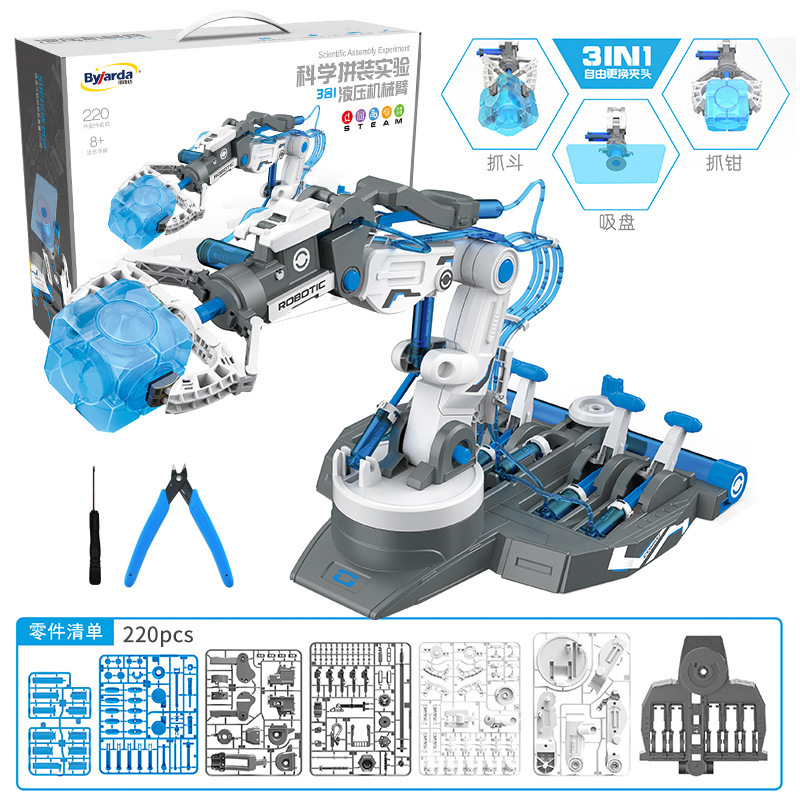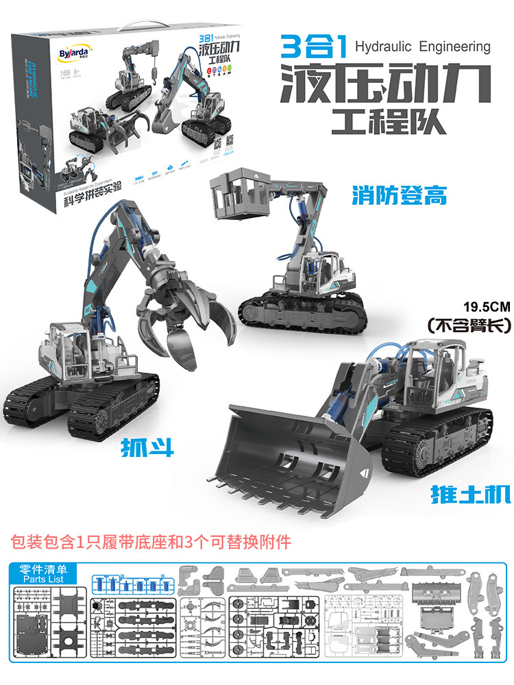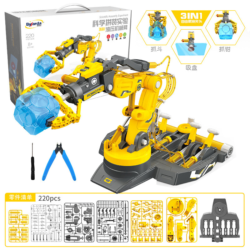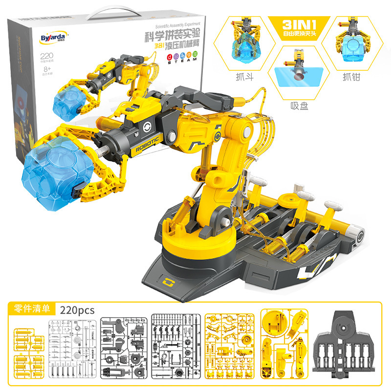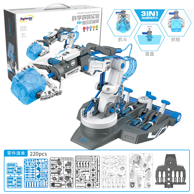 功能描述:自拼装STEAM玩具:220个配件3合1功能可自由变换工作头:抓钳、抓斗、吸盘,不需要电池与马达