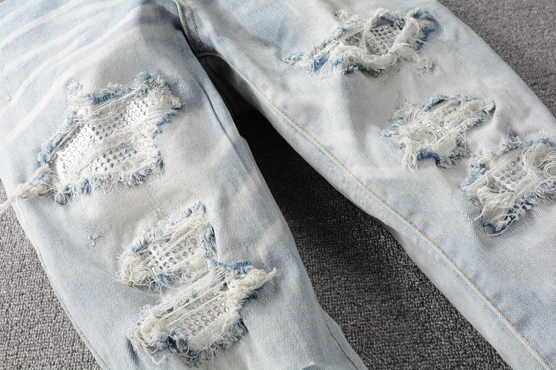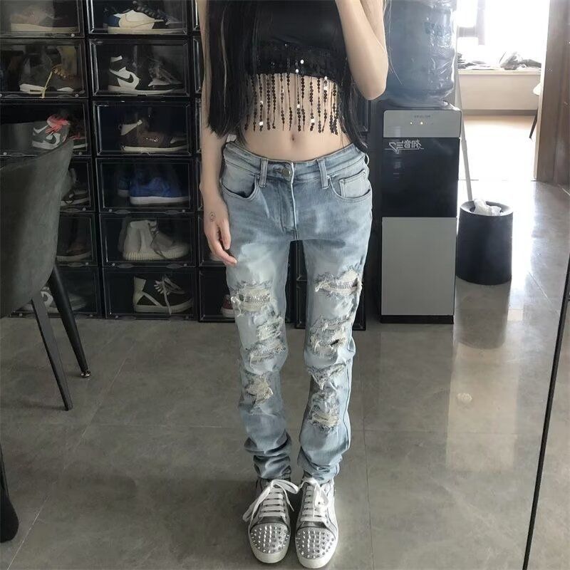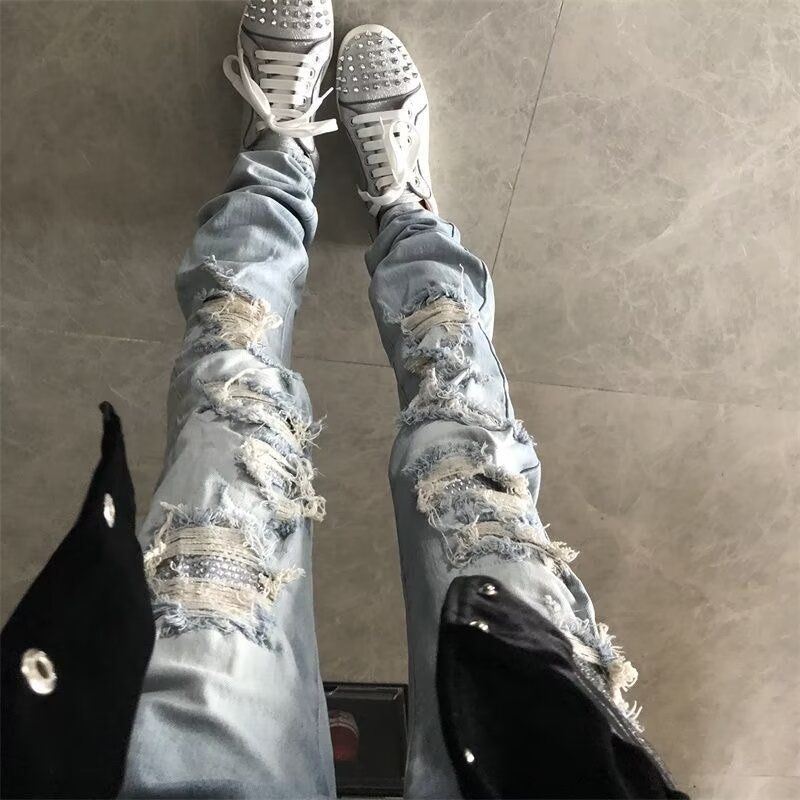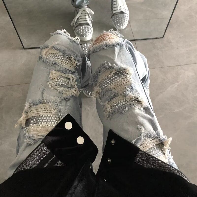 2025년 새로운 트렌디 브랜드 핫 다이아몬드 찢어진 패치 디자인 남성용 하이 스트리트 워싱 슬림핏 청바지