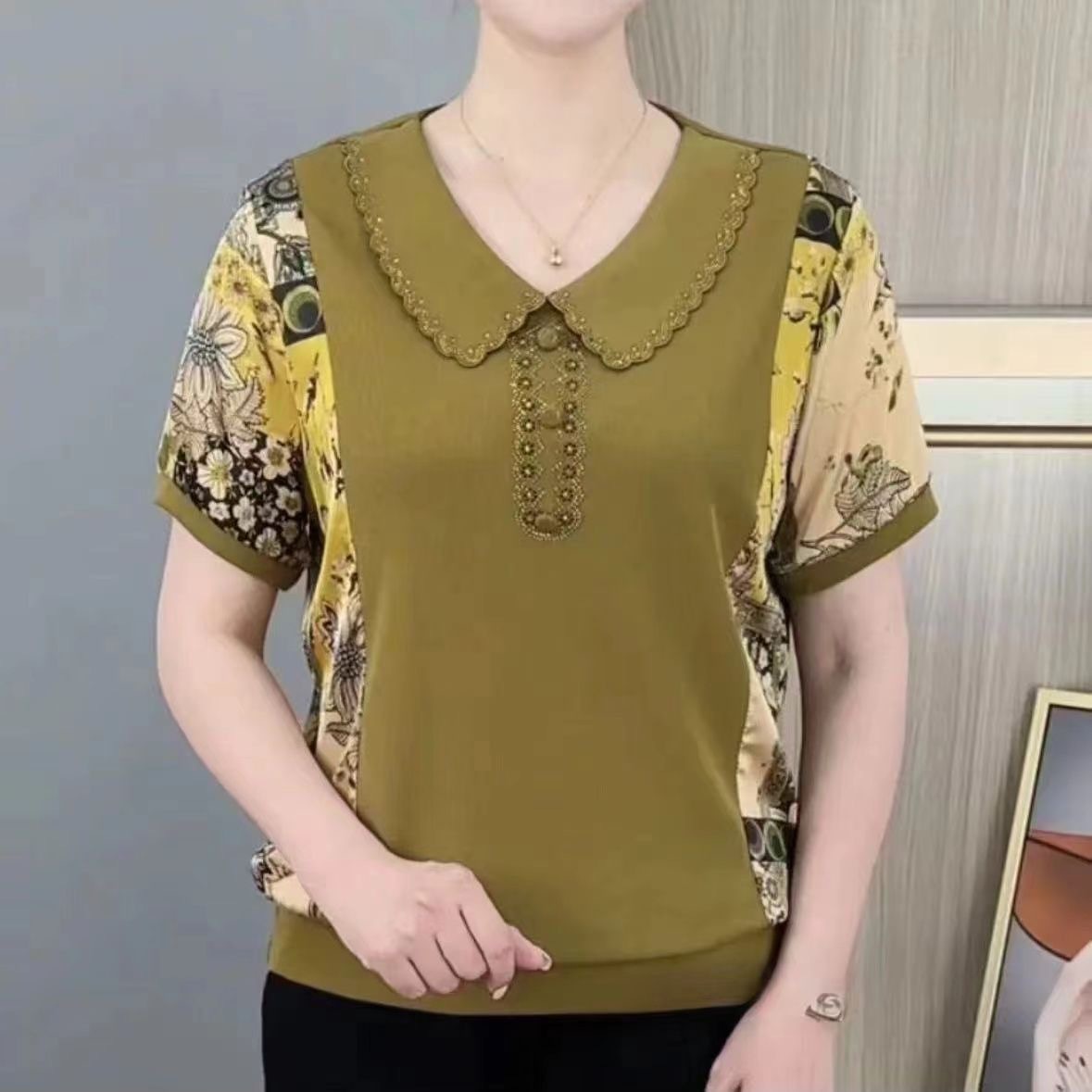 가을 신상 중년 여성 패셔너블 스타일 스플리싱 바텀 셔츠 어머니복 슬림하고 활용도가 높은 반팔 티셔츠