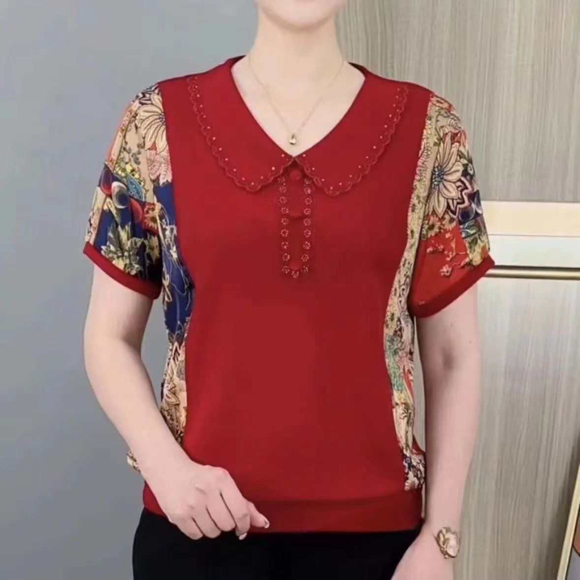 가을 신상 중년 여성 패셔너블 스타일 스플리싱 바텀 셔츠 어머니복 슬림하고 활용도가 높은 반팔 티셔츠스토어 가기
