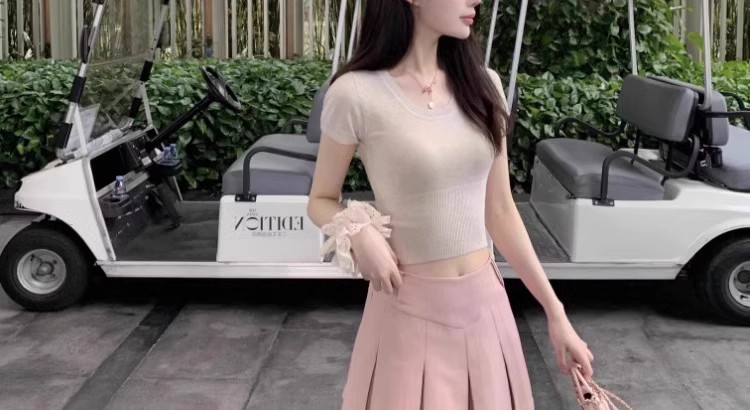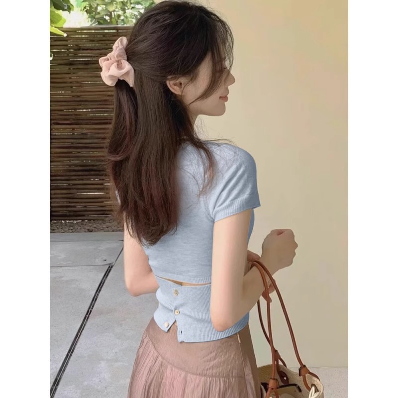 2025 블루 니트 백리스 슬림 핏 숄더 반팔 여성용 티셔츠 여름 세련된 달콤하고 매운 요정 쇼트 탑스토어 가기