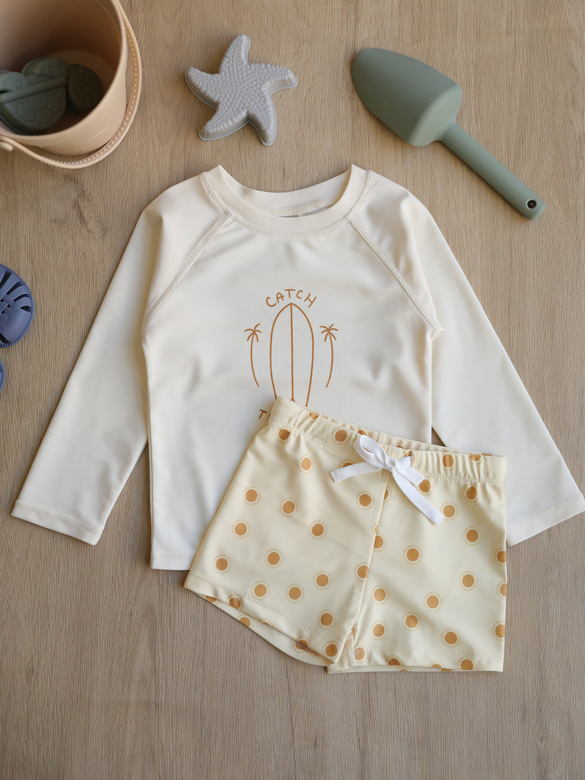• 소년 원피스 수영복 바스락거리는 노란 태양