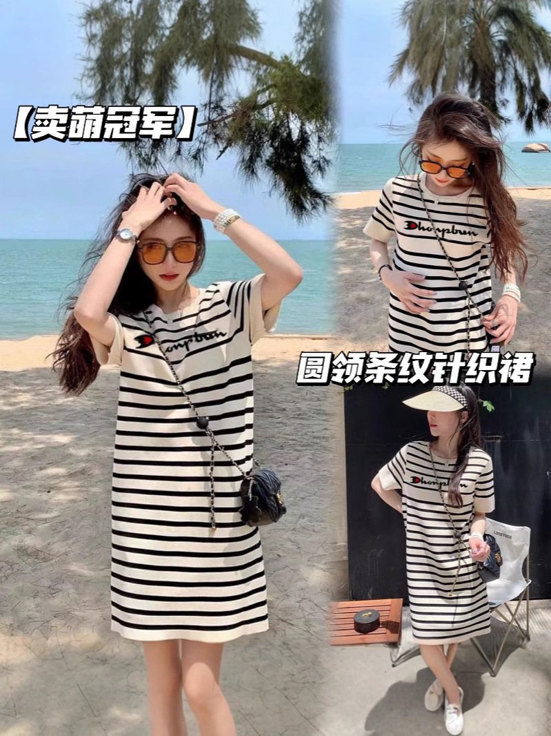 귀여운 챔피언 크루 넥 스트라이프 니트 원피스 여성의 새로운 여름 한국 스타일 코튼 편안한 슬리밍 캐주얼 크루 넥 스트레이트 루즈스토어 가기