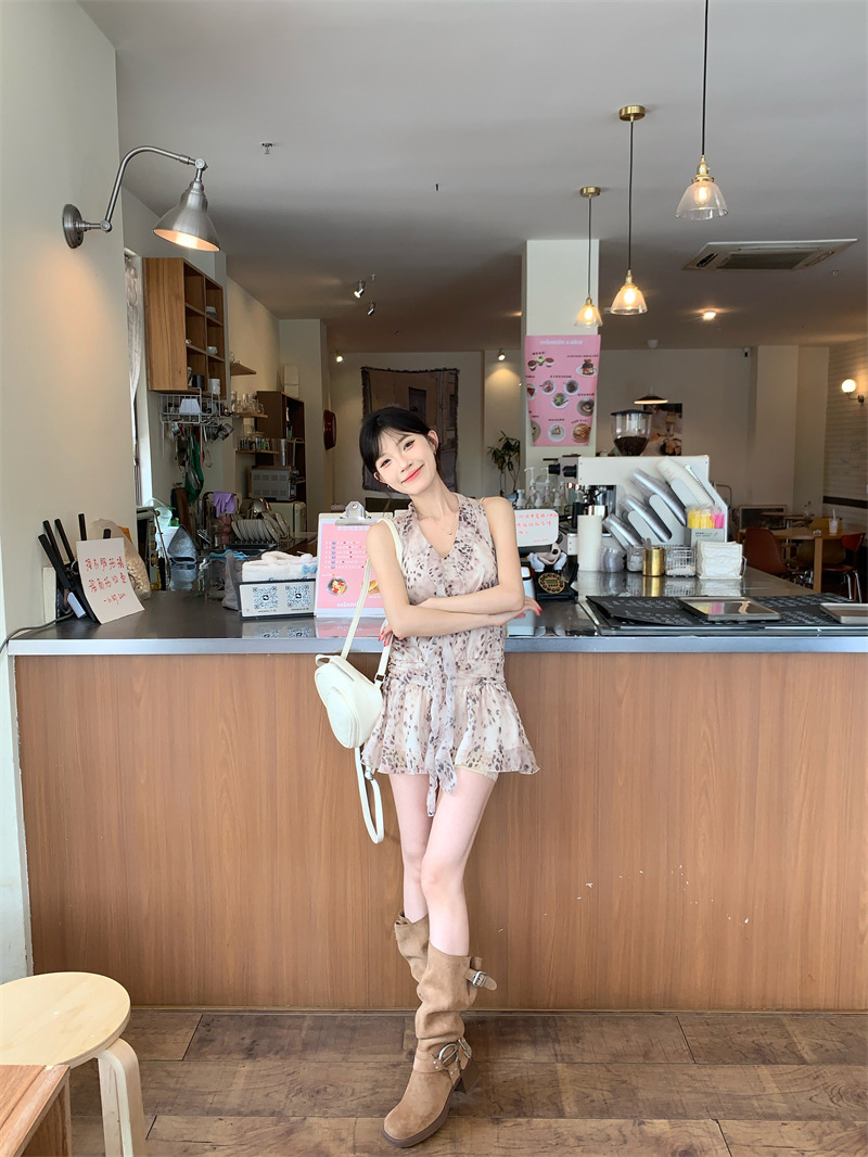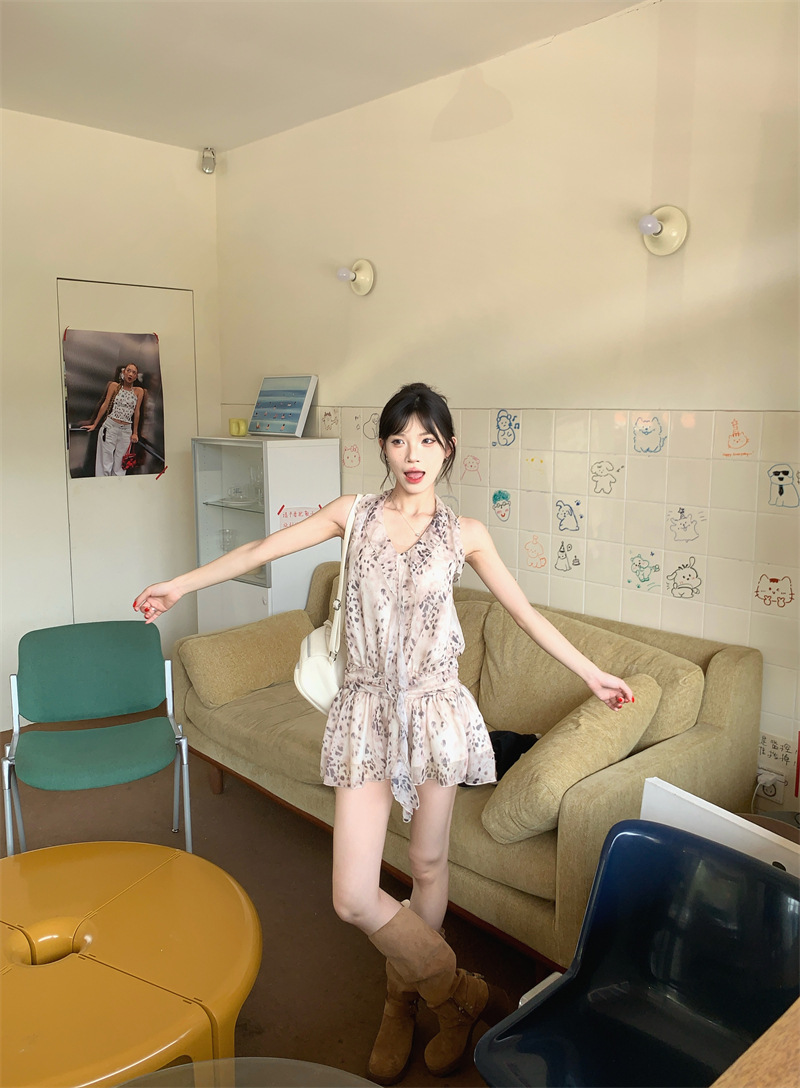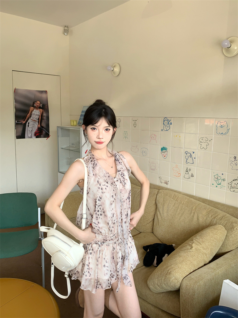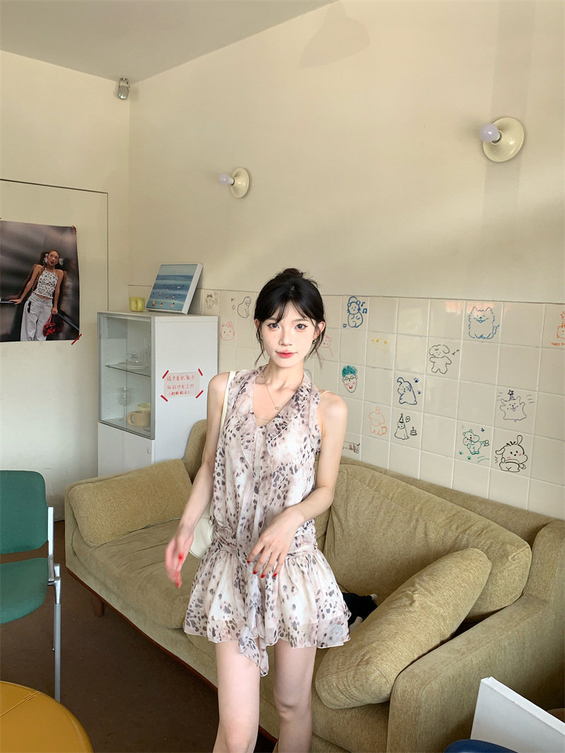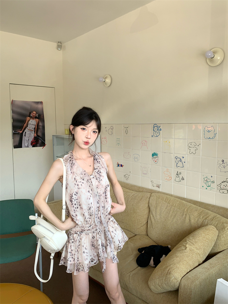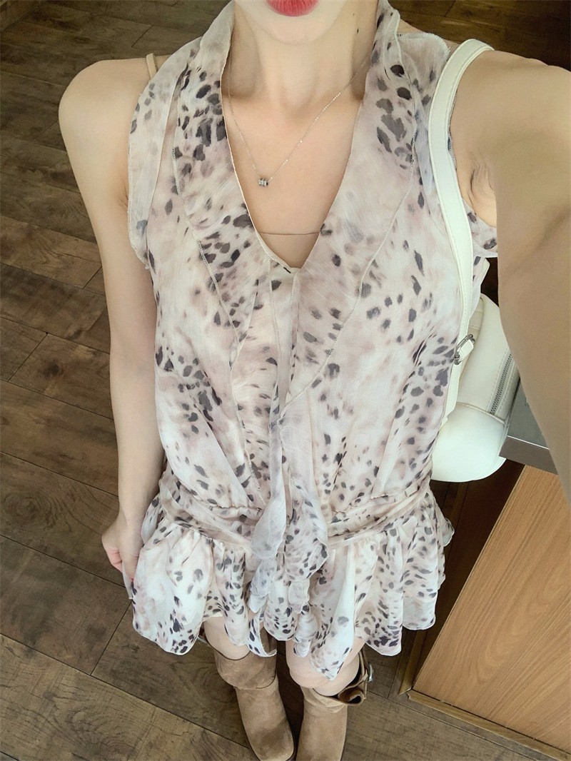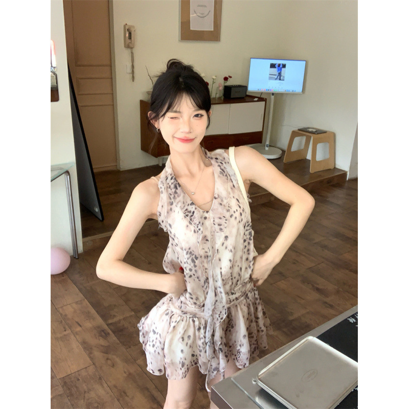 2025 여름 새로운 달콤한 로맨틱 세련된 맞춤형 레트로 프랑스 스타일 교수형 넥 레이스 업 레오파드 웨이스트 쉬폰 셔츠