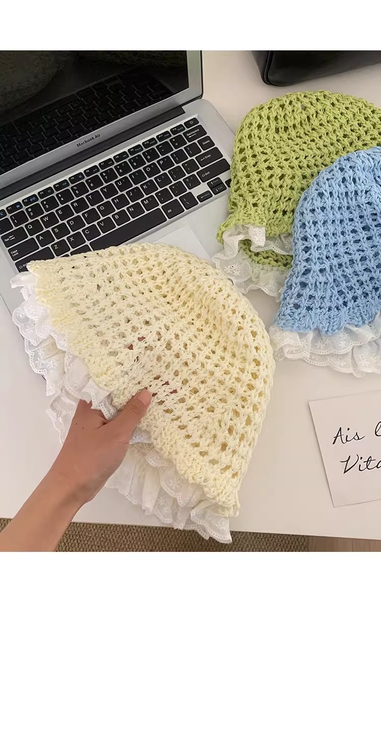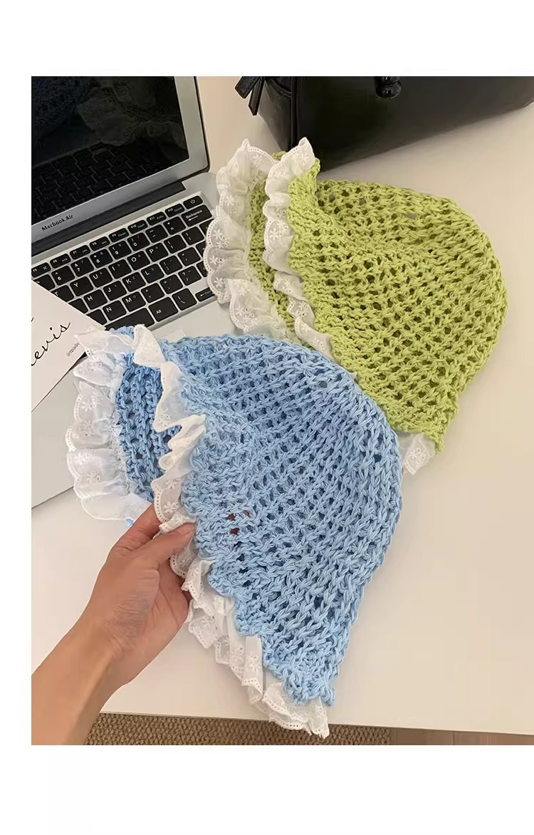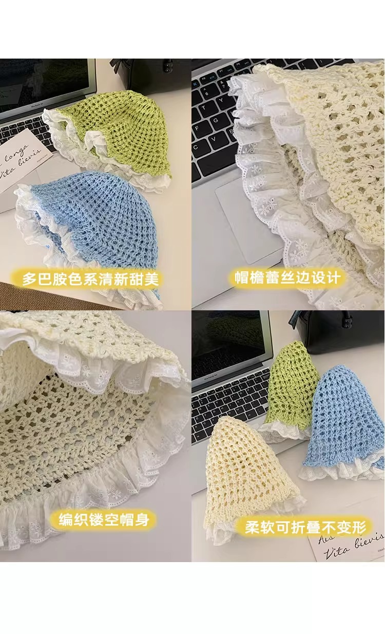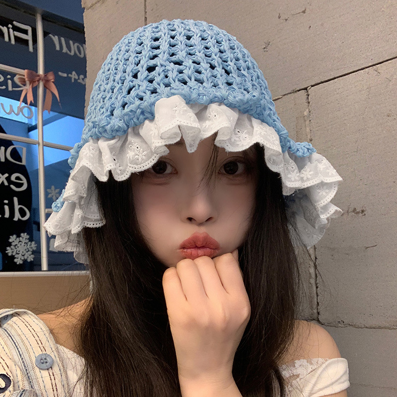 레이스 레이스 블루 할로우 어부 모자 여자 여름 한국 스타일 올 매치 얼굴 커버 버킷 모자-작은 태양 보호 모자