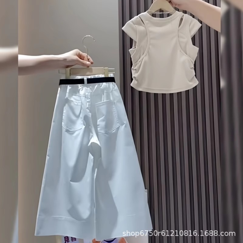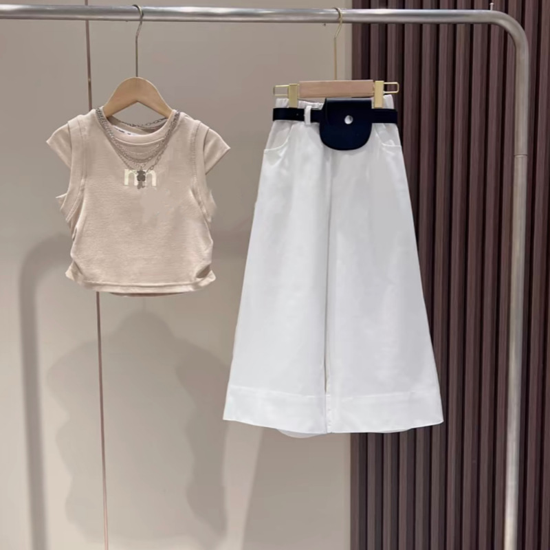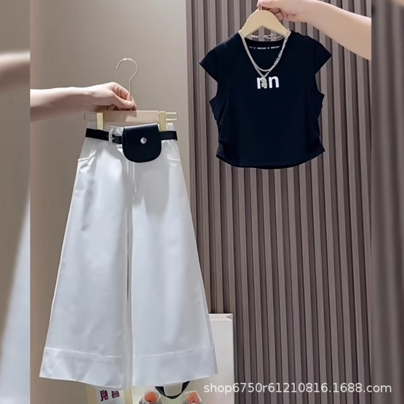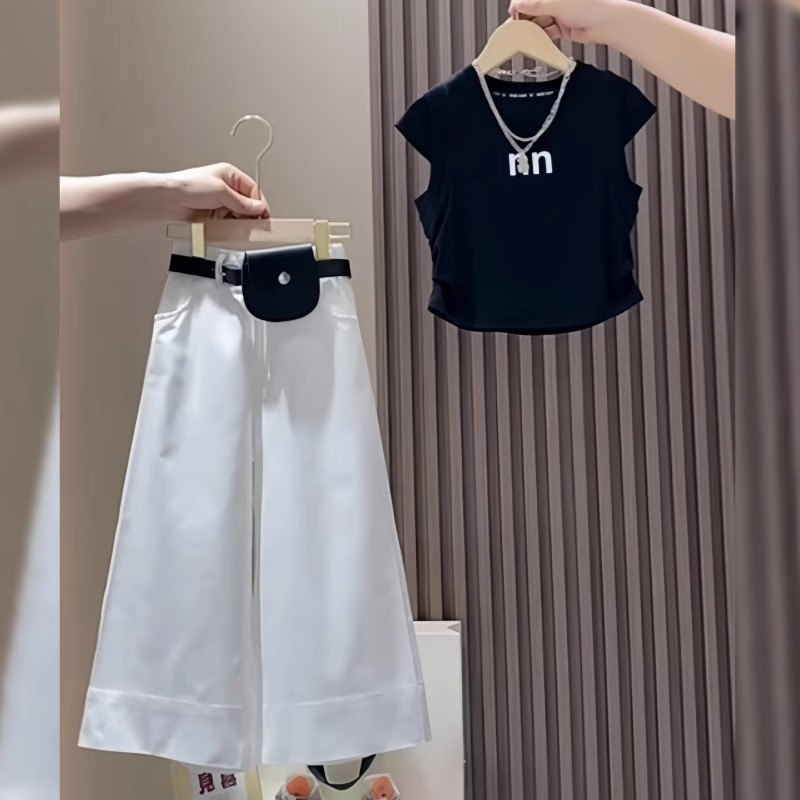 여아 알파벳 반팔 티셔츠 세트 여름 신작 한국식 중대형 아동용 흰색 와이드 팬츠 투피스 세트 트렌디